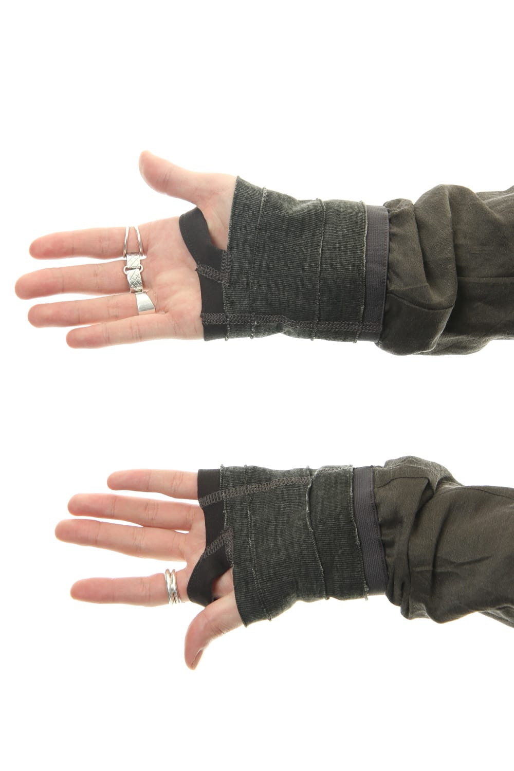 背中に大きくタックを取る事で背面にボリュームをつけたパターンバランスで制作しています。袖口はバンテージ風のデザインサムホール仕様。
