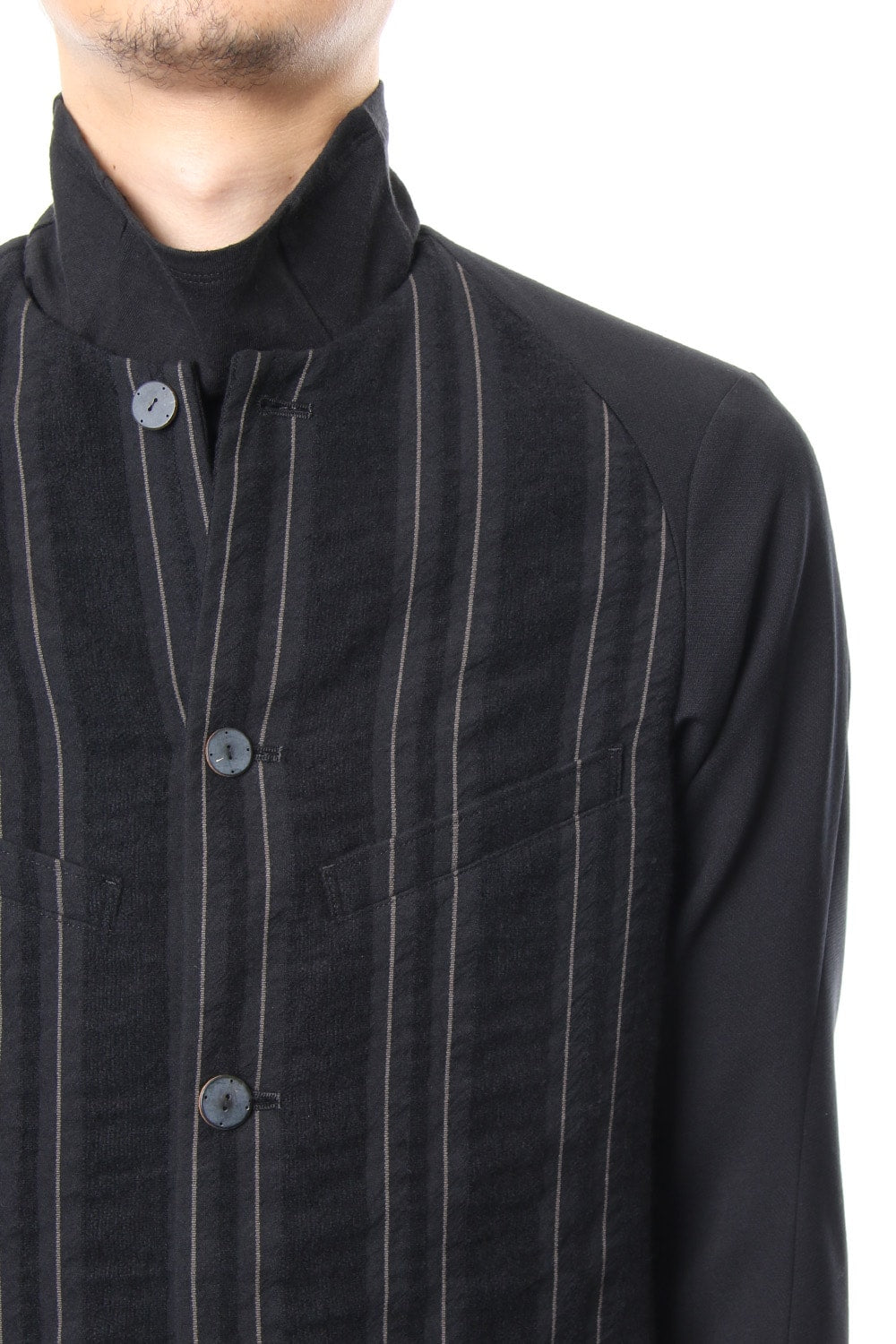 表生地はイタリアの名門、Faliero Sarti社の生地を採用した袖をウールの生地と切り替えたノーカラージャケット。本来はボーダーですが、ストライプ柄として使っています。 ストライプのラインは織りを変えることによって表現しています。袖のパターンは今季多用されているラグランスリーブ。 サイズ感はレギュラーフィットとなっています。