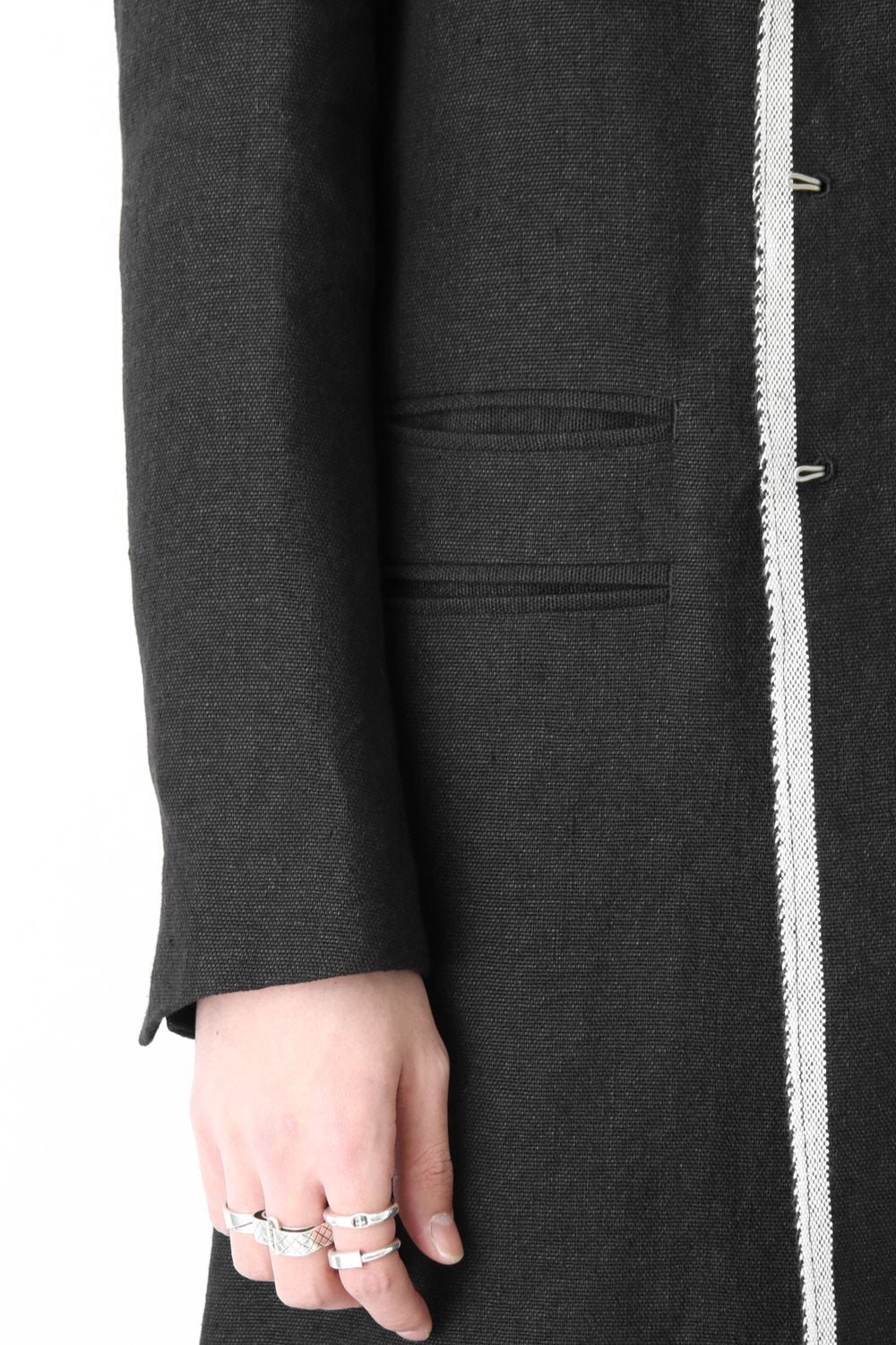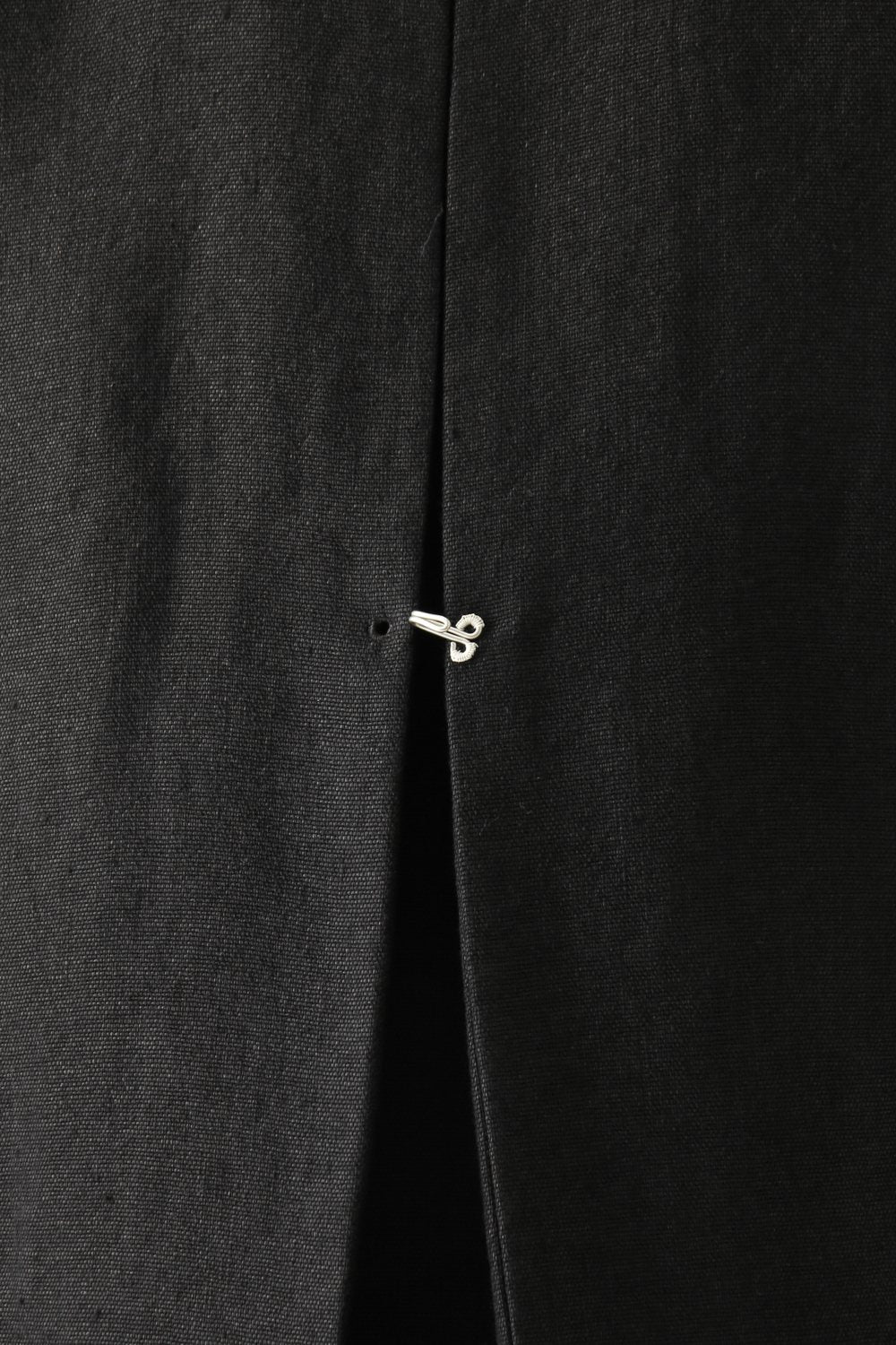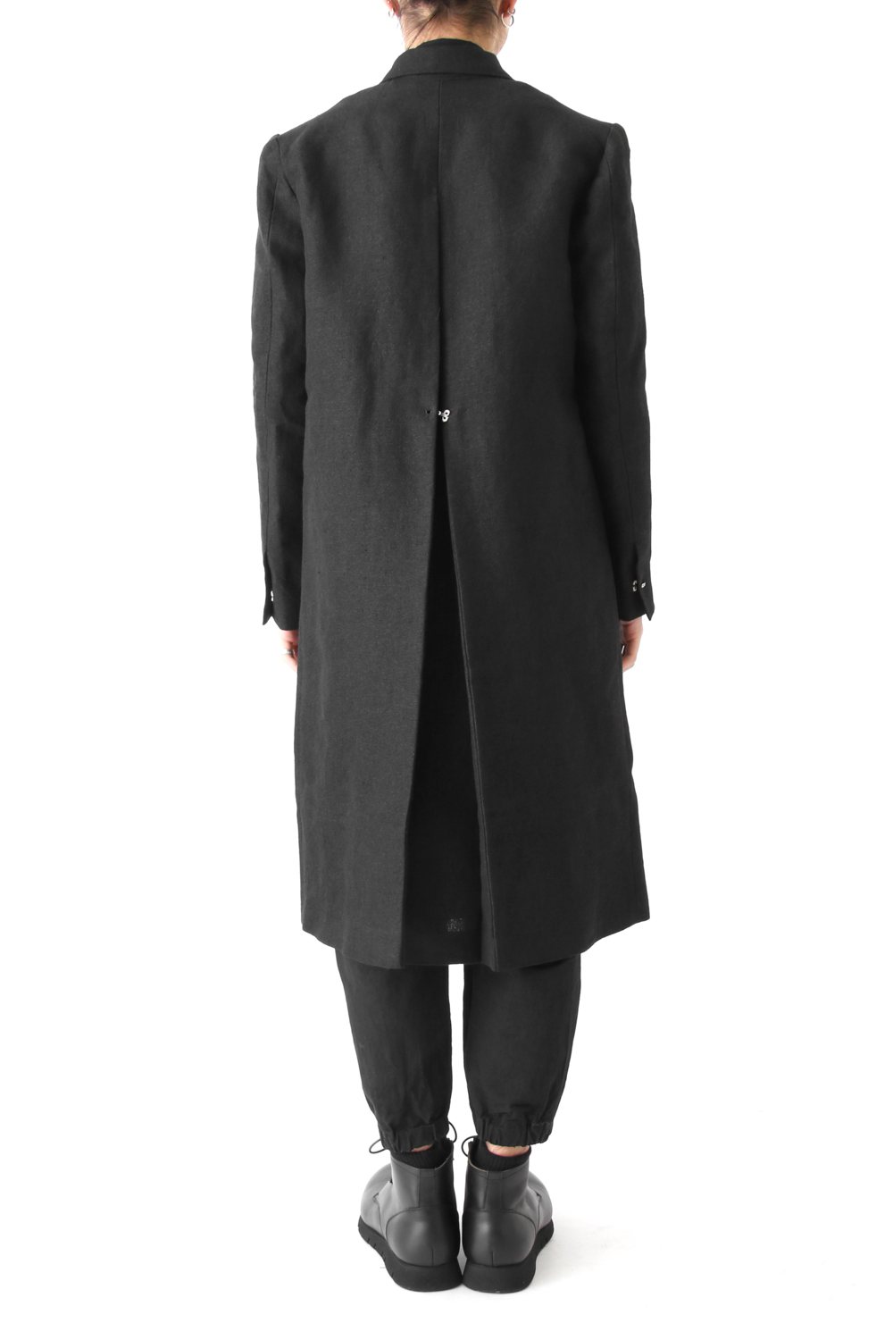 シャトル織機で織られたセルビッチ 付きの和紙リネングログランを使用したロングコートです。和紙特有のシャリ感のある素材感、前開き、袖口はホック留め、前立てにセルビッチ部分を使用してデザインの一部として使用しています。 後ろ身頃のボックスプリーツは大き目に取られ、ホックで止めていただくことによってバックシルエットが変化します。