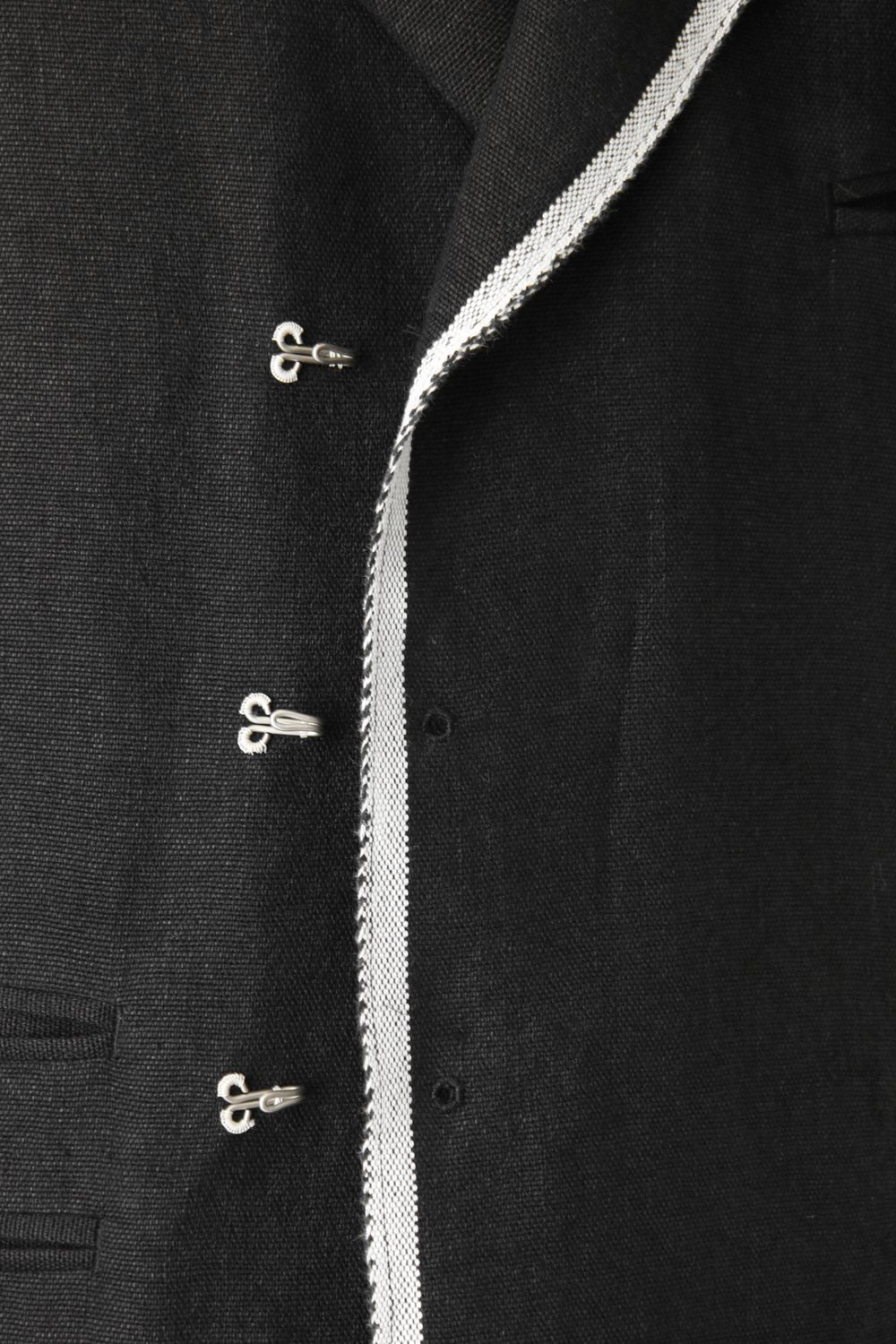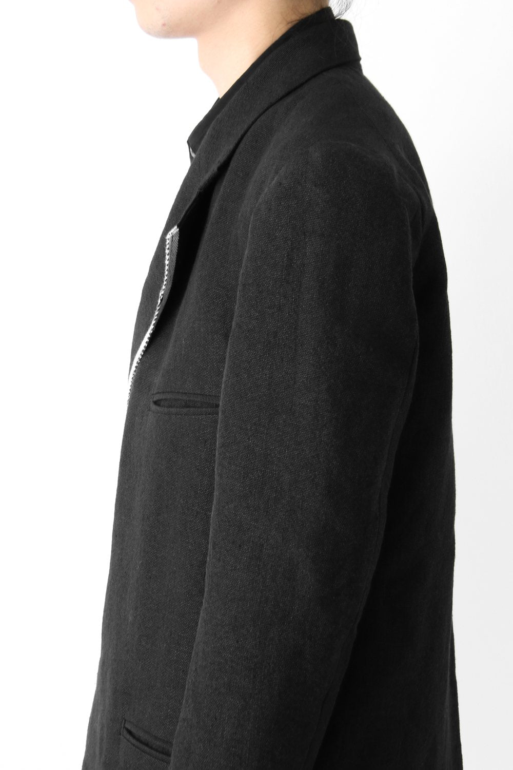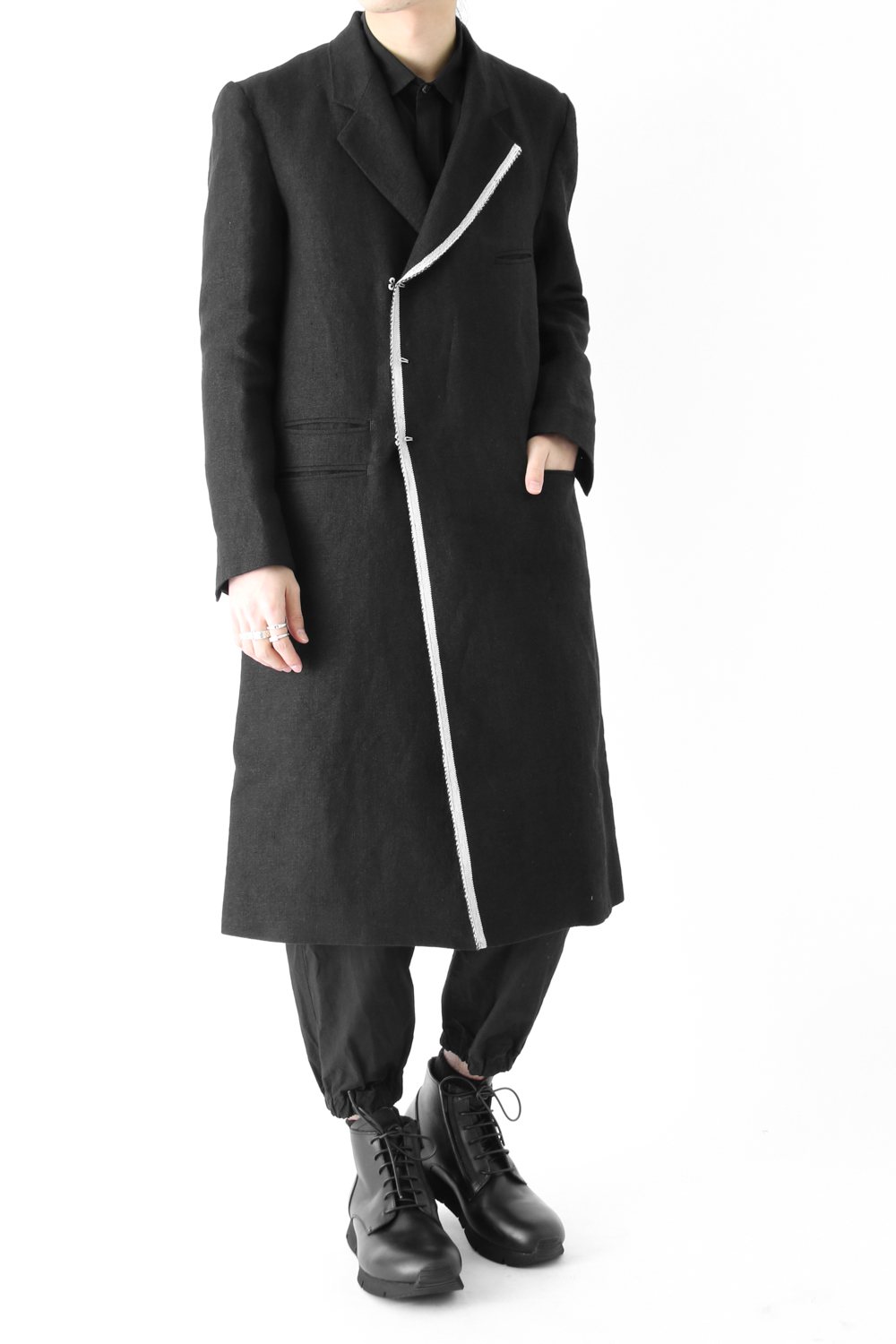 シャトル織機で織られたセルビッチ 付きの和紙リネングログランを使用したロングコートです。和紙特有のシャリ感のある素材感、前開き、袖口はホック留め、前立てにセルビッチ部分を使用してデザインの一部として使用しています。 後ろ身頃のボックスプリーツは大き目に取られ、ホックで止めていただくことによってバックシルエットが変化します。