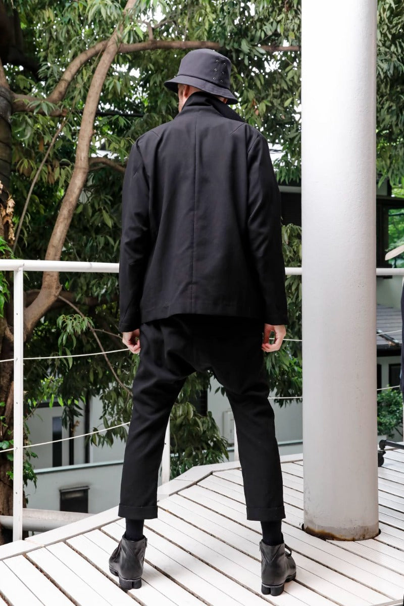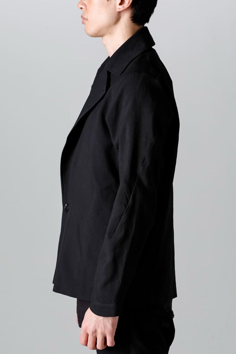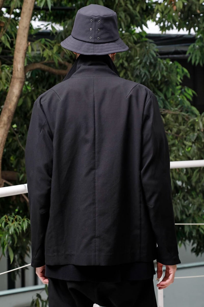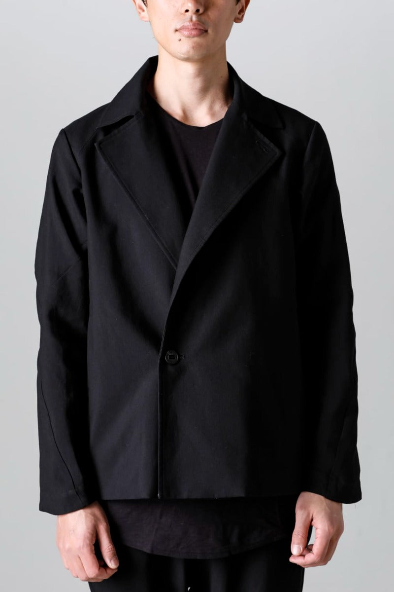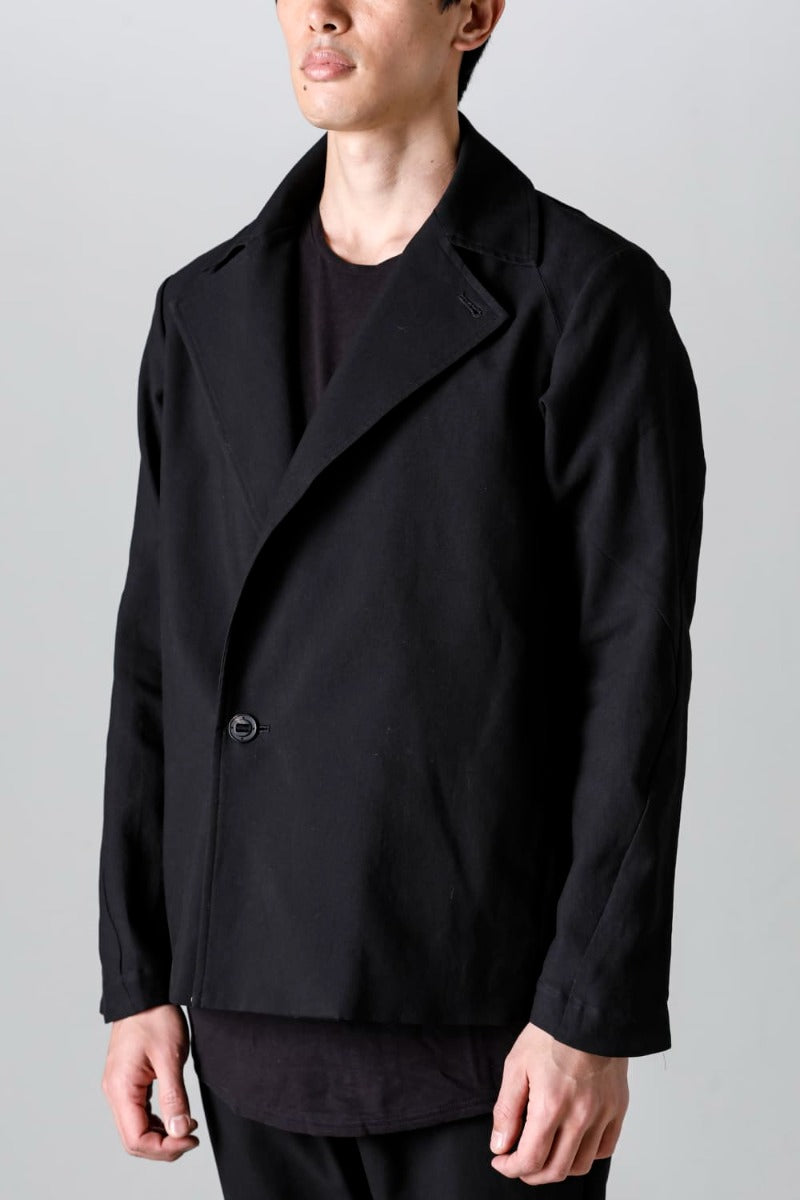 クラシックなデザインに立体的な袖のパターンを設計したショート丈のジャケット。ベースはダブルジャケットのような位置に一つボタンを配したノッチドラペルジャケットのデザインで、襟元のボタンと閉めればスタンドカラージャケットのようにも着用できます。シルエットは程よくゆとりのあるレギュラーシルエットです。