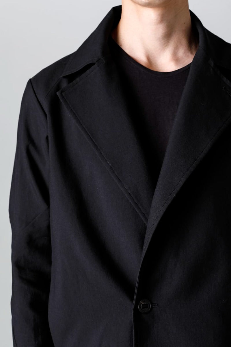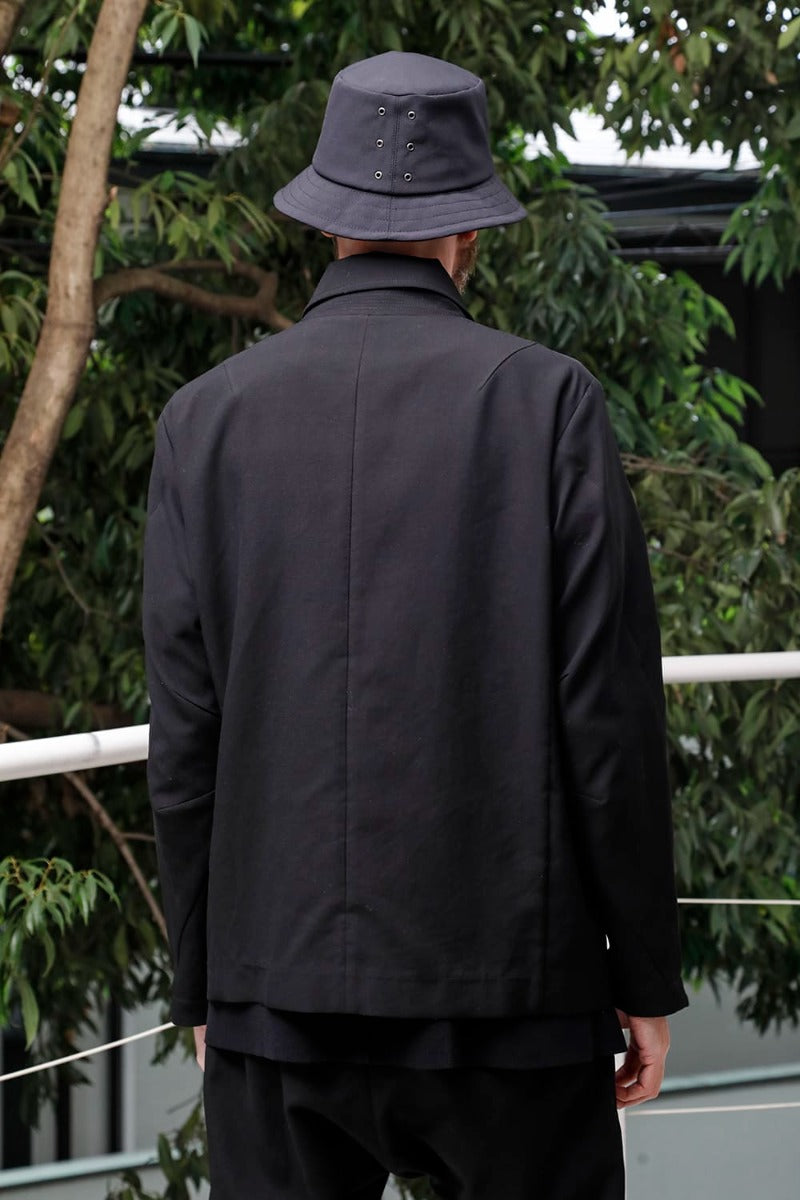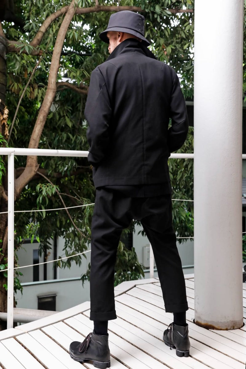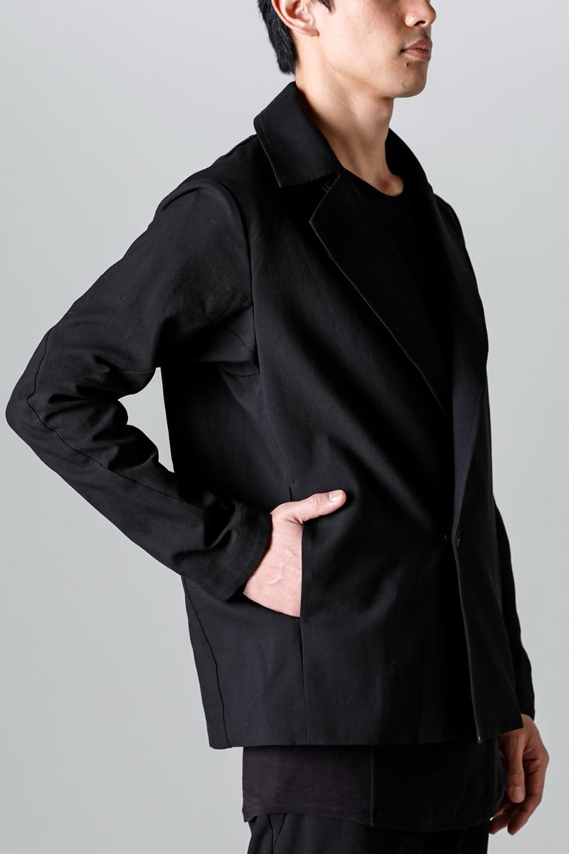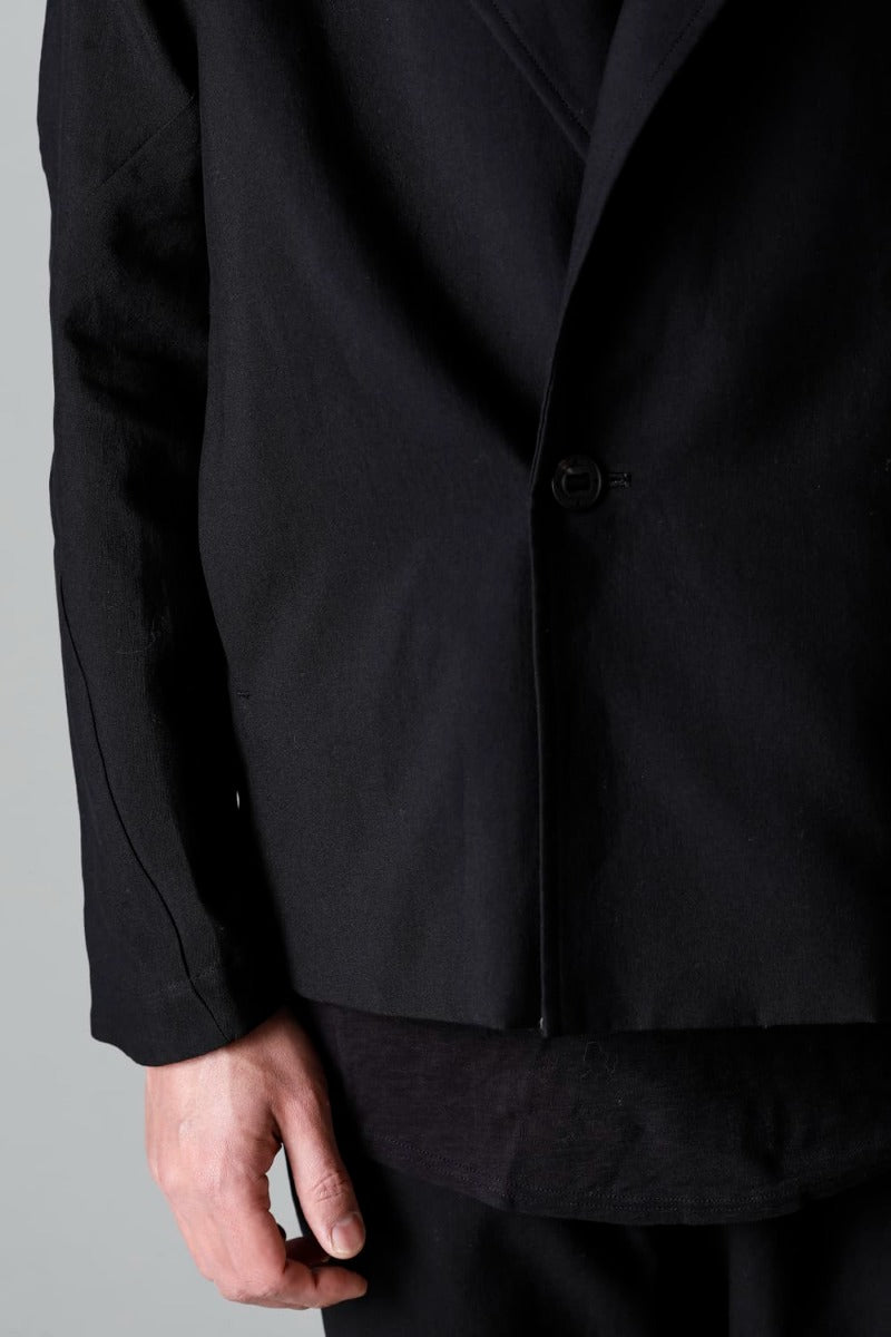 クラシックなデザインに立体的な袖のパターンを設計したショート丈のジャケット。ベースはダブルジャケットのような位置に一つボタンを配したノッチドラペルジャケットのデザインで、襟元のボタンと閉めればスタンドカラージャケットのようにも着用できます。シルエットは程よくゆとりのあるレギュラーシルエットです。