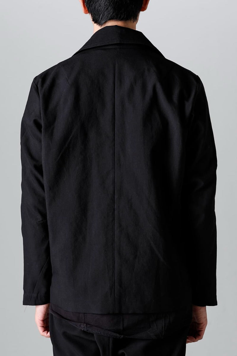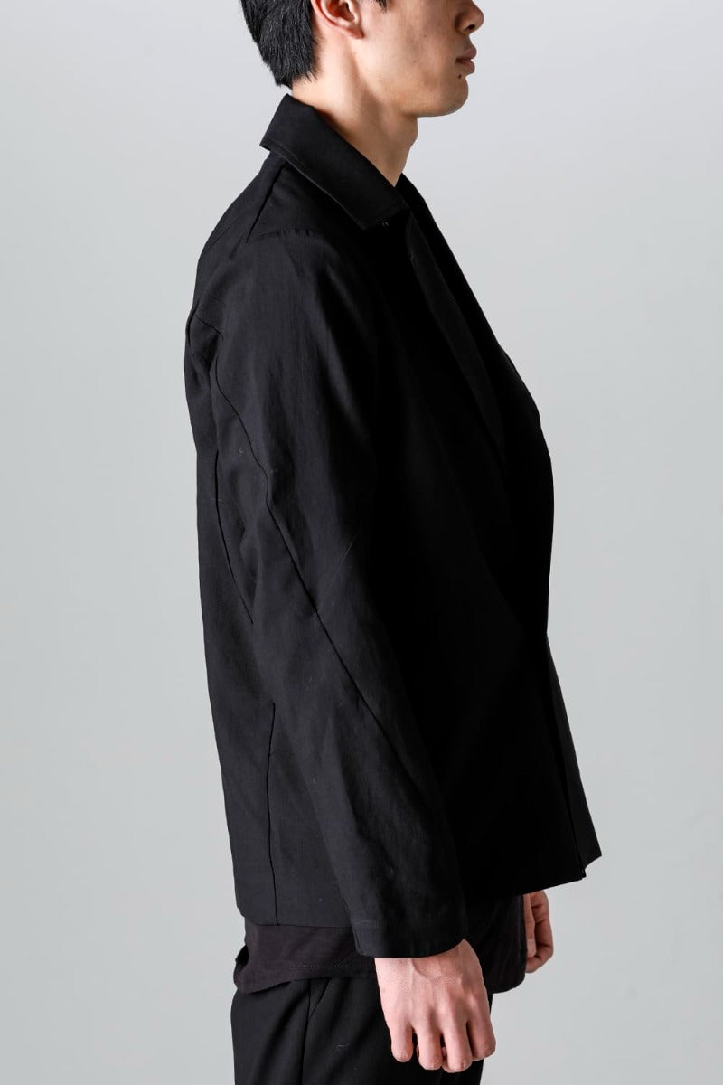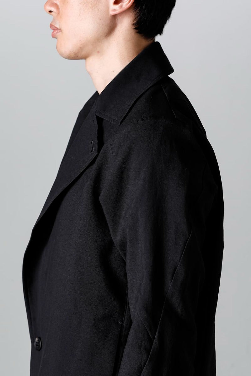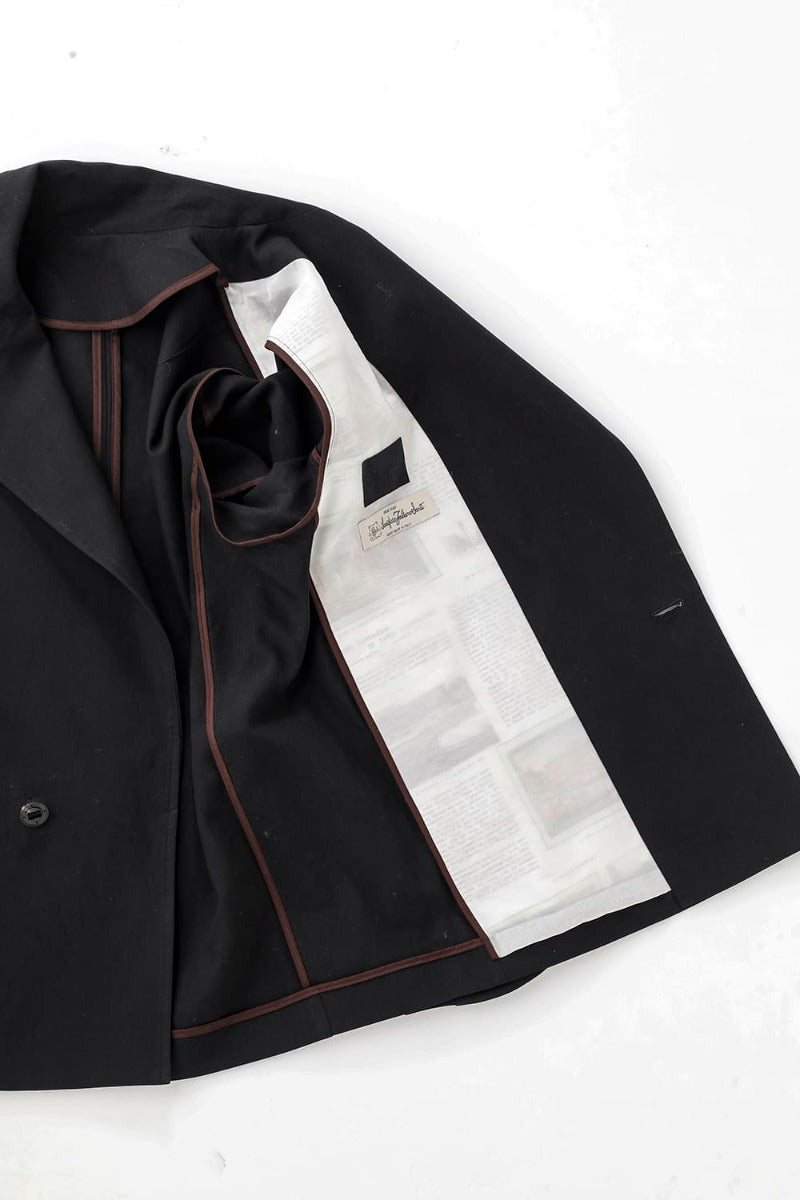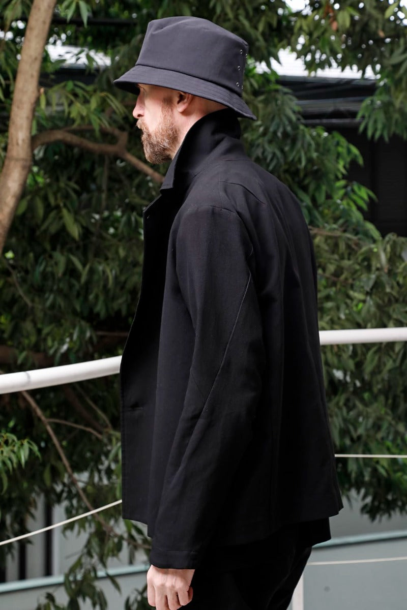 クラシックなデザインに立体的な袖のパターンを設計したショート丈のジャケット。ベースはダブルジャケットのような位置に一つボタンを配したノッチドラペルジャケットのデザインで、襟元のボタンと閉めればスタンドカラージャケットのようにも着用できます。シルエットは程よくゆとりのあるレギュラーシルエットです。