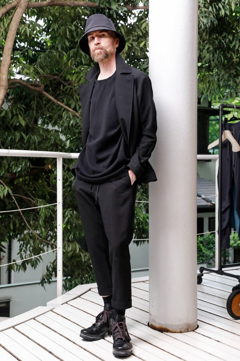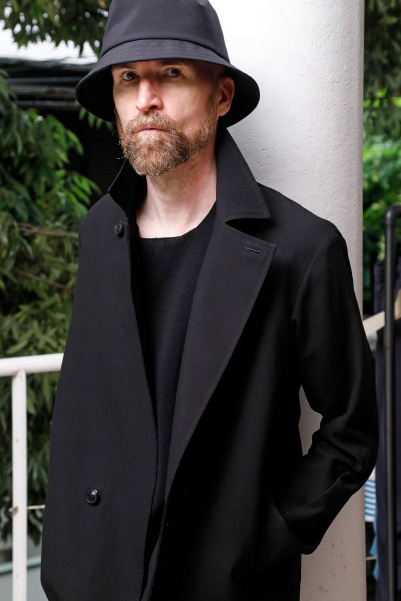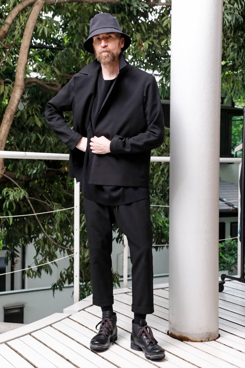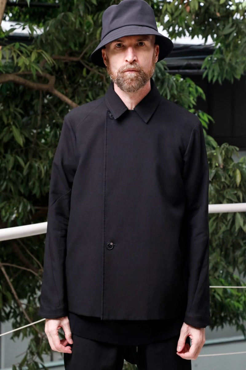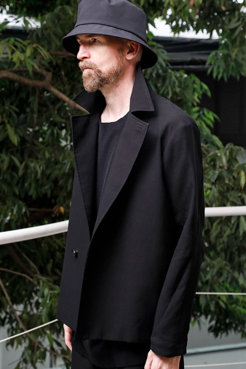 クラシックなデザインに立体的な袖のパターンを設計したショート丈のジャケット。ベースはダブルジャケットのような位置に一つボタンを配したノッチドラペルジャケットのデザインで、襟元のボタンと閉めればスタンドカラージャケットのようにも着用できます。シルエットは程よくゆとりのあるレギュラーシルエットです。
