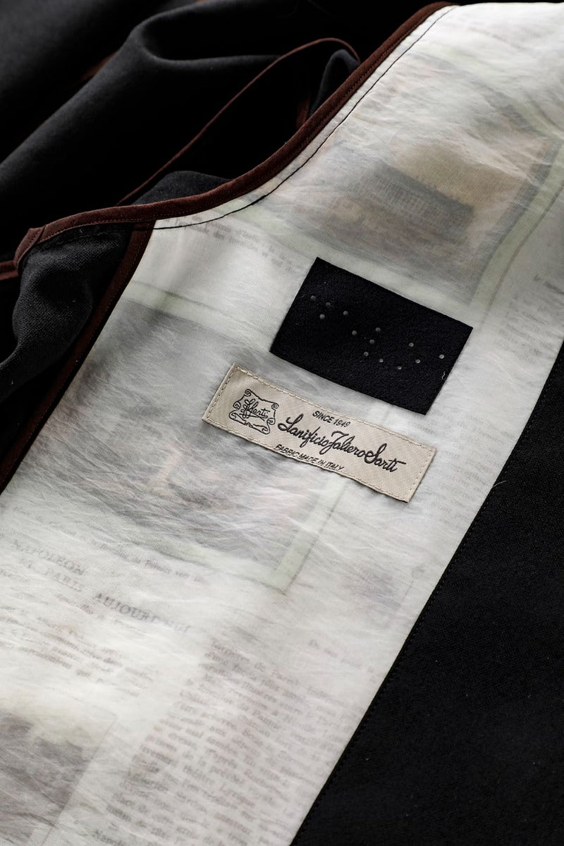 表生地はイタリア・Faliero Sarti(ファリエロサルティ) 社で強撚したコットン糸を使って高密度に織り上げた生地を制作。生地のきめが細かく、手触りは滑らかでドライタッチで適度な張りのあるタフな質感とウールのような雰囲気を併せ持った生地です。厚みとしてはシャツ生地よりも少し厚みのある程度で、ジャケットに使う生地にしては薄手です。