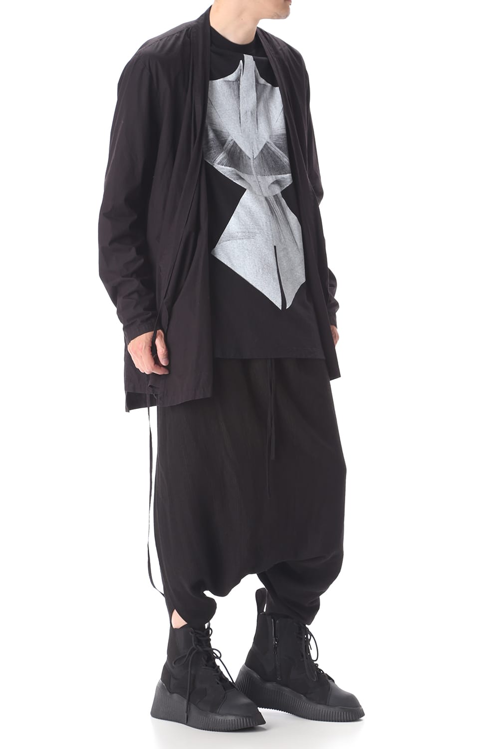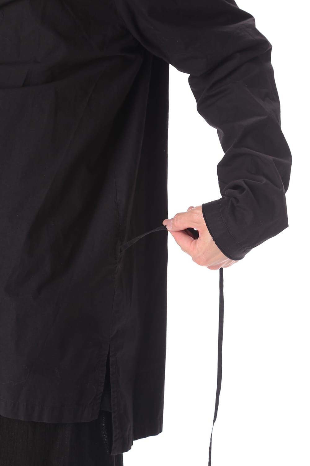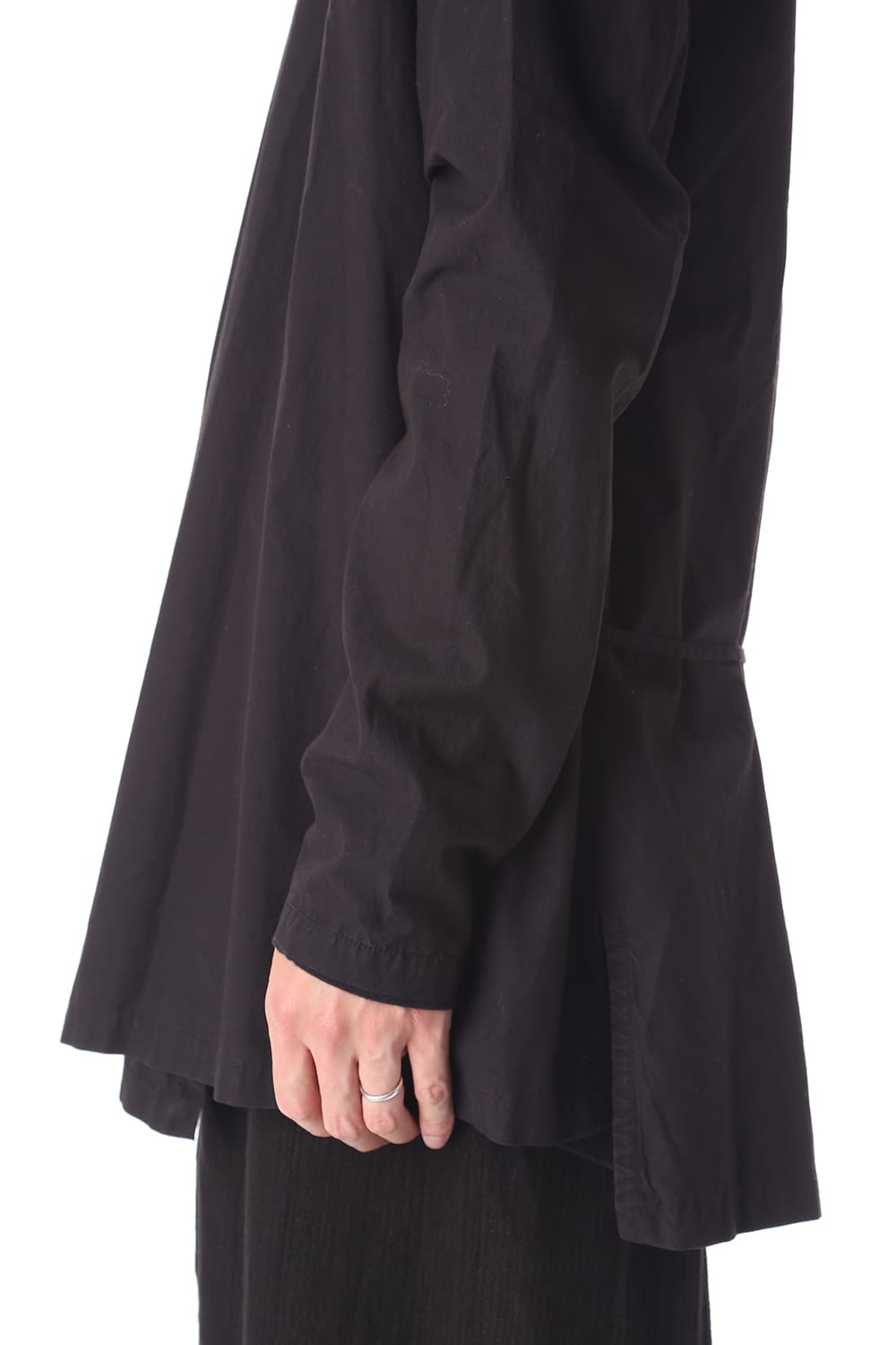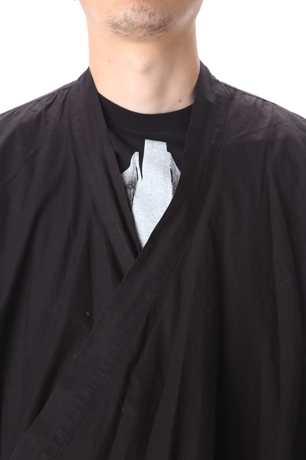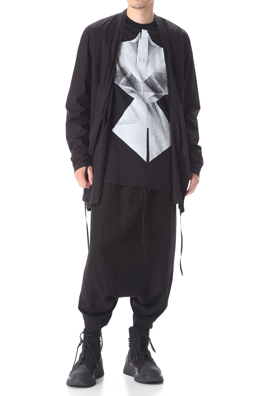 腰部分に配されたコードを結んでいただくことによって着物のようなシルエットに、結ばず垂らすことでカーディガンのようにも着用していただける作品です。