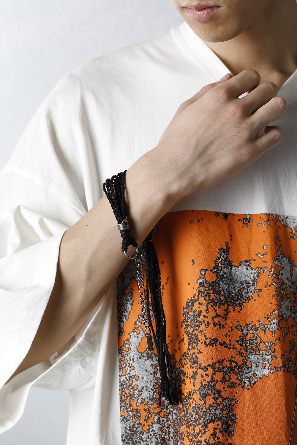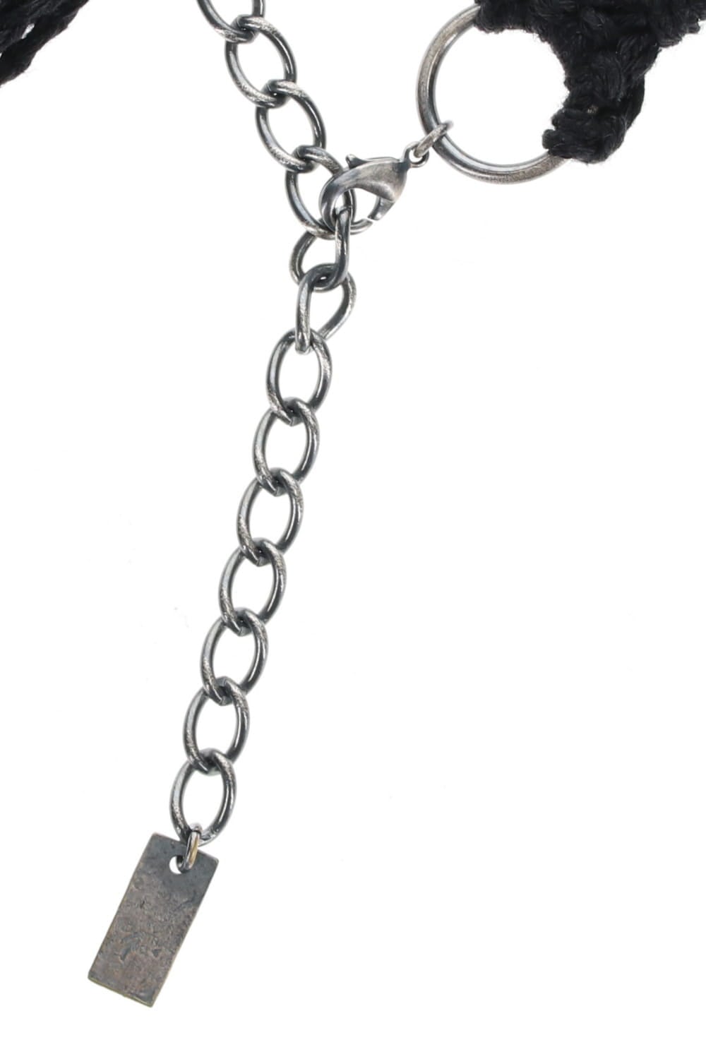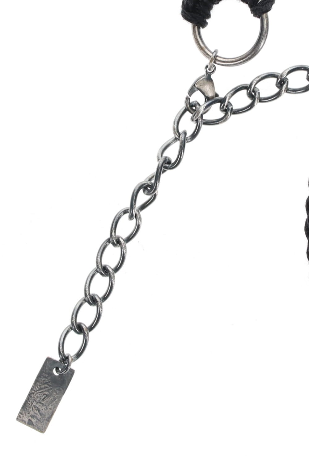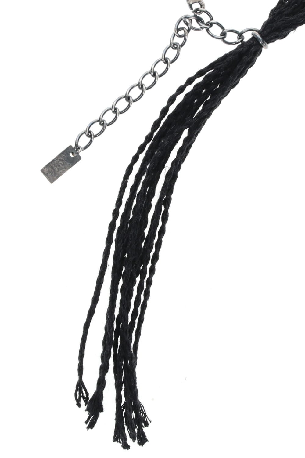 金属パーツと編み込まれたリネンコードのコンビネーションアクセサリー。