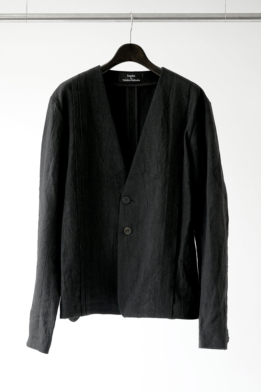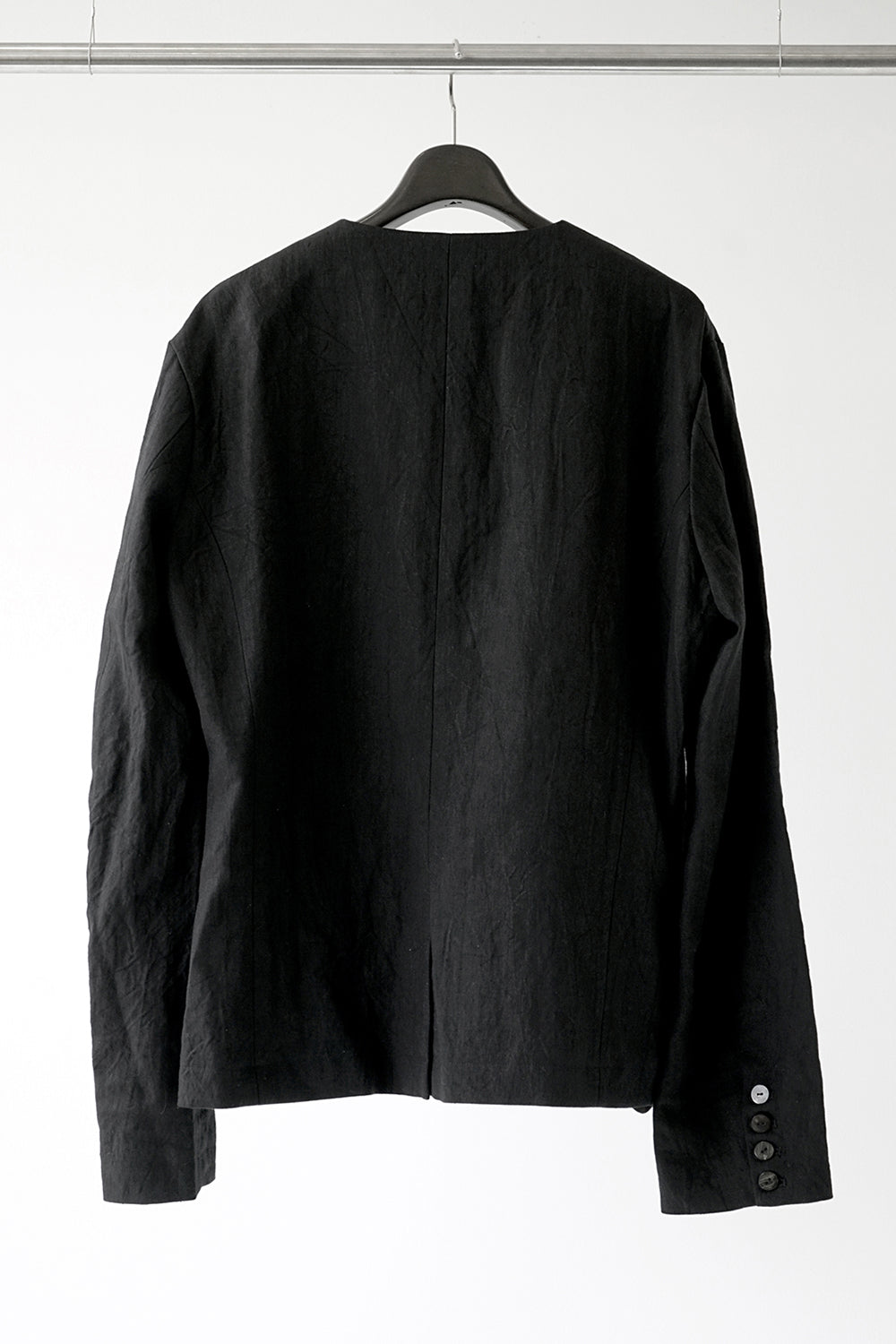 開きの深いノーカラーにすることでインナーを見せるコーディネートが楽しめるジャケット。