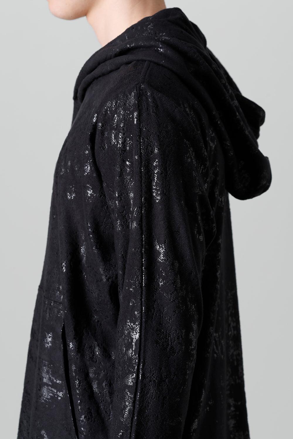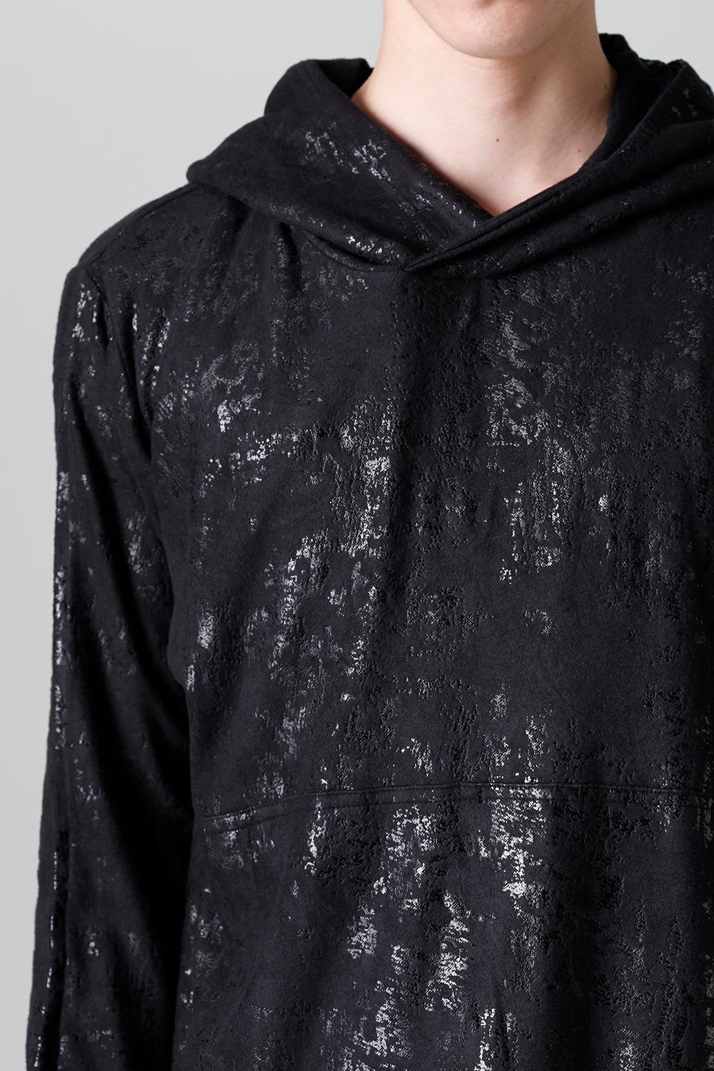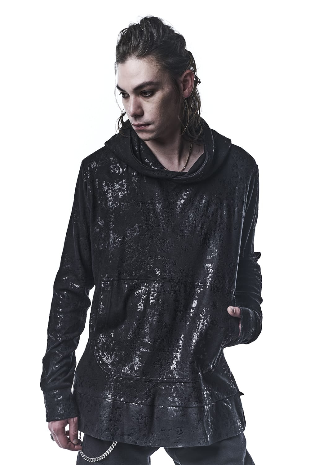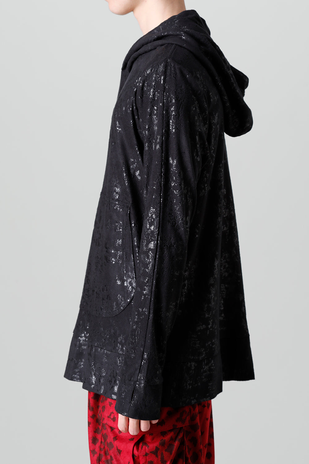 表生地全面に光沢感のある箔加工を施したプルオーバーフーディー。