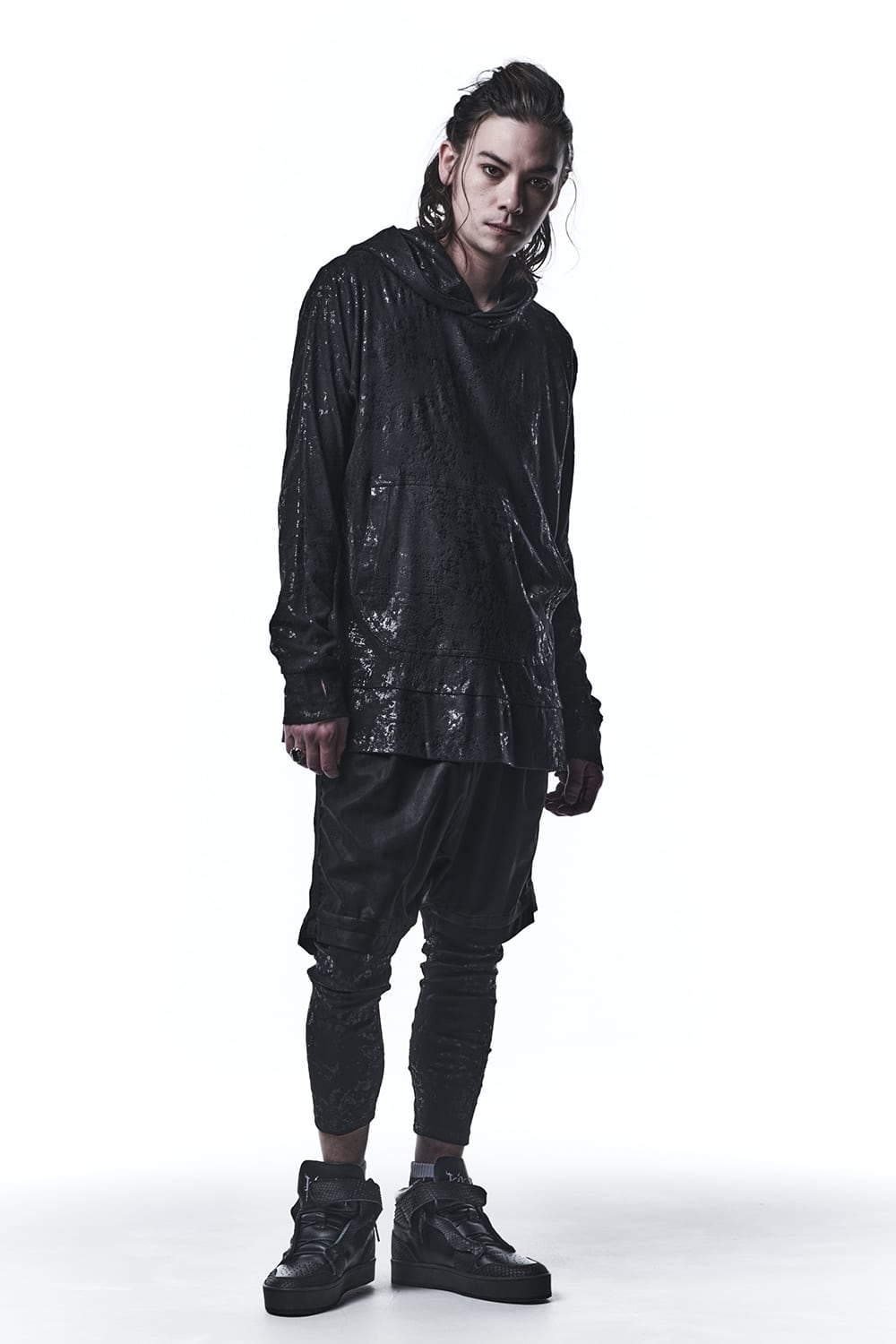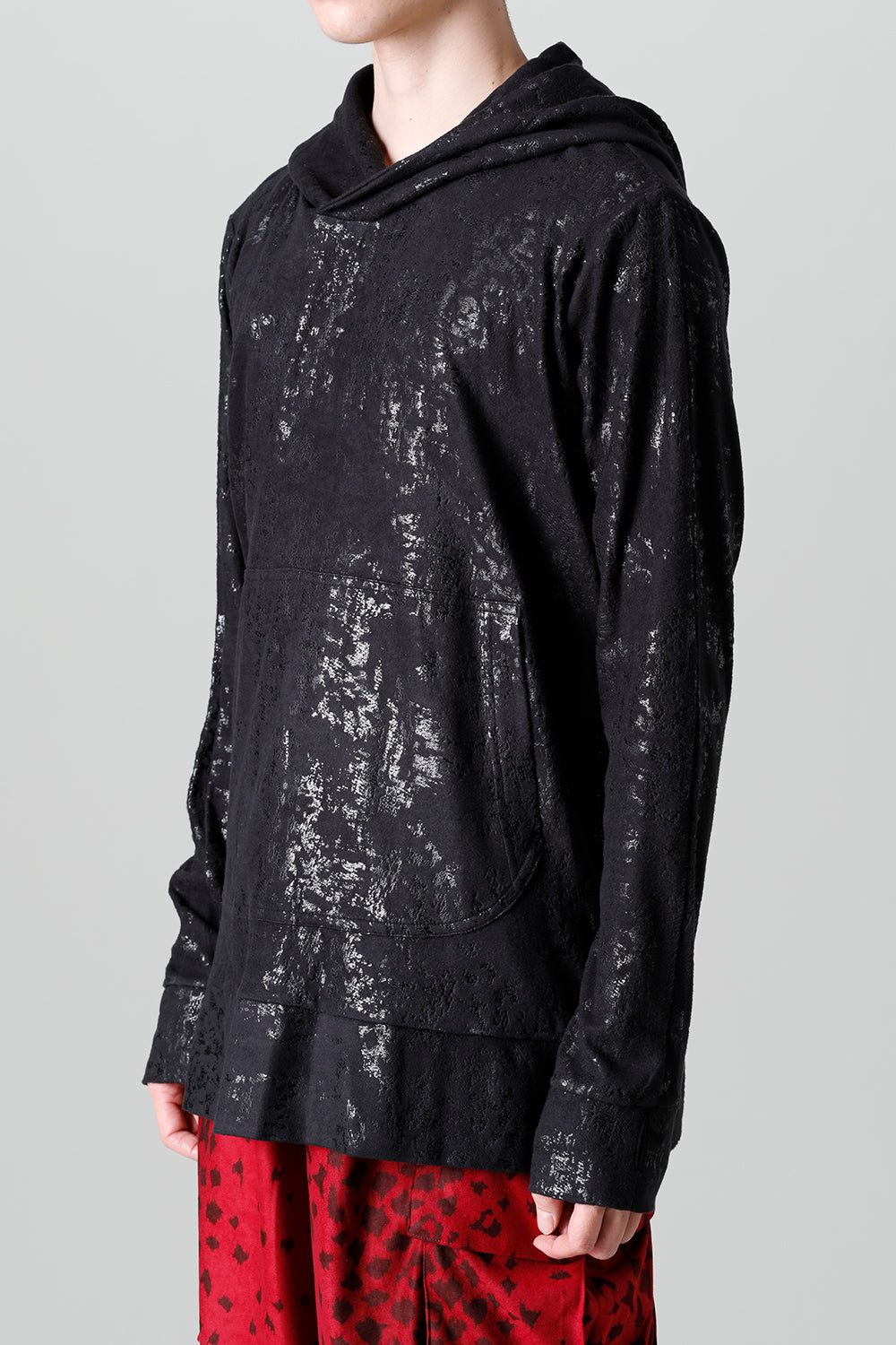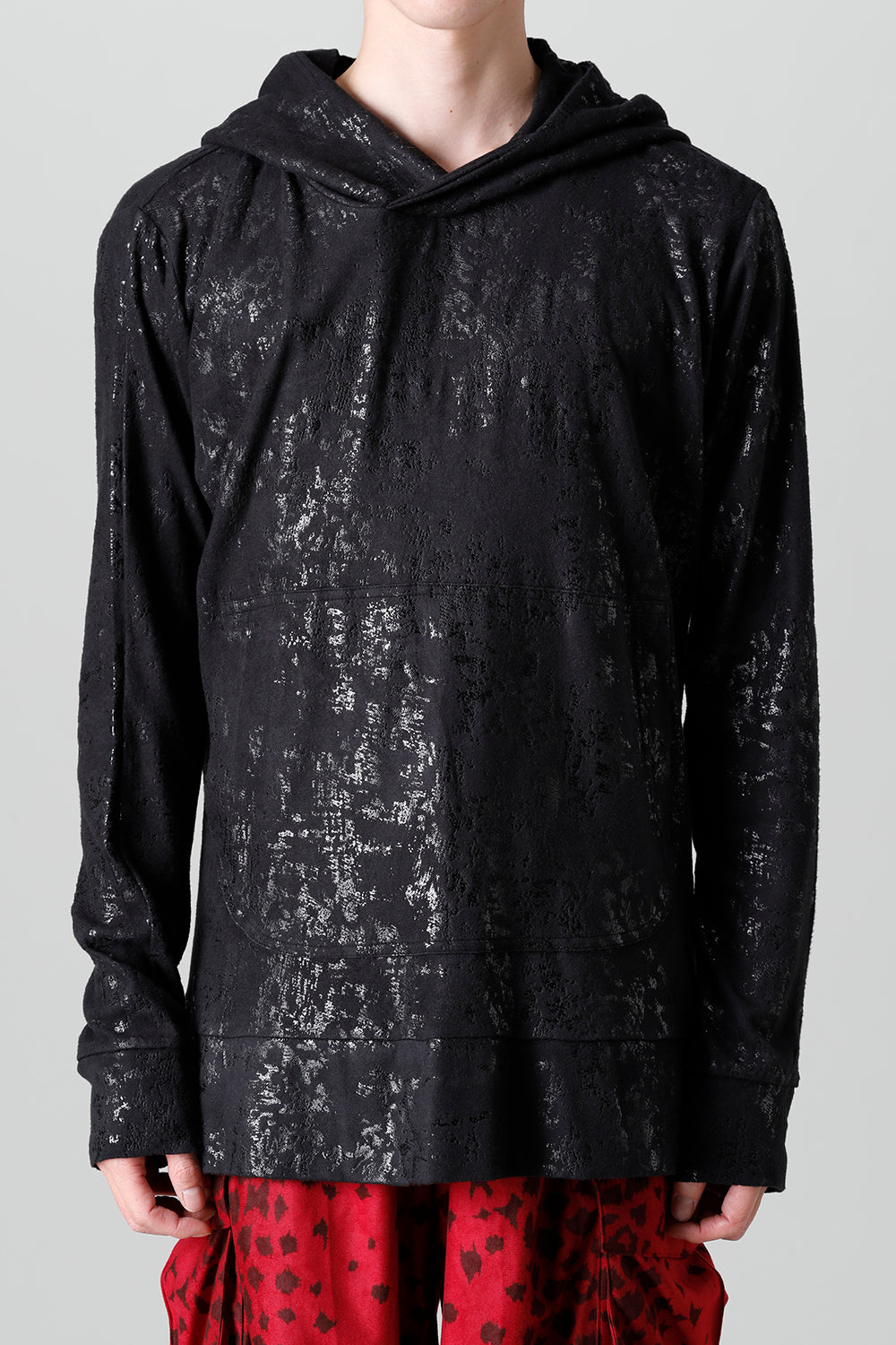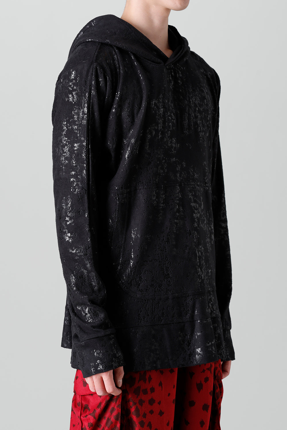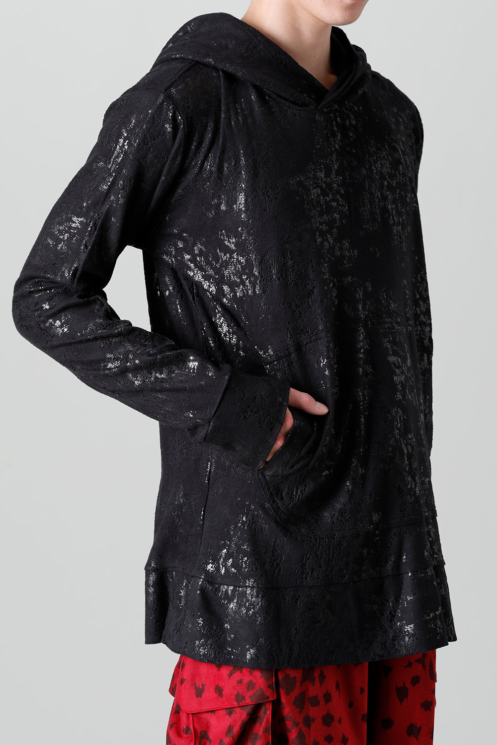 表生地全面に光沢感のある箔加工を施したプルオーバーフーディー。