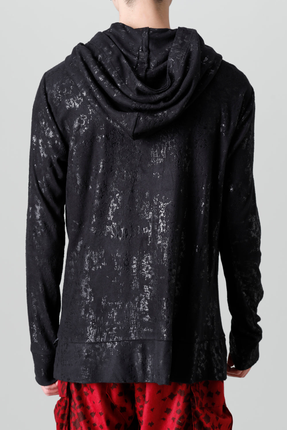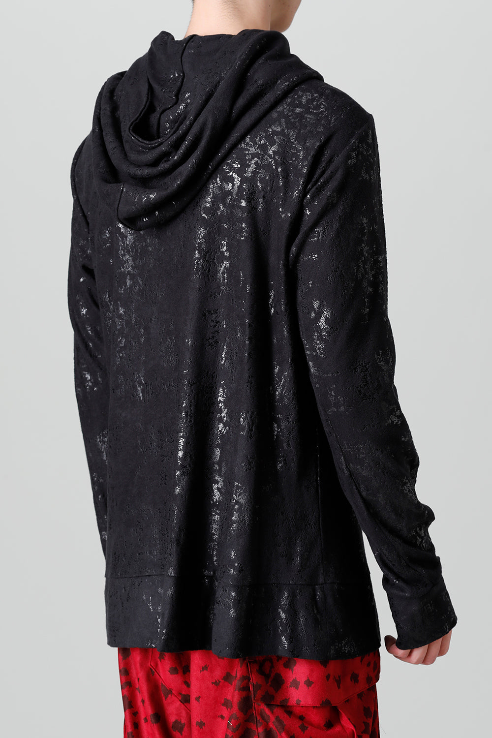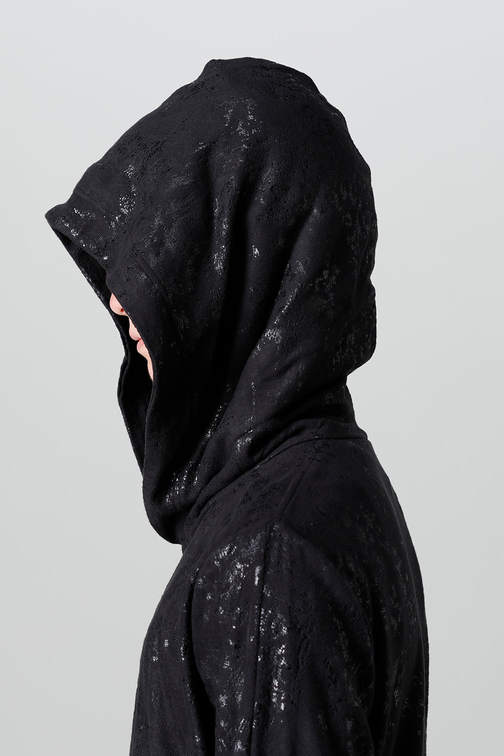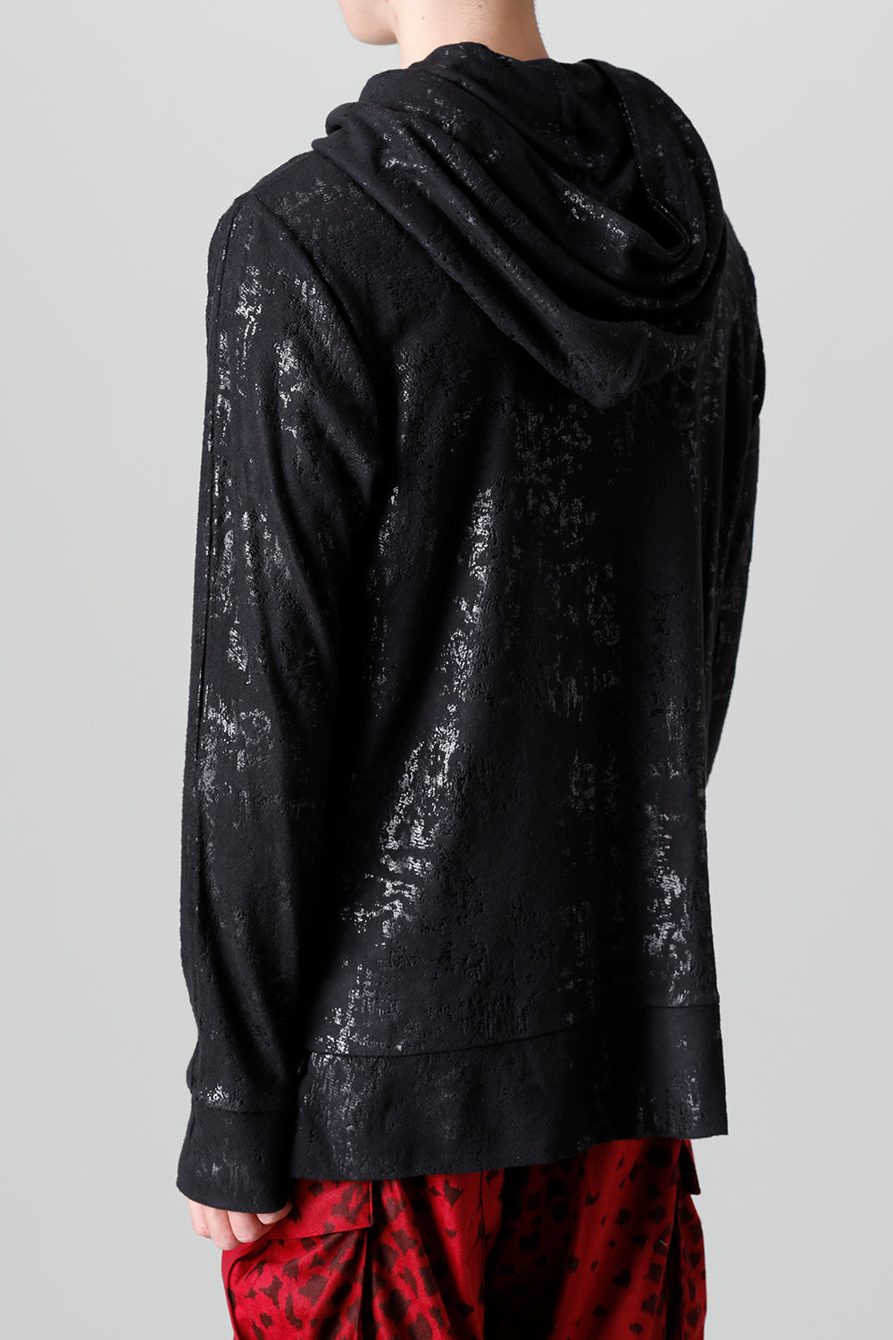 表生地全面に光沢感のある箔加工を施したプルオーバーフーディー。