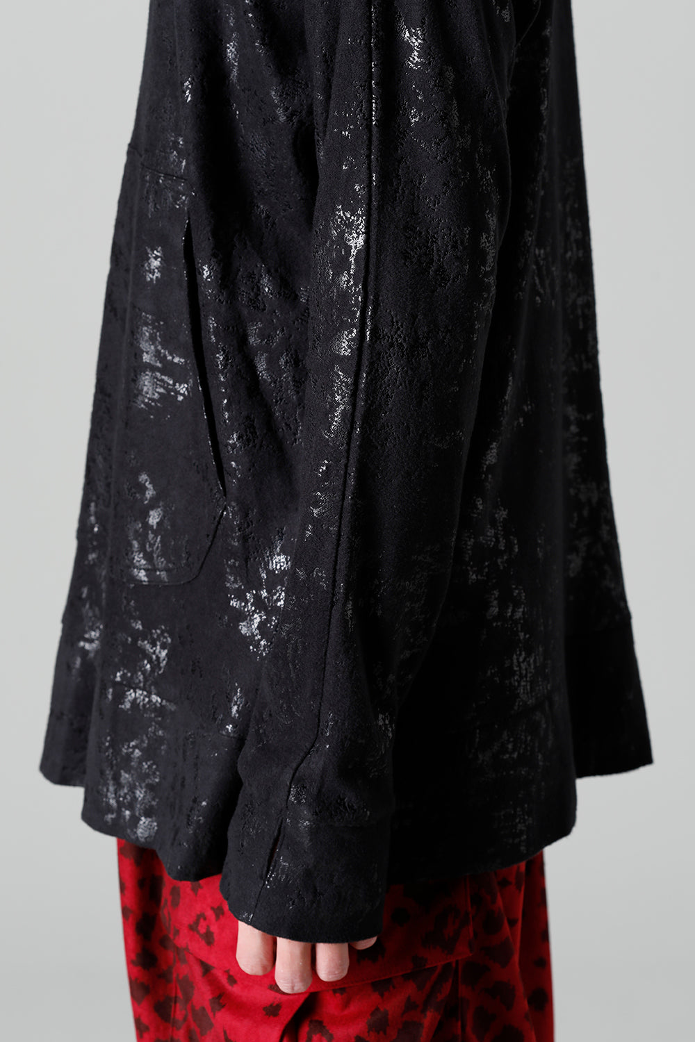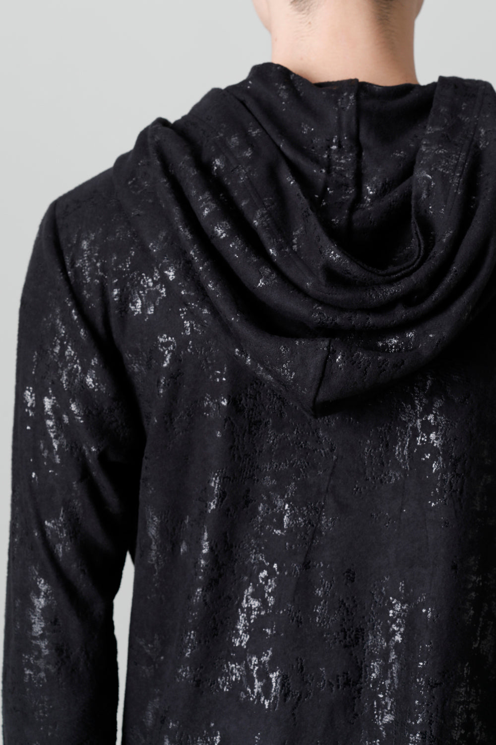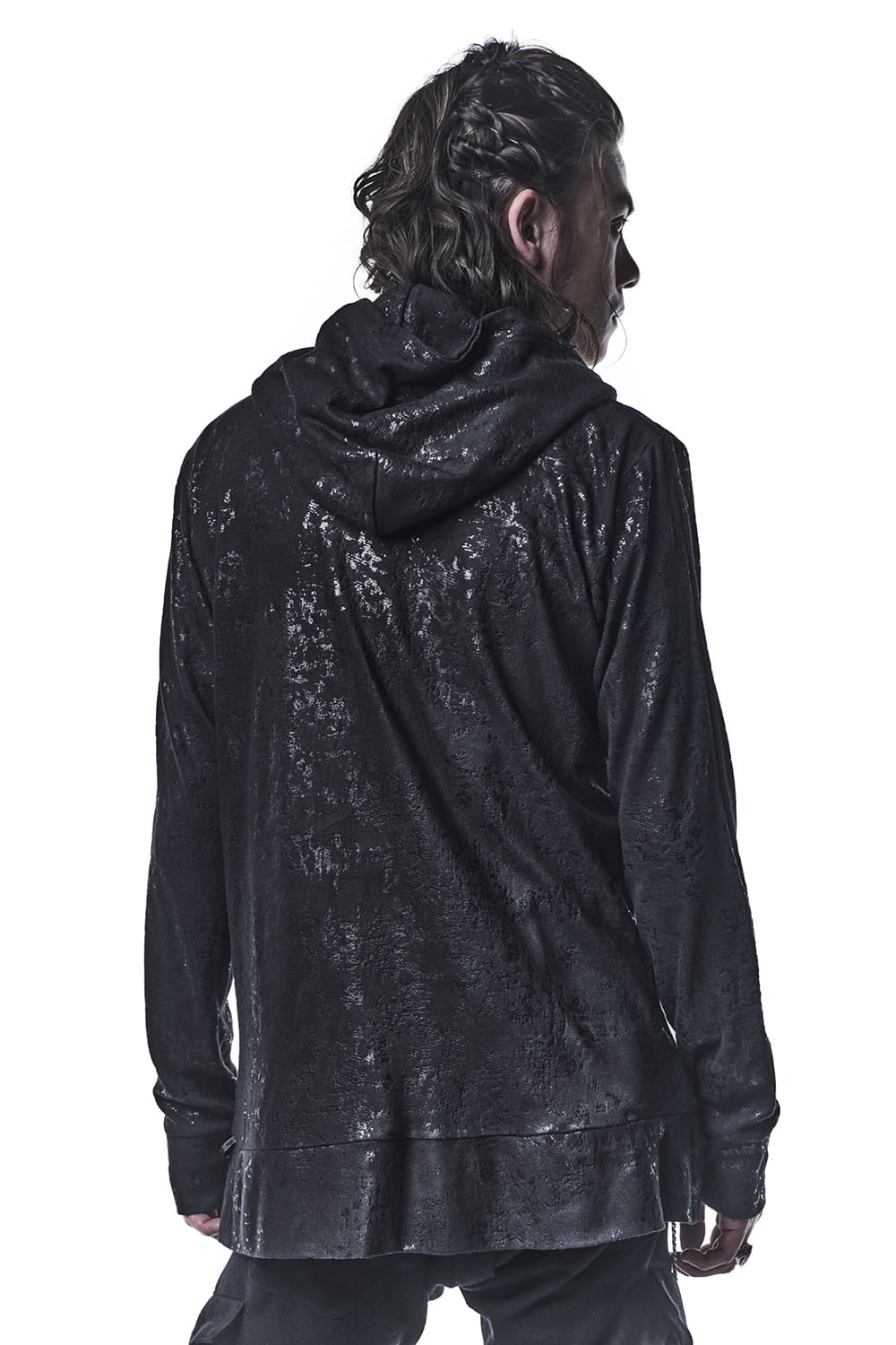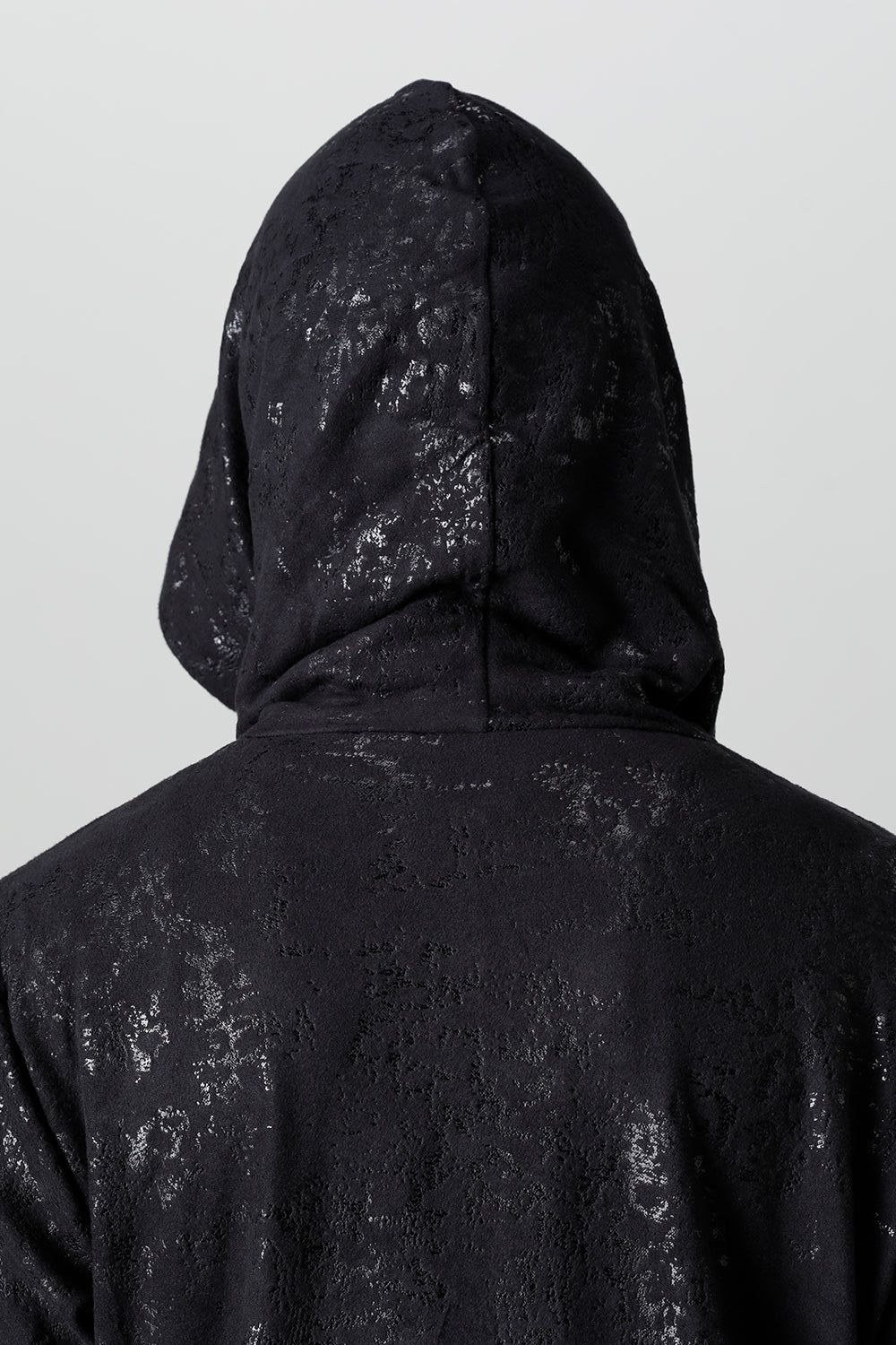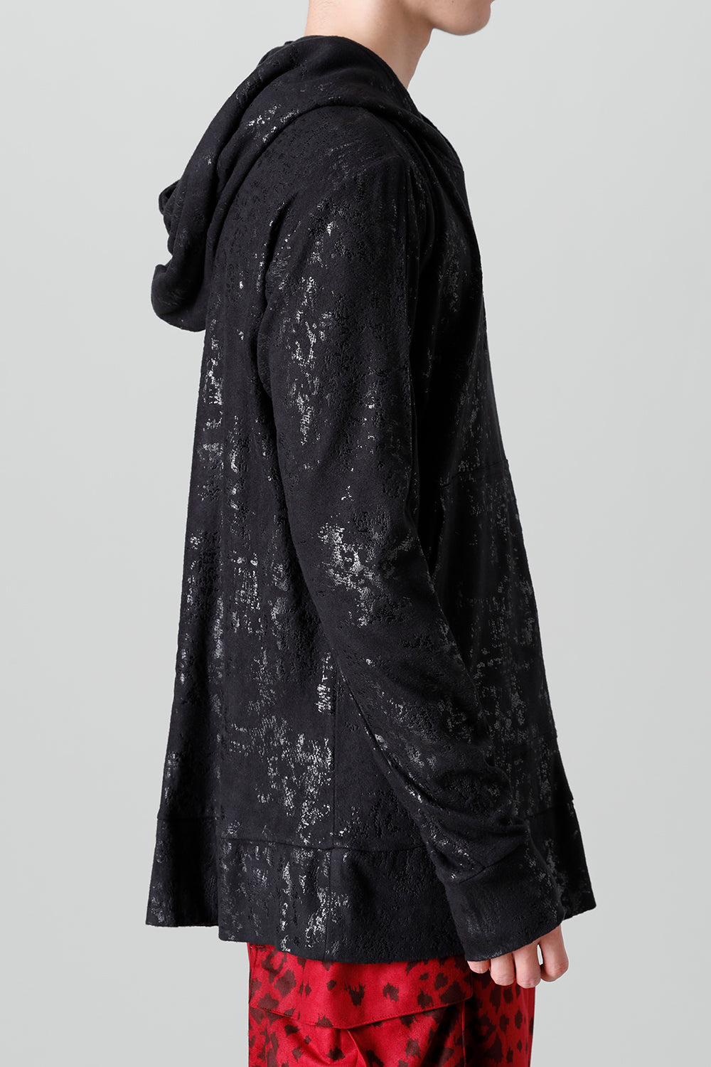 表生地全面に光沢感のある箔加工を施したプルオーバーフーディー。