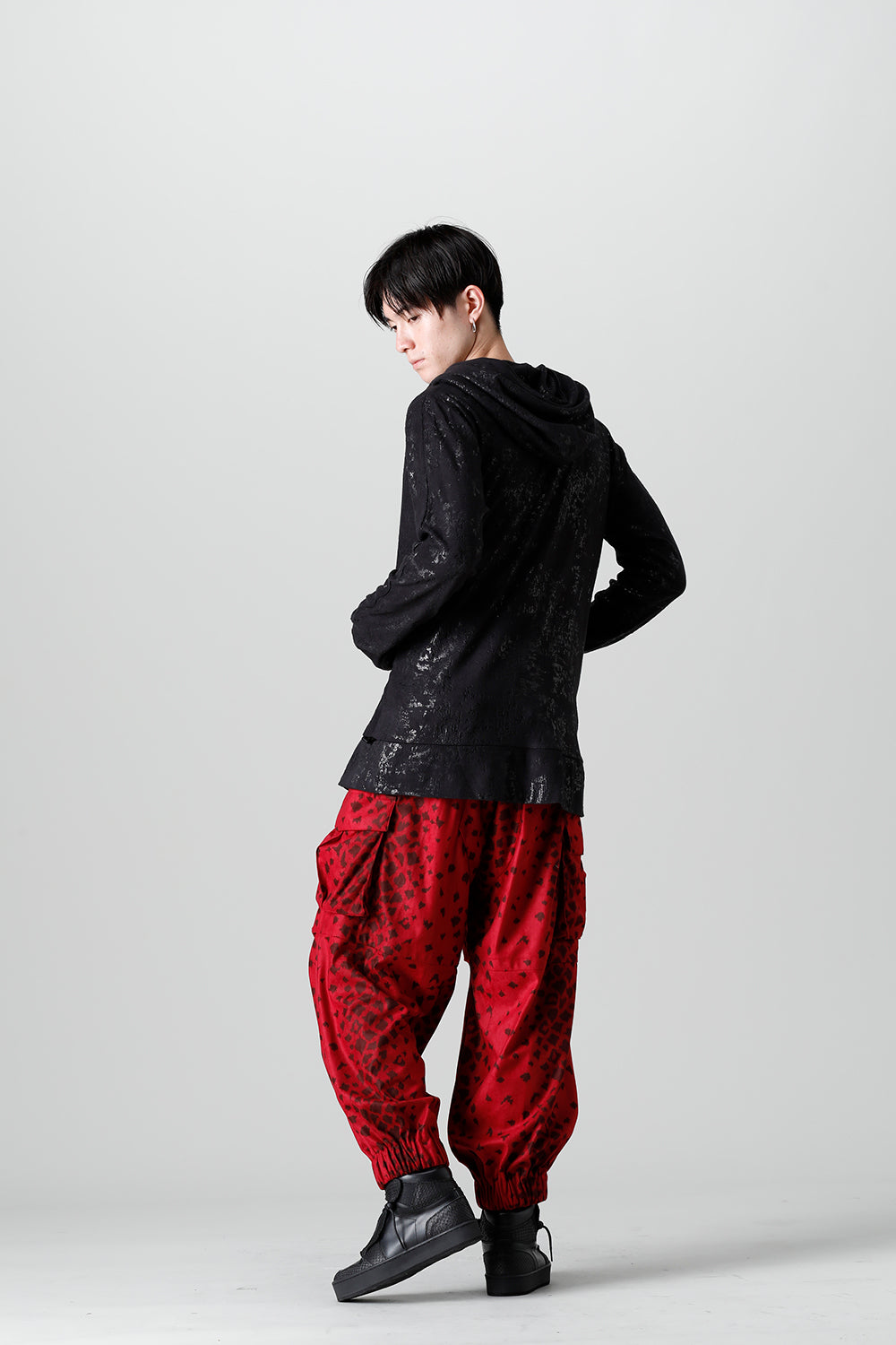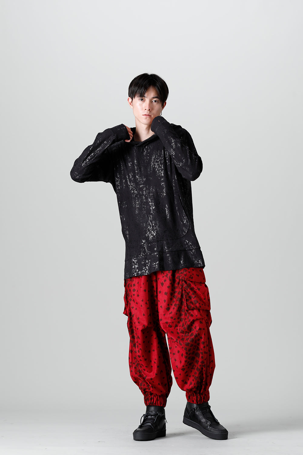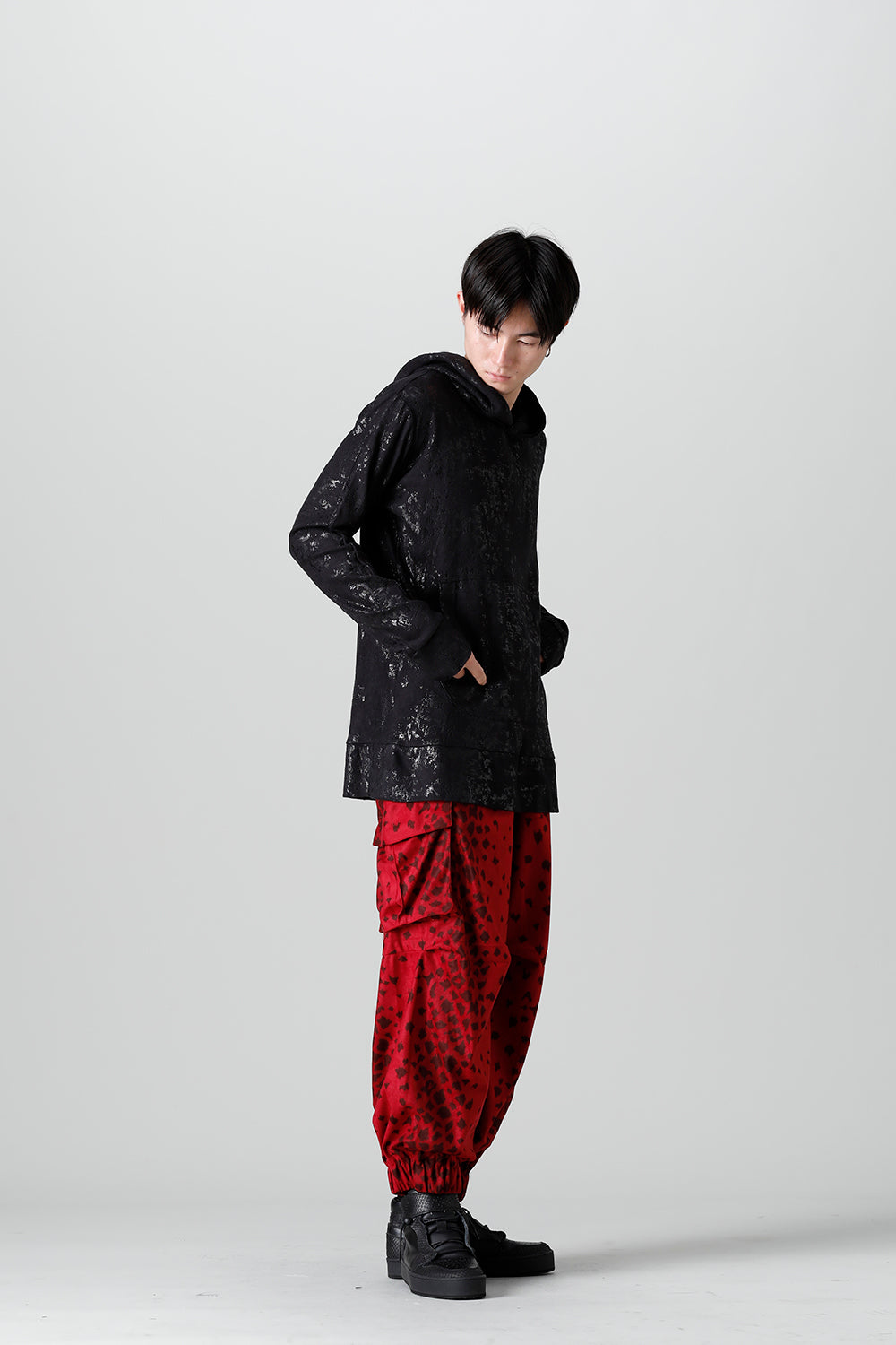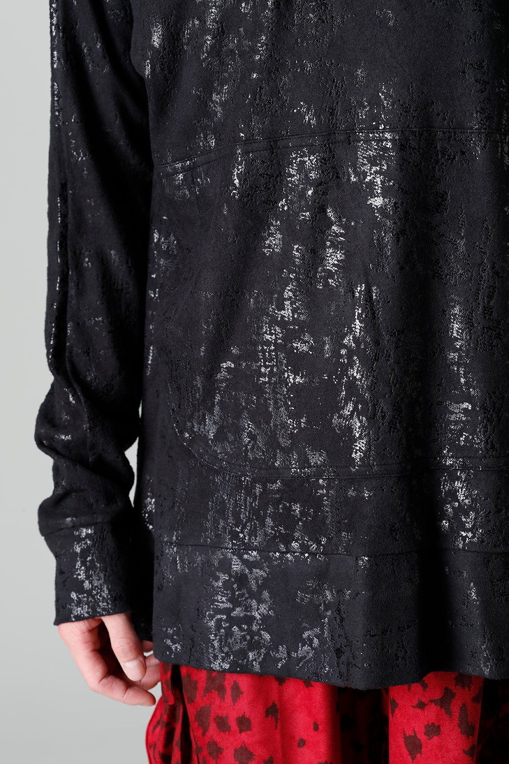 表生地全面に光沢感のある箔加工を施したプルオーバーフーディー。