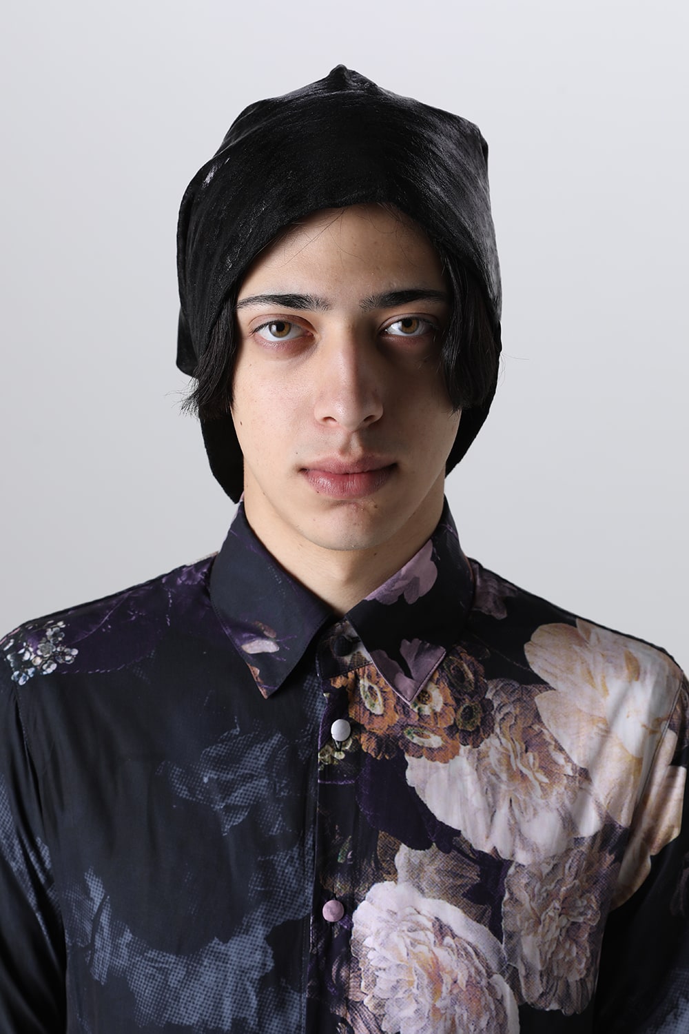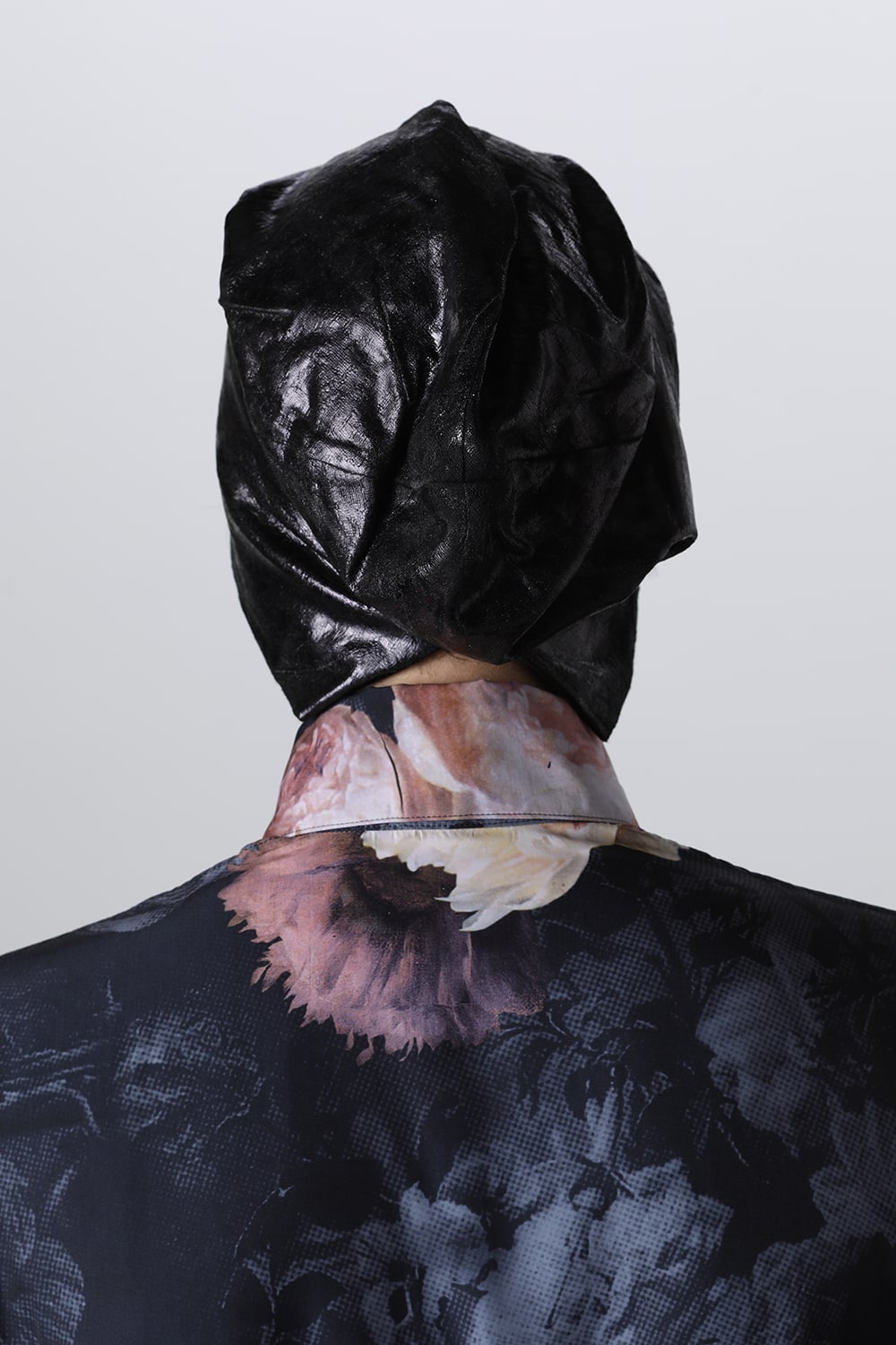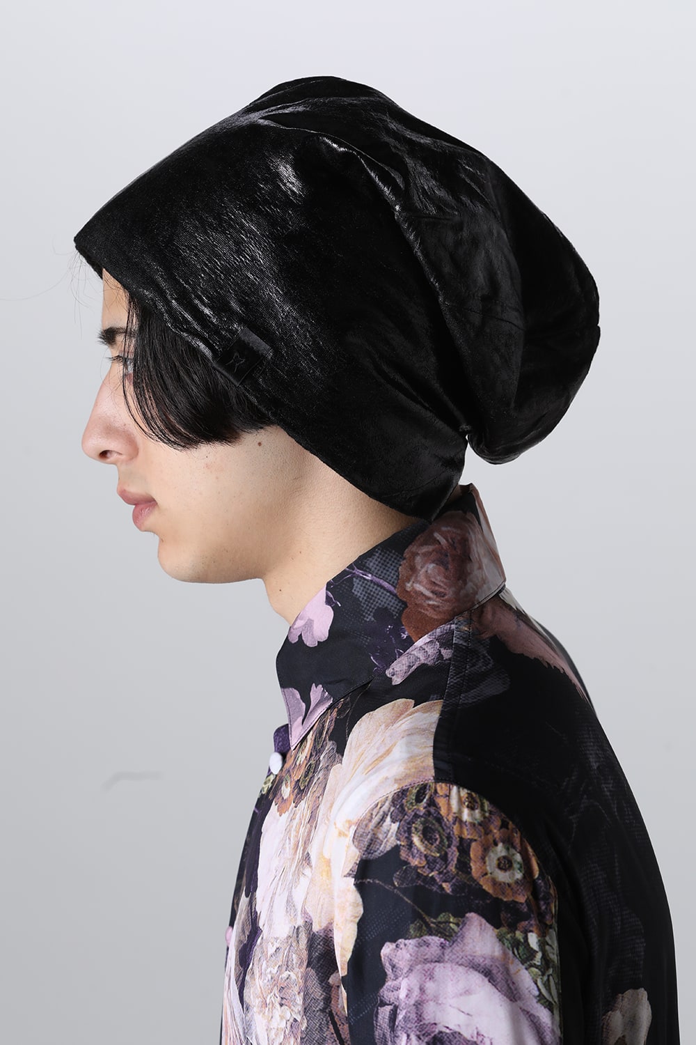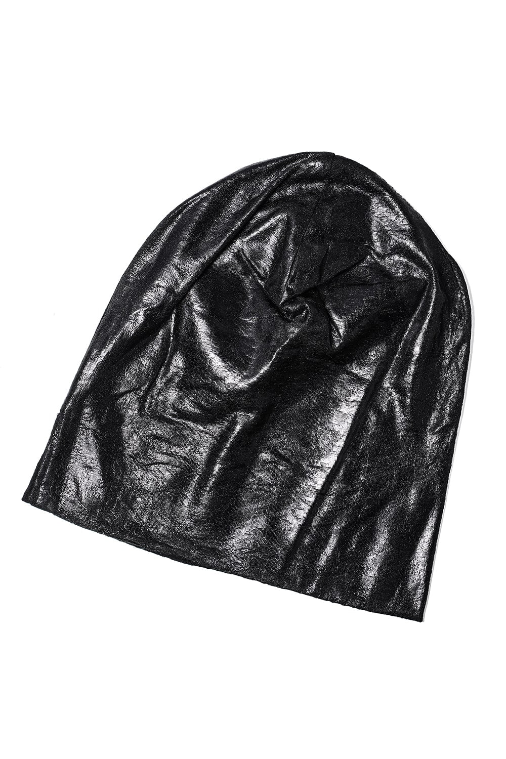 レオパード柄に全面箔プリントを施したエナメルのような光沢感が特徴のニットキャップ。