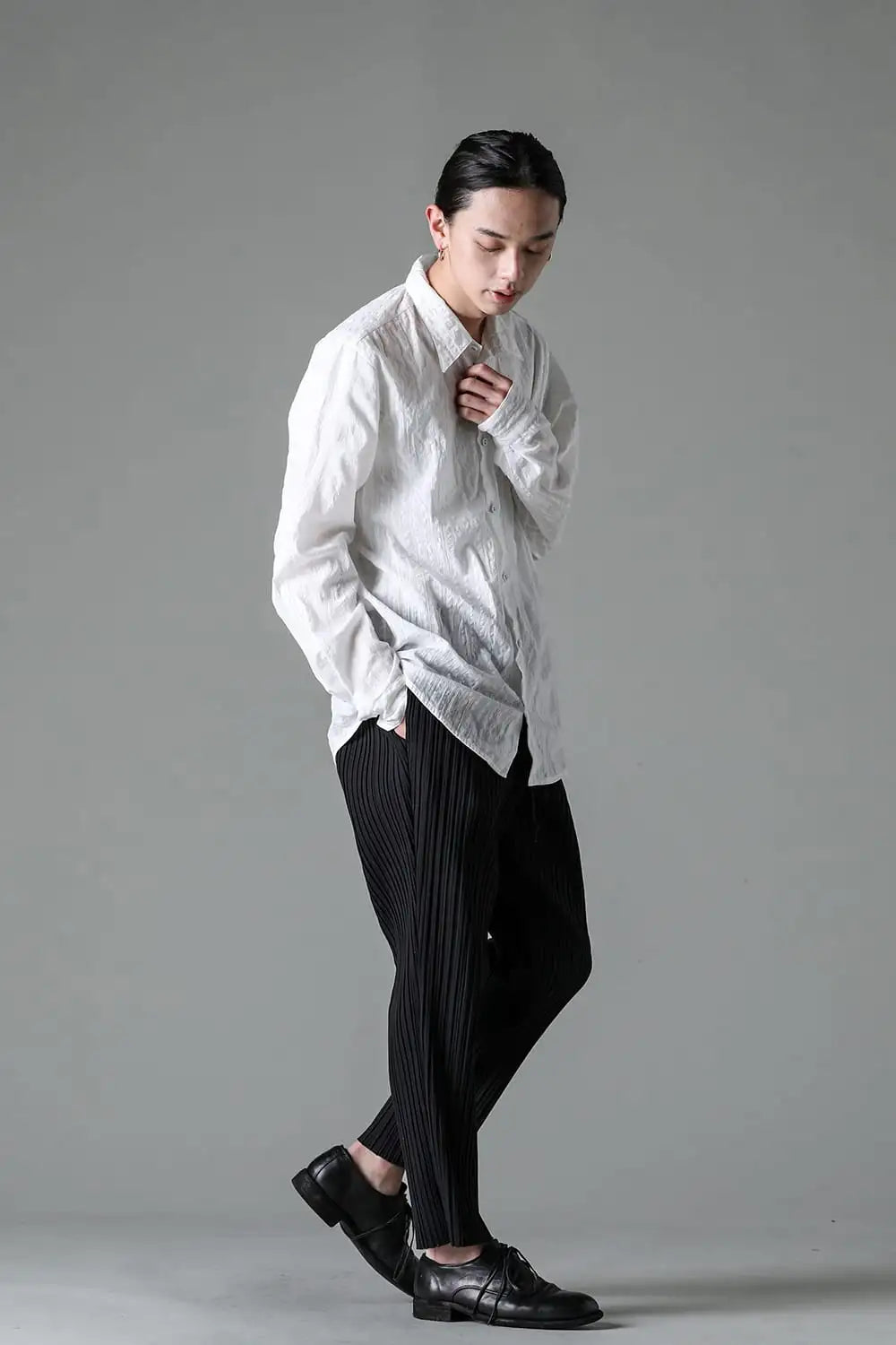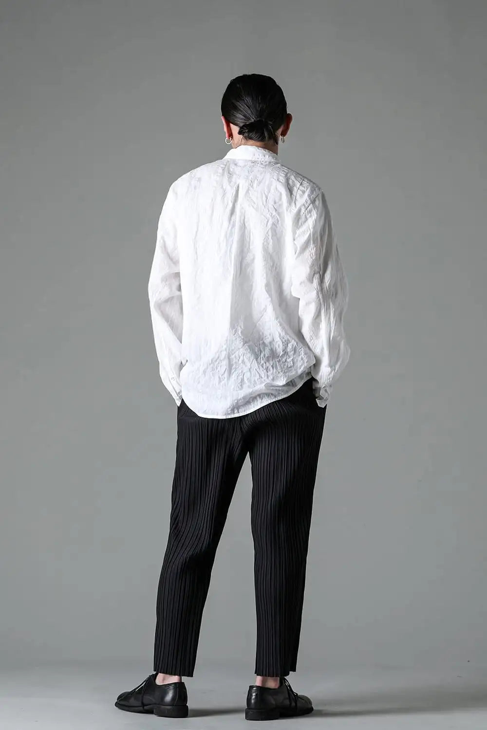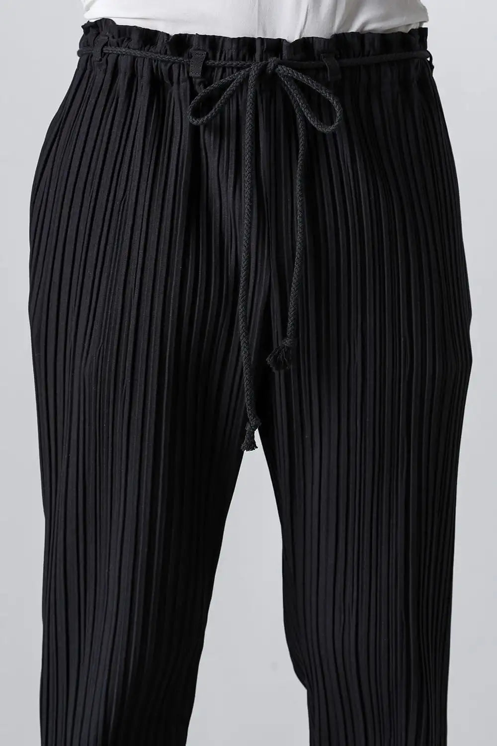 24SSの新型となるスリムシルエットのテーパードクロップドパンツ。 ウエストがゴムとドローコードのイージーパンツ仕様で非常に履きやすいパンツです。 和紙とコットンの生地に薄くコーティングを施し、特殊な処理によって形状記憶させたプリーツが特徴です。 このプリーツは水洗い洗濯でも取れにくく、長い間同じ風合いを楽しんでいただけます。