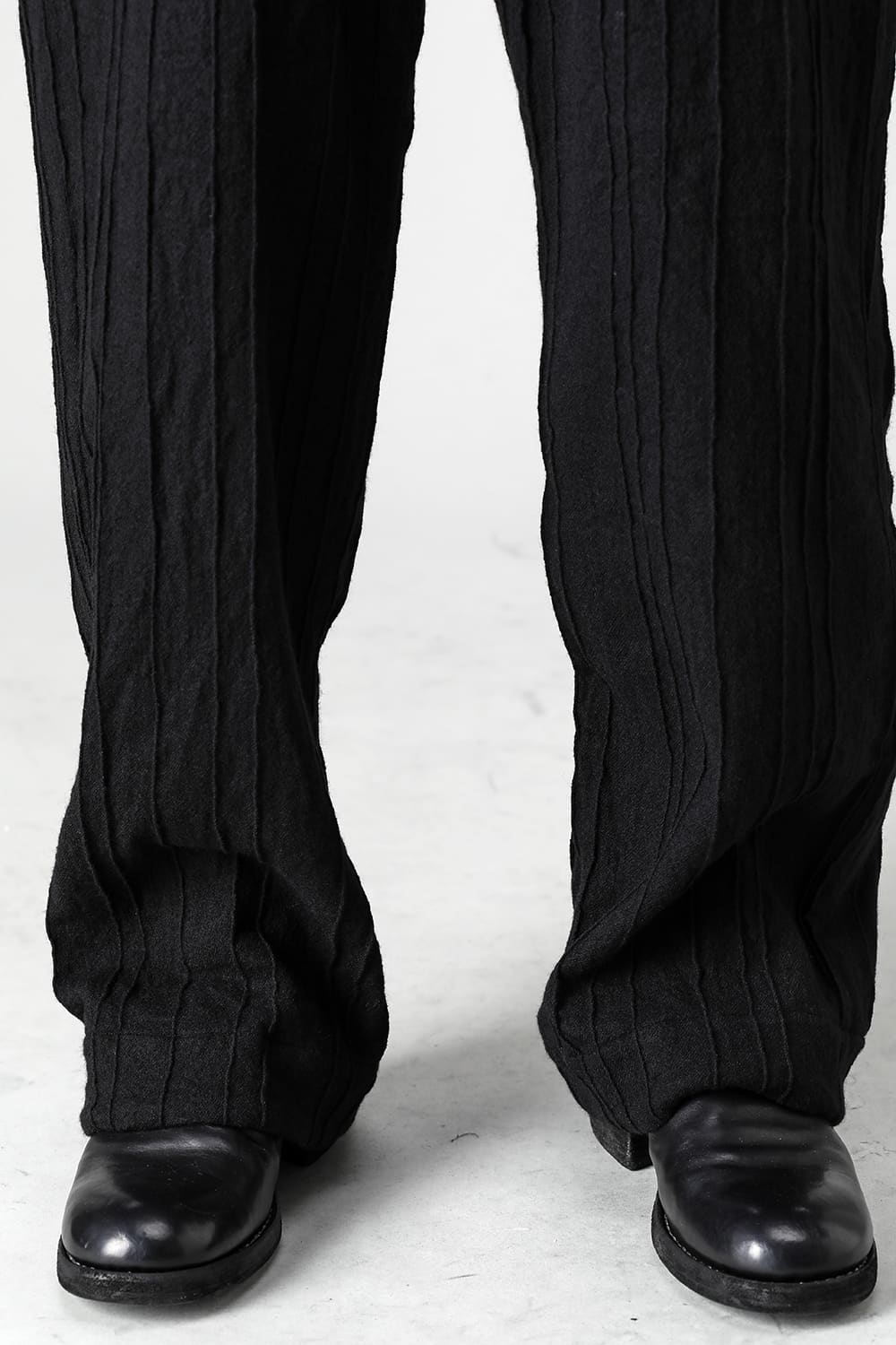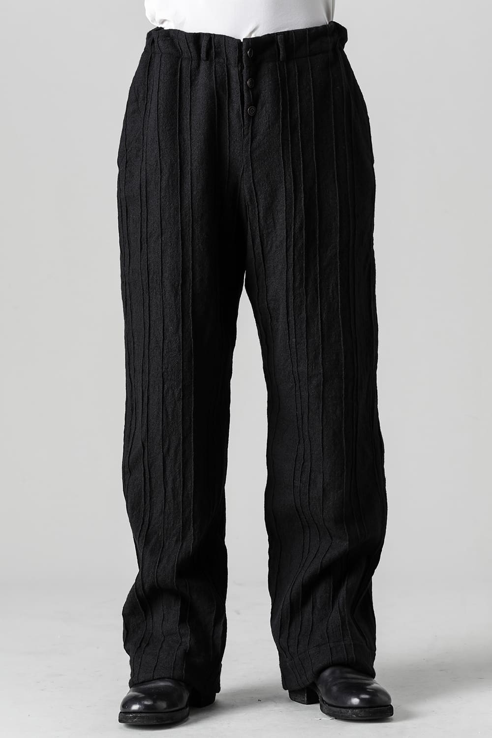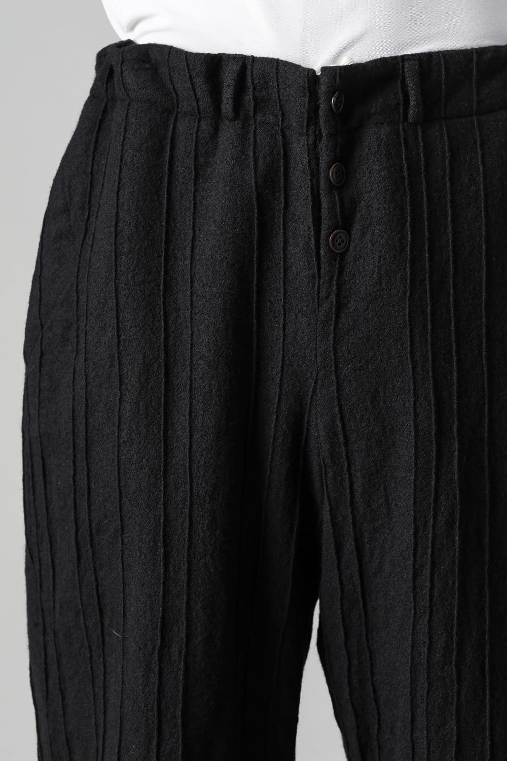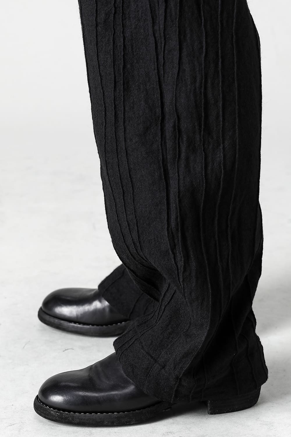 直線的で美しいシルエットのワイドパンツ。パターンは比較的シンプルに作られていますが、デザイナー自身が生地を一本一本ステッチでつまみながらラインを作ったオリジナルのプリーツウールが使用されており、拘りを強く感じられる一品です。直線的なステッチをより存在感のあるものにしたハンドメイドブランドならではのデザイン。フロントのデザインは100年以上前のフランスの下着から着想を得たディテールとなっており、ウェストバンドも省き、見た目はシンプルながらも非常にユニークなデザインとなっています。深みのあるブラックとしっかりと存在感のあるウールが説得力と纏まりを生み出します。