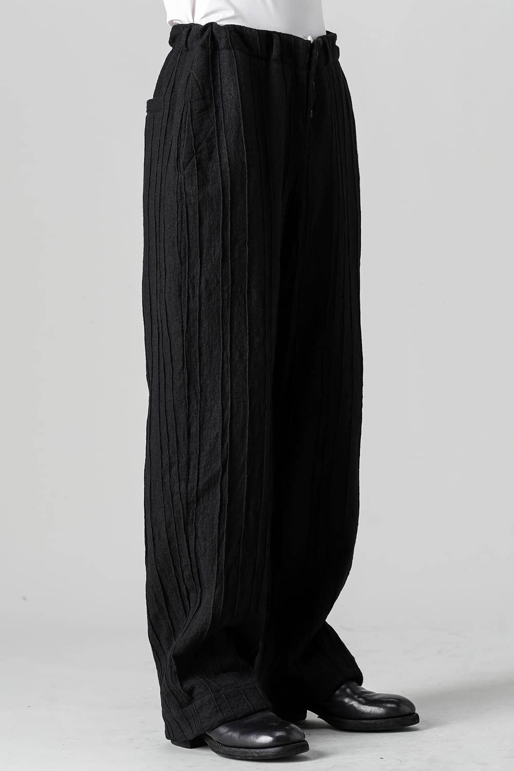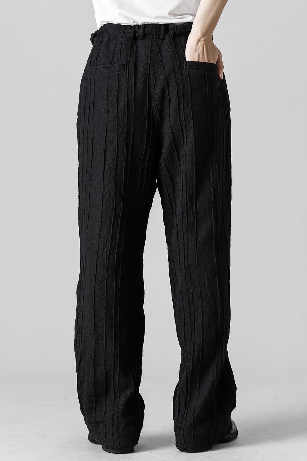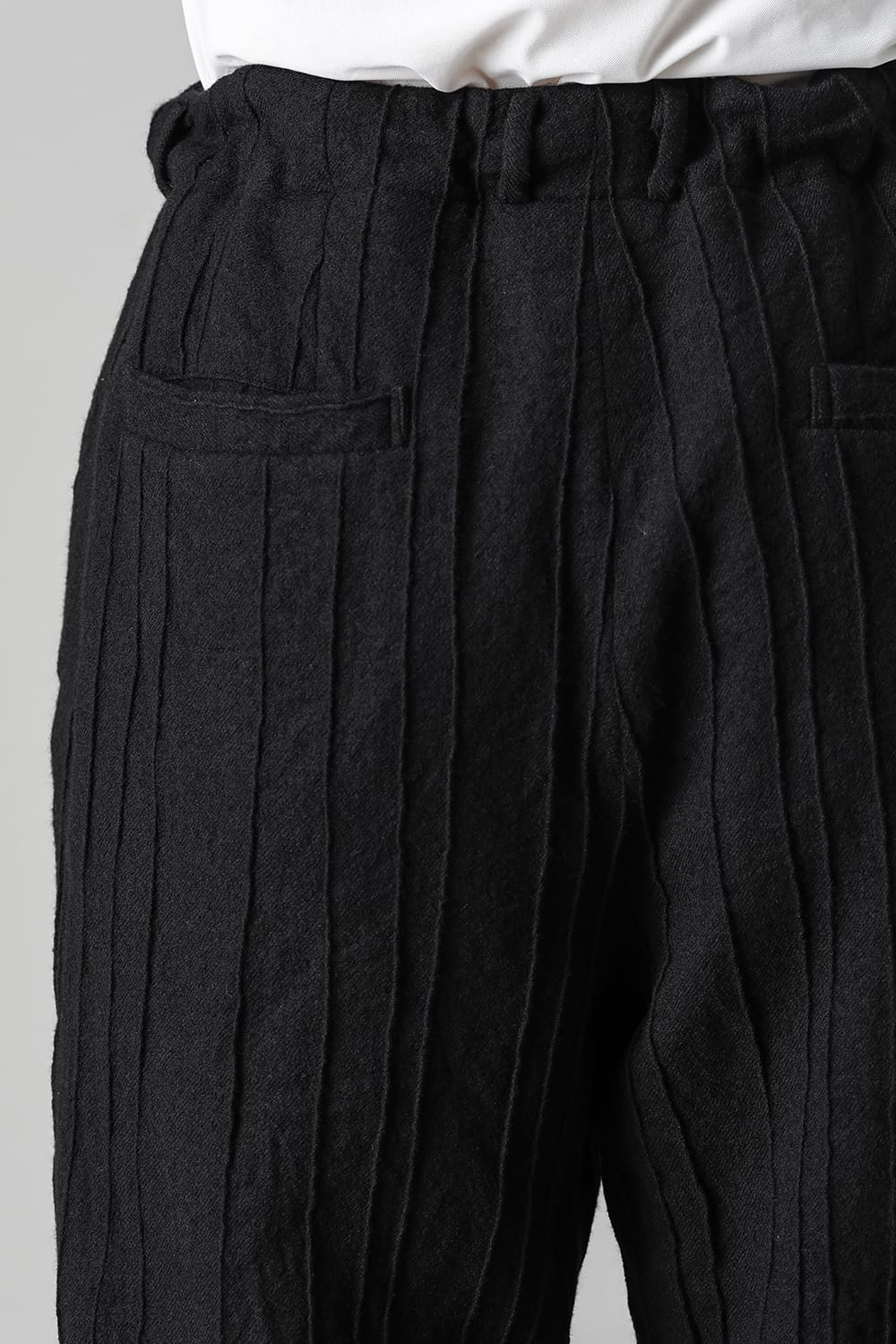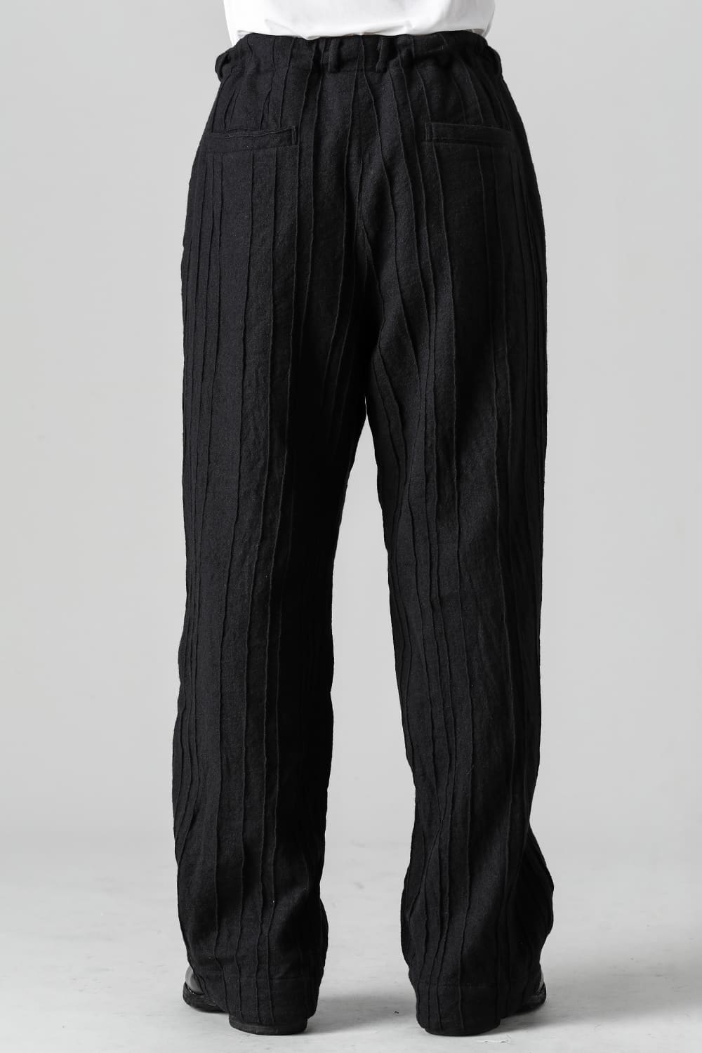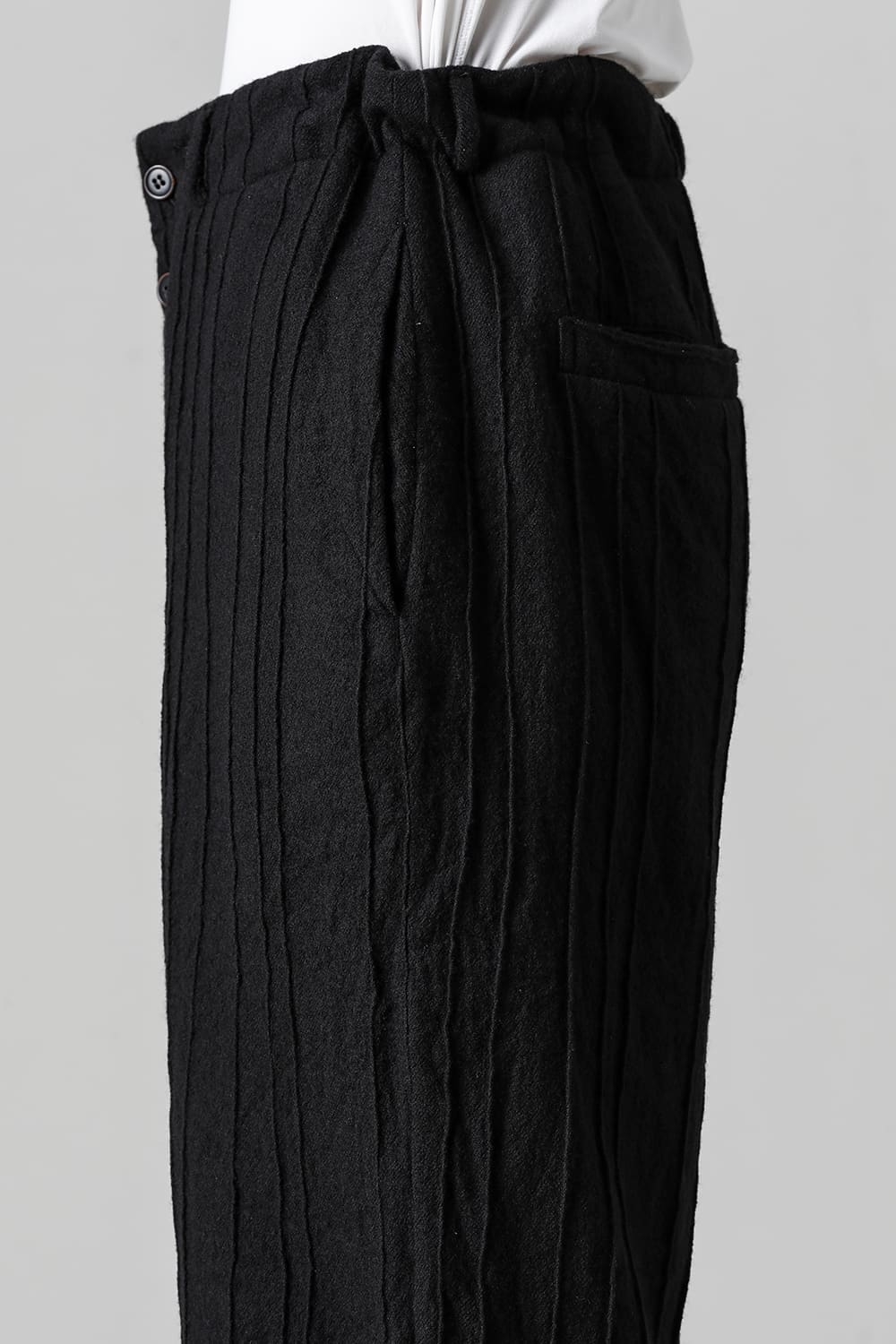 直線的で美しいシルエットのワイドパンツ。パターンは比較的シンプルに作られていますが、デザイナー自身が生地を一本一本ステッチでつまみながらラインを作ったオリジナルのプリーツウールが使用されており、拘りを強く感じられる一品です。直線的なステッチをより存在感のあるものにしたハンドメイドブランドならではのデザイン。フロントのデザインは100年以上前のフランスの下着から着想を得たディテールとなっており、ウェストバンドも省き、見た目はシンプルながらも非常にユニークなデザインとなっています。深みのあるブラックとしっかりと存在感のあるウールが説得力と纏まりを生み出します。