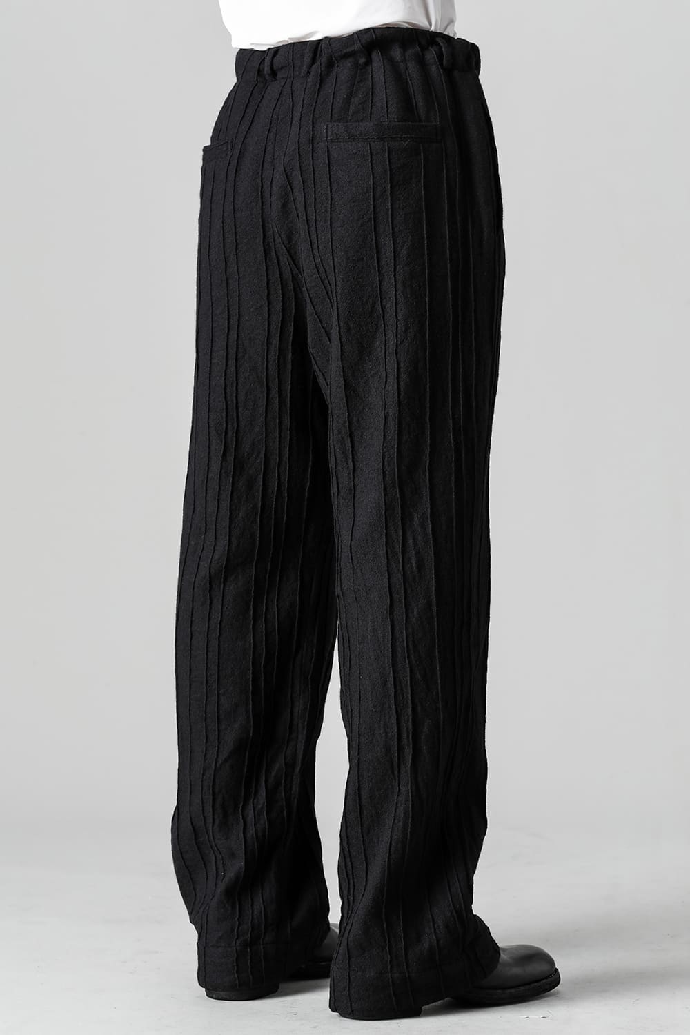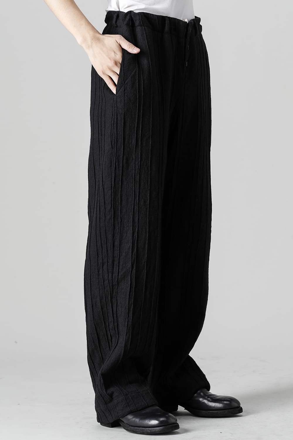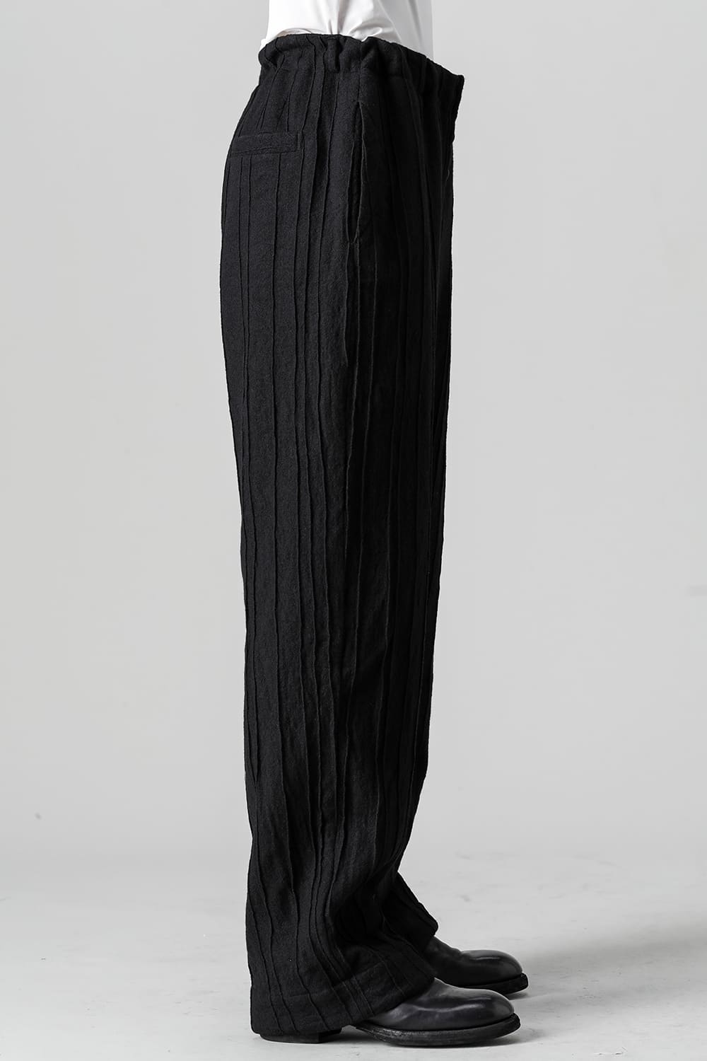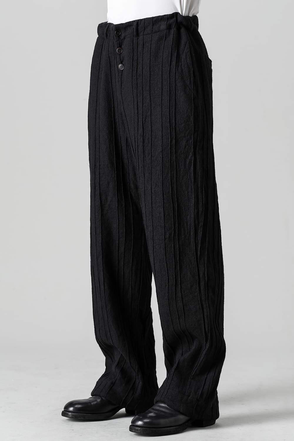 直線的で美しいシルエットのワイドパンツ。パターンは比較的シンプルに作られていますが、デザイナー自身が生地を一本一本ステッチでつまみながらラインを作ったオリジナルのプリーツウールが使用されており、拘りを強く感じられる一品です。直線的なステッチをより存在感のあるものにしたハンドメイドブランドならではのデザイン。フロントのデザインは100年以上前のフランスの下着から着想を得たディテールとなっており、ウェストバンドも省き、見た目はシンプルながらも非常にユニークなデザインとなっています。深みのあるブラックとしっかりと存在感のあるウールが説得力と纏まりを生み出します。