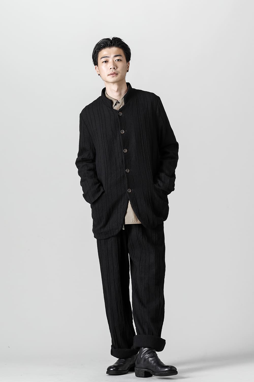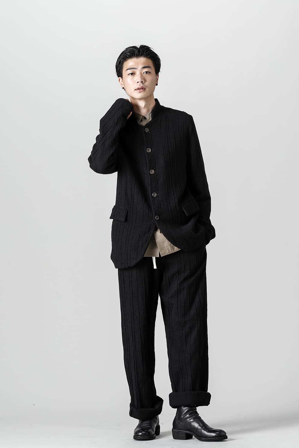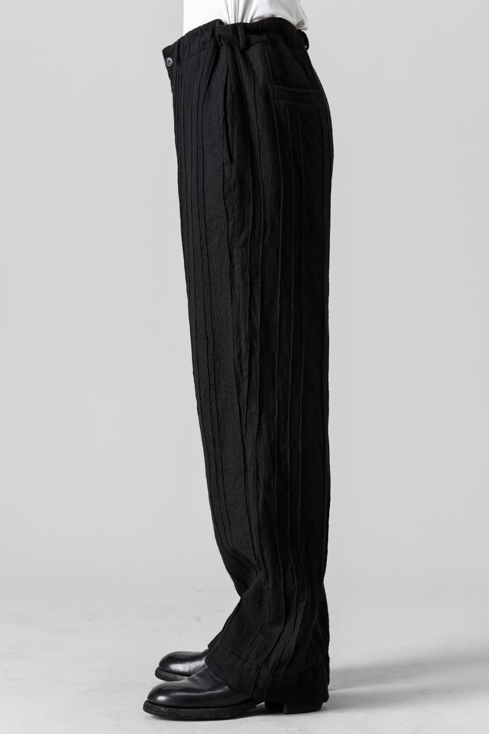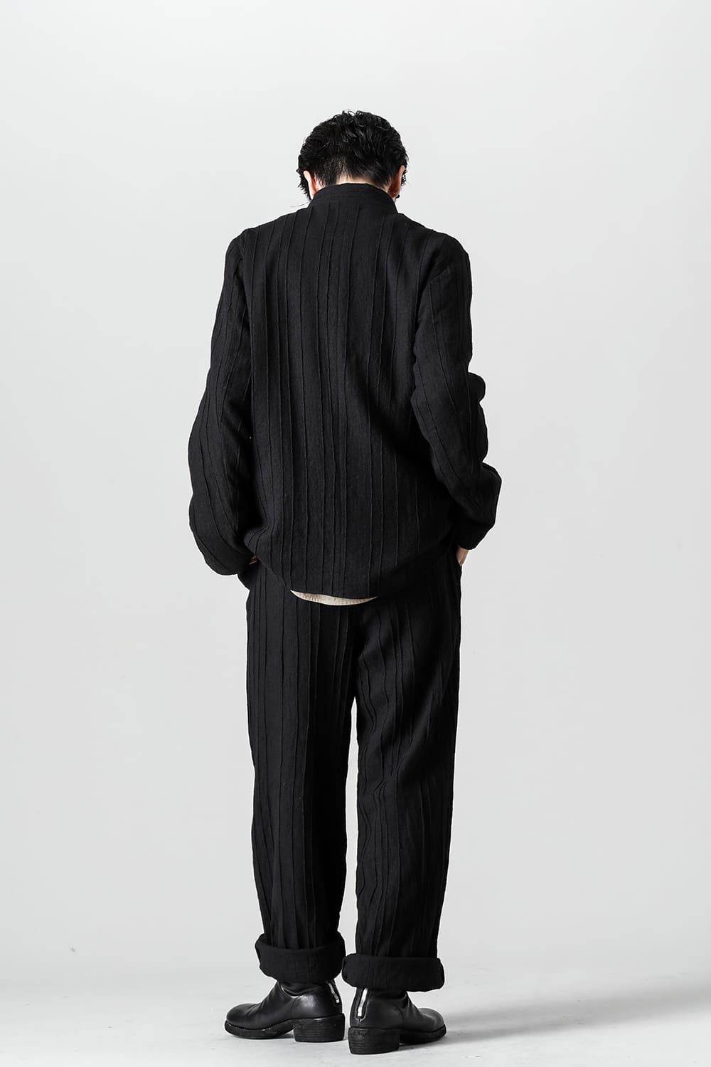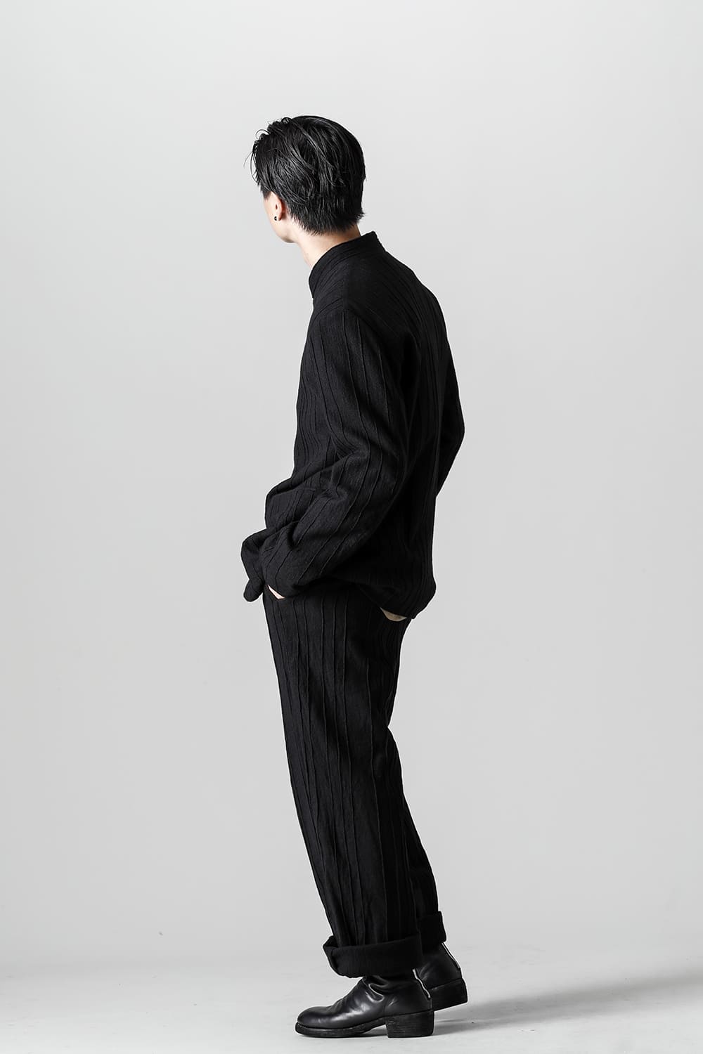 直線的で美しいシルエットのワイドパンツ。パターンは比較的シンプルに作られていますが、デザイナー自身が生地を一本一本ステッチでつまみながらラインを作ったオリジナルのプリーツウールが使用されており、拘りを強く感じられる一品です。直線的なステッチをより存在感のあるものにしたハンドメイドブランドならではのデザイン。フロントのデザインは100年以上前のフランスの下着から着想を得たディテールとなっており、ウェストバンドも省き、見た目はシンプルながらも非常にユニークなデザインとなっています。深みのあるブラックとしっかりと存在感のあるウールが説得力と纏まりを生み出します。