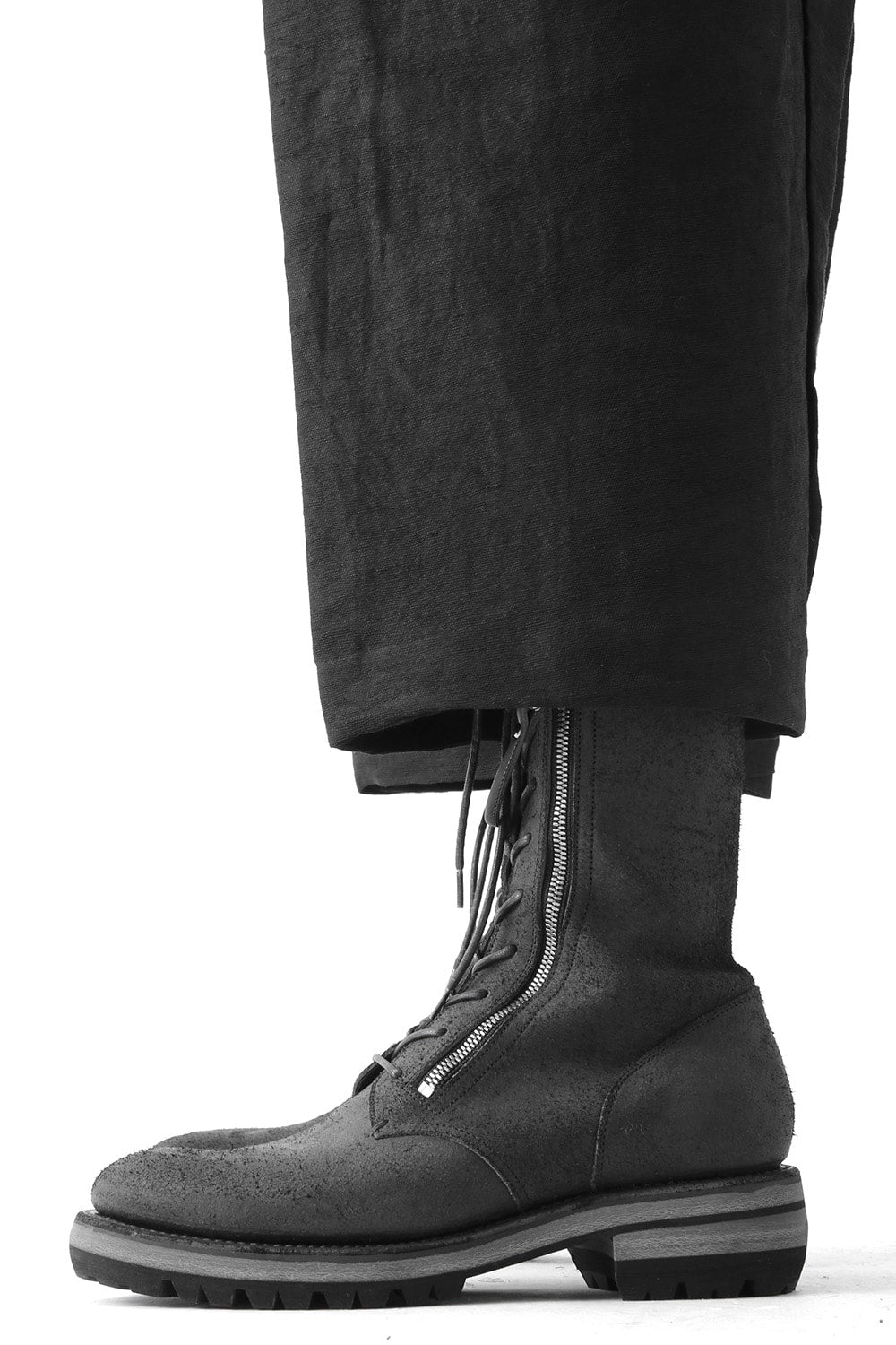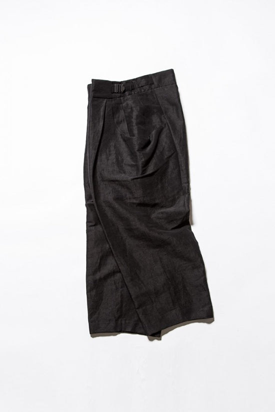縦糸ナイロン横糸リネンで織り上げたギャバジンをワッシャー&タンブラーで仕上げた両側3ポケットの八分丈のバギーシルエットパンツ。