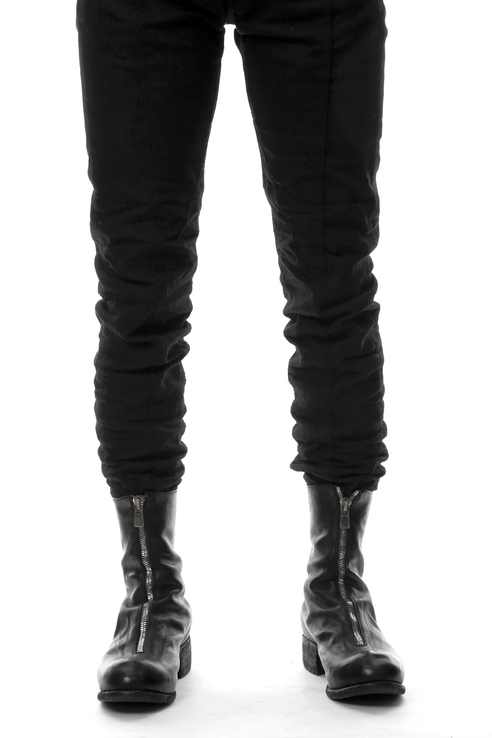 このモデル特有のポッコリとしたボリュームのあるツゥが特徴的なフロントジップブーツのロングタイプです。表革、ライナーともにワンピースで成型されています。弊社が選択したソールはヒールを高くしたダブルソール仕様。股下が長く、裾にたまる商品を多く取り揃える弊社のボトムスとの相性が抜群です。