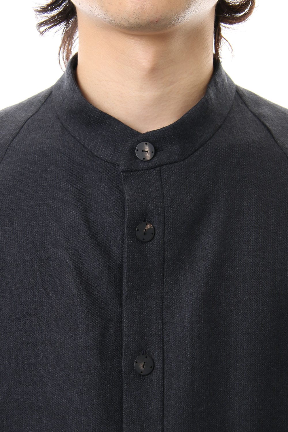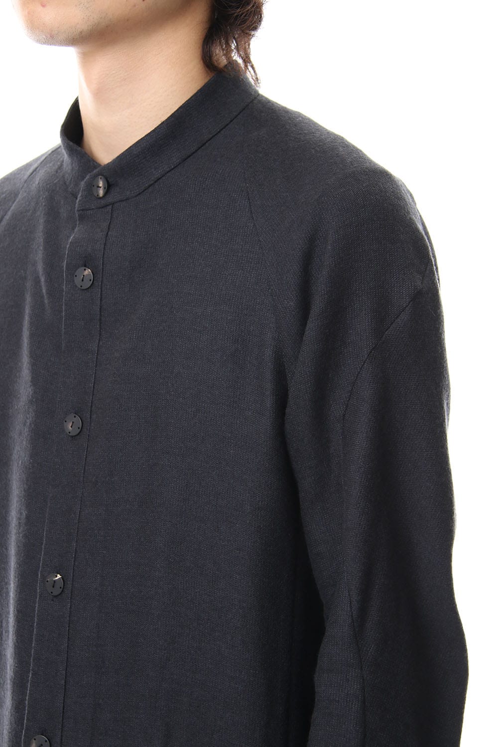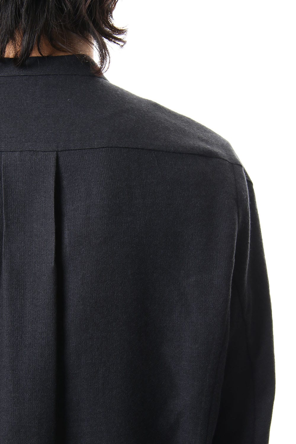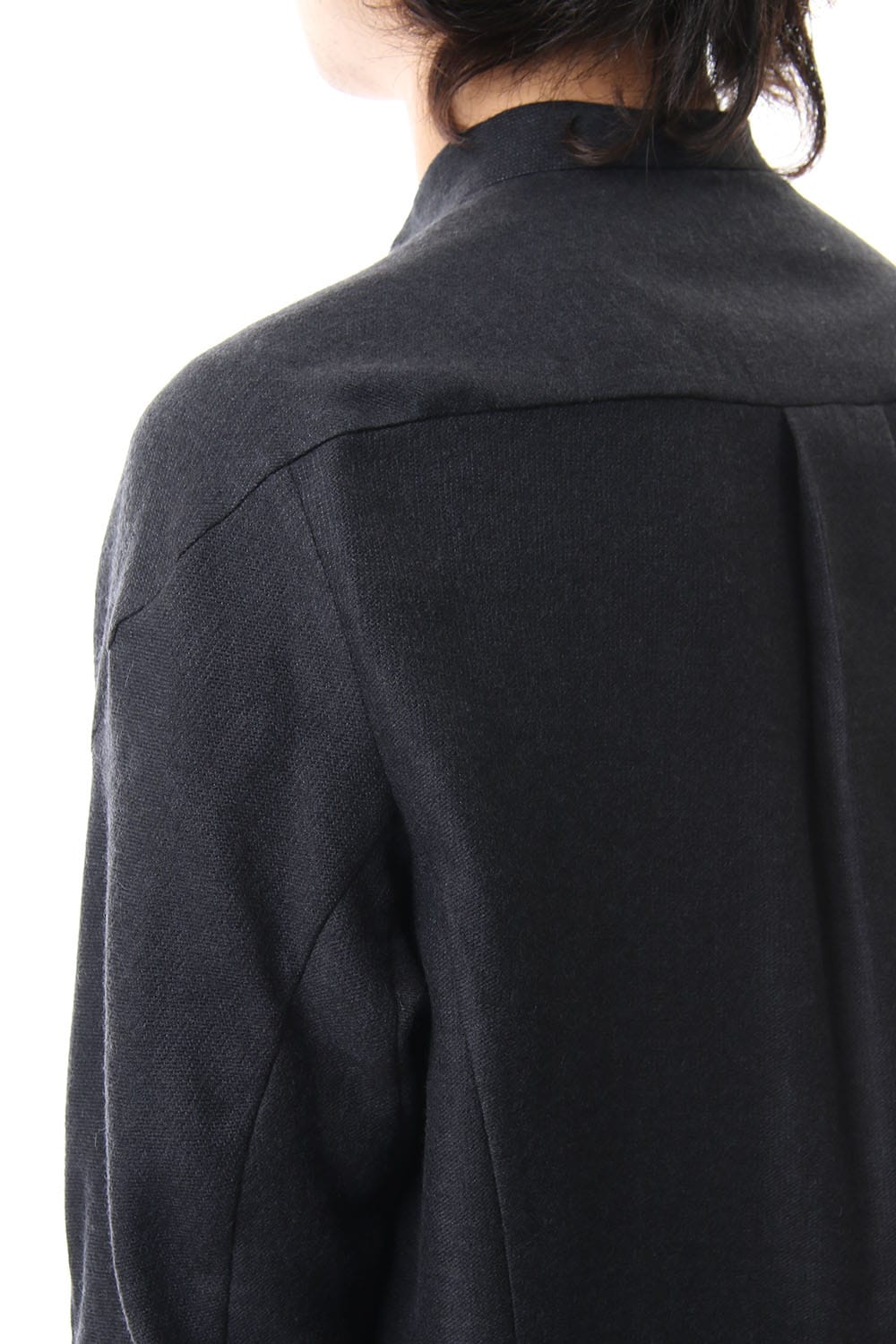 シンプルにノーカラーデザインで上からオーバーコートがレイヤード出来る様にレギュラーフィットで製作しています。生地が柔らかいので骨組みとして内側に綿テープを縫製しています。