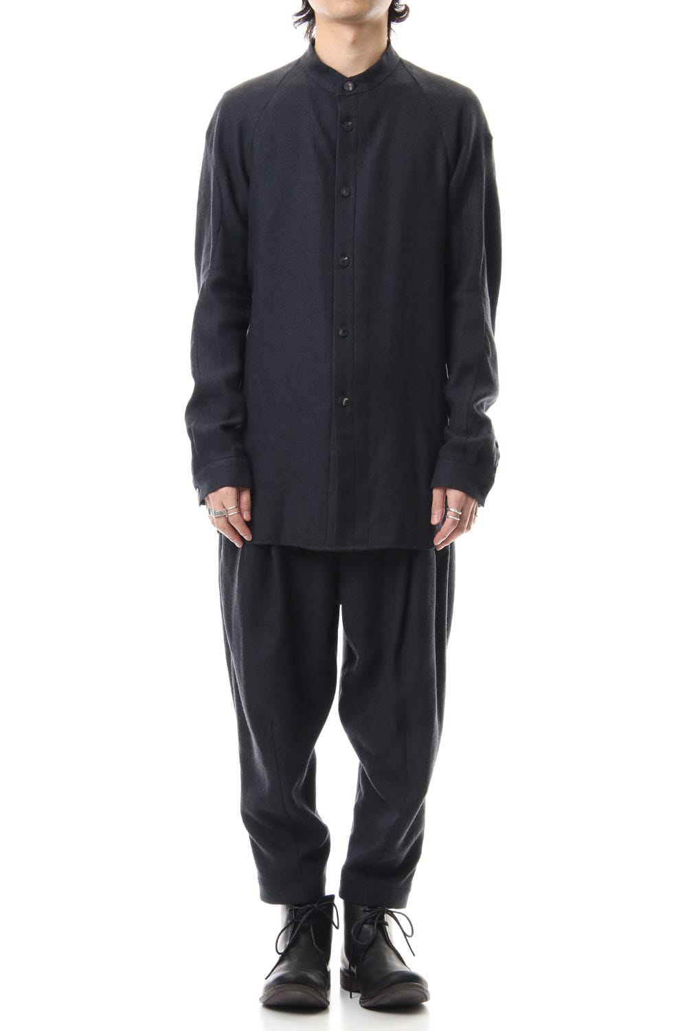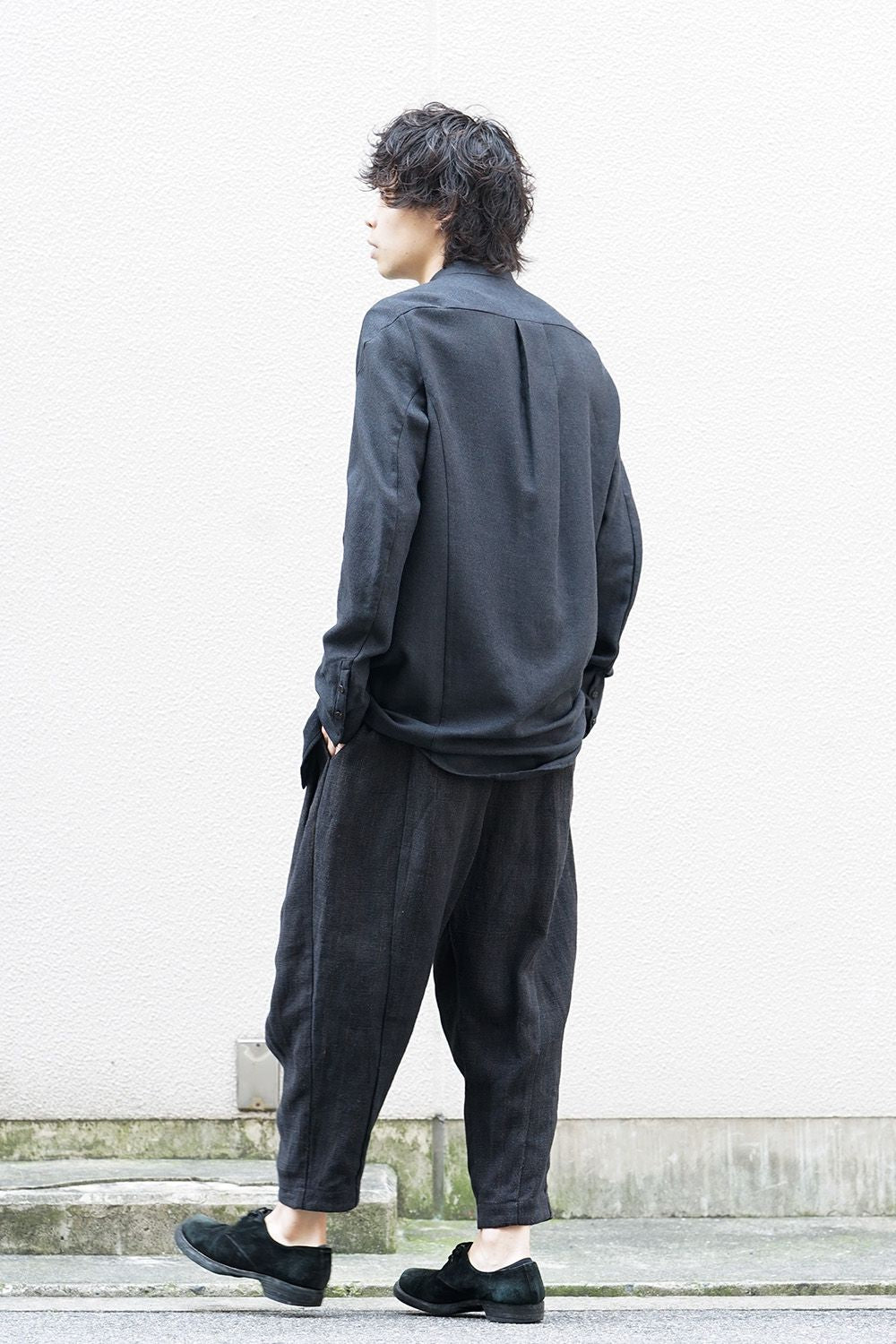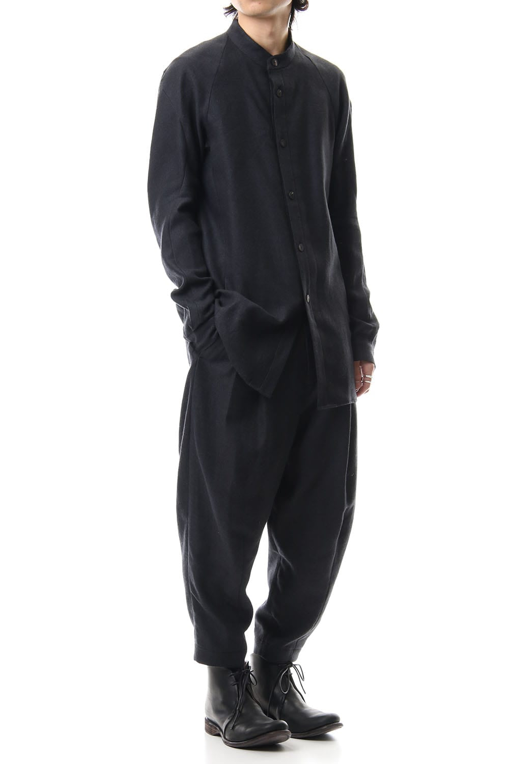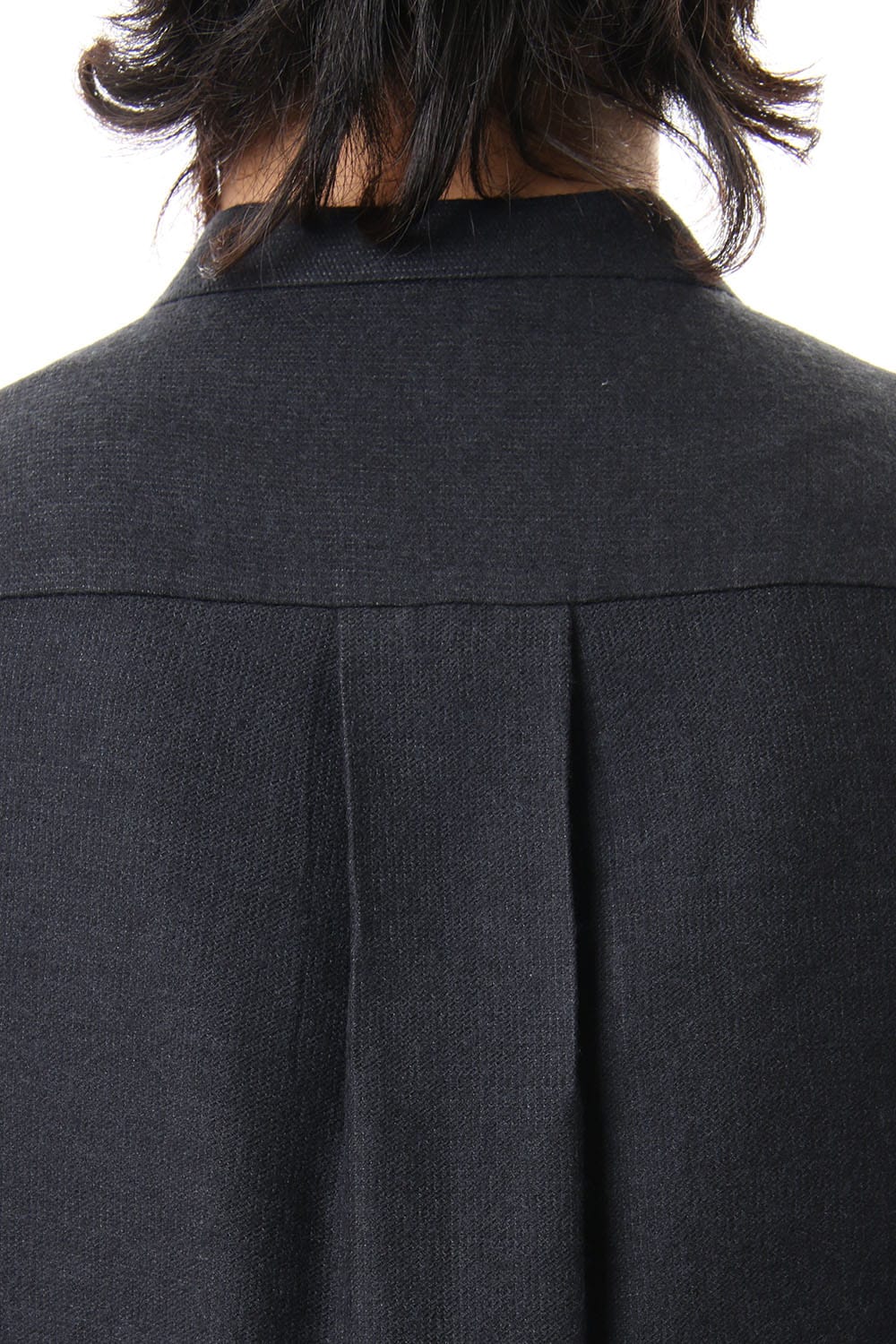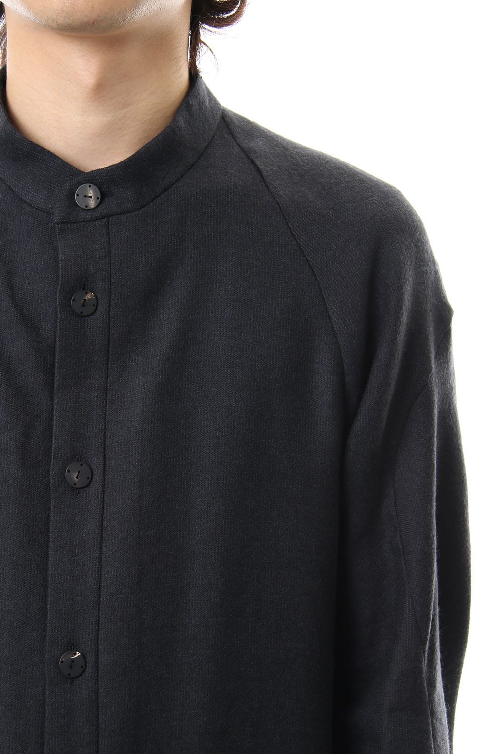 シンプルにノーカラーデザインで上からオーバーコートがレイヤード出来る様にレギュラーフィットで製作しています。生地が柔らかいので骨組みとして内側に綿テープを縫製しています。