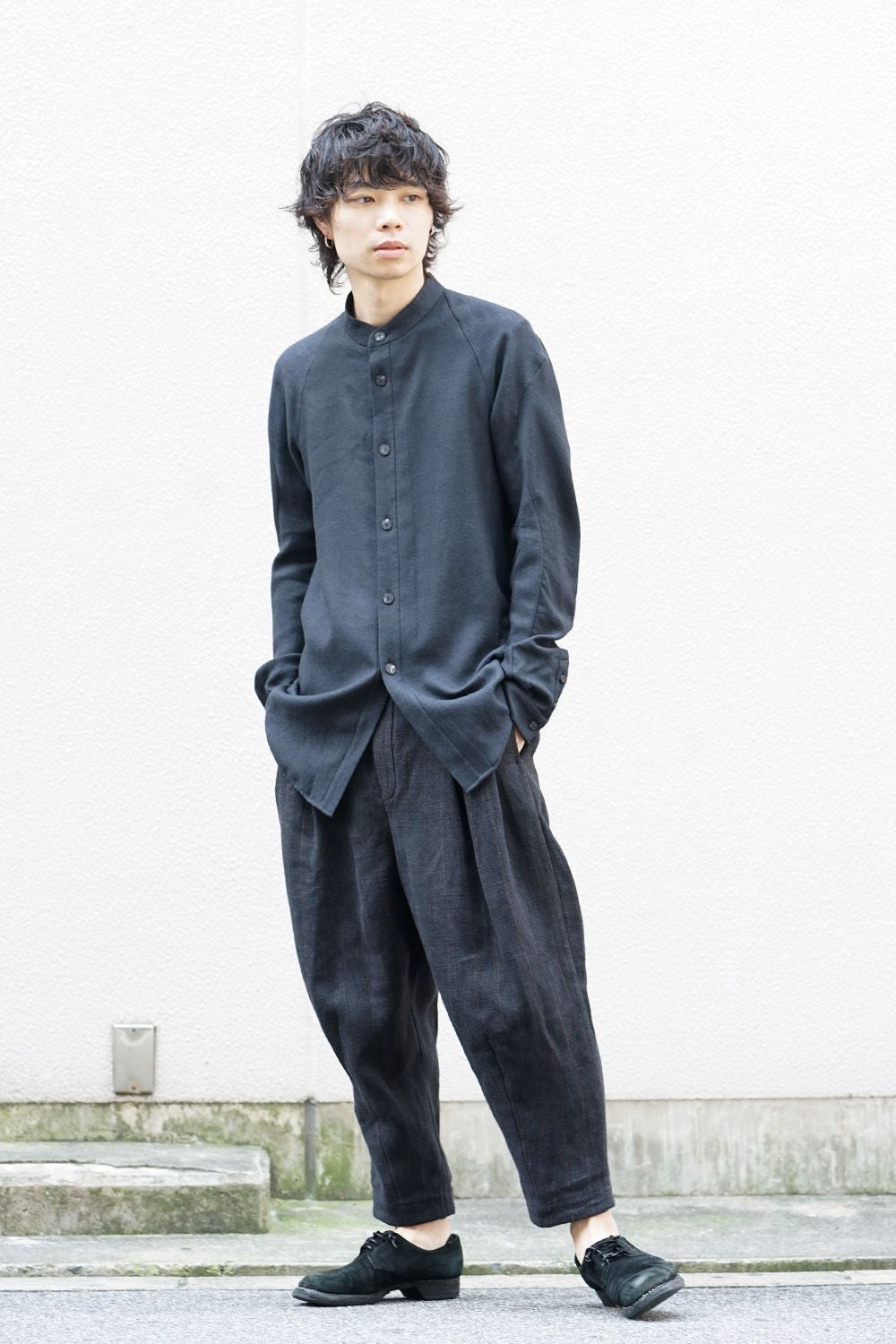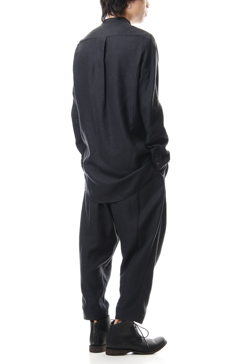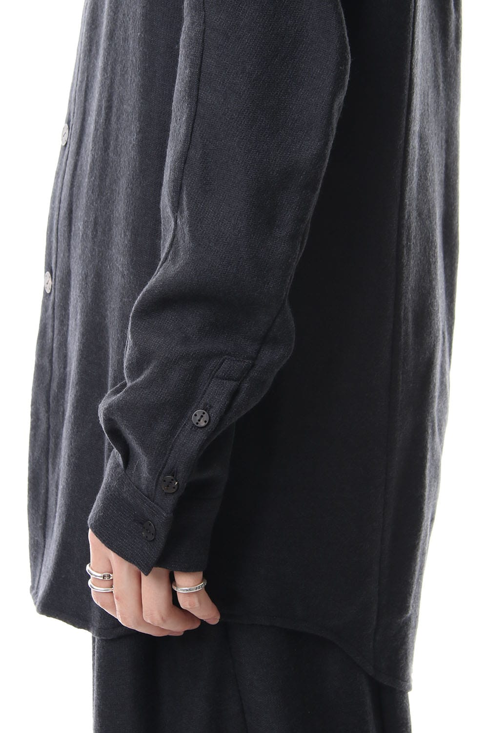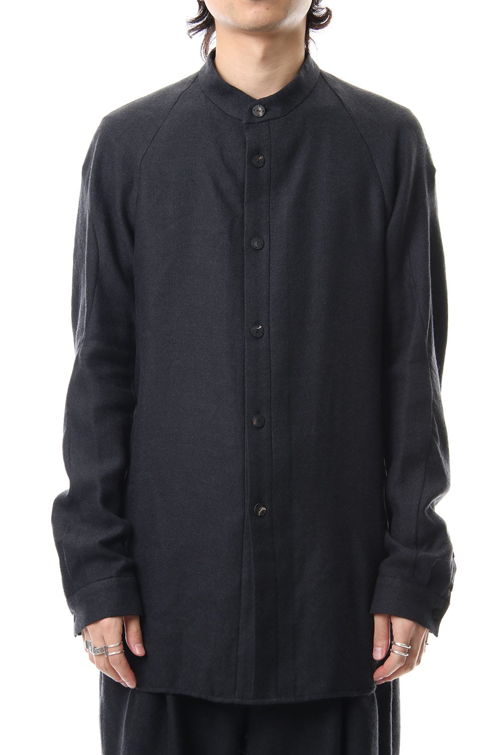 シンプルにノーカラーデザインで上からオーバーコートがレイヤード出来る様にレギュラーフィットで製作しています。生地が柔らかいので骨組みとして内側に綿テープを縫製しています。
