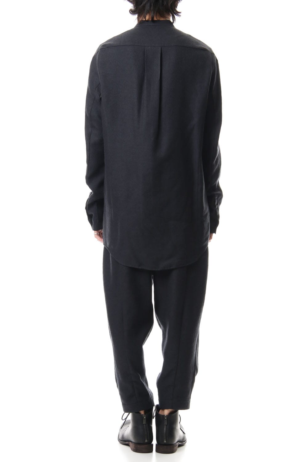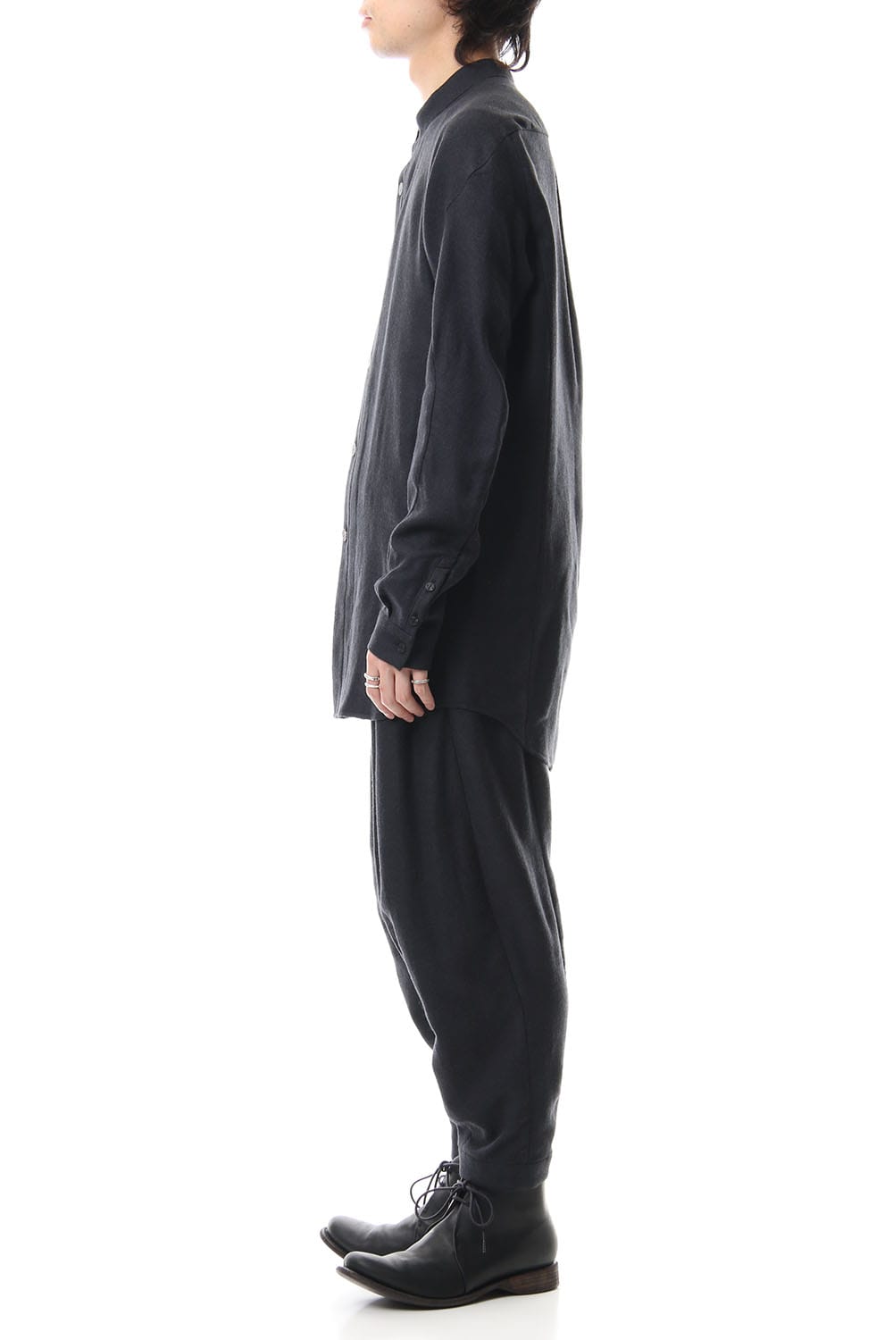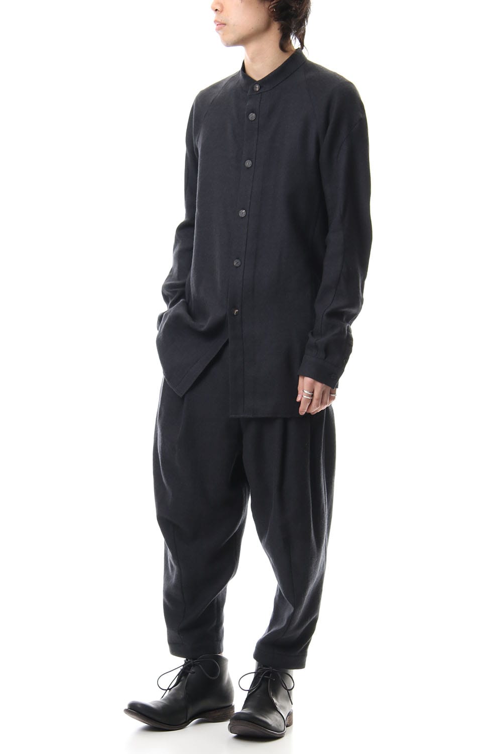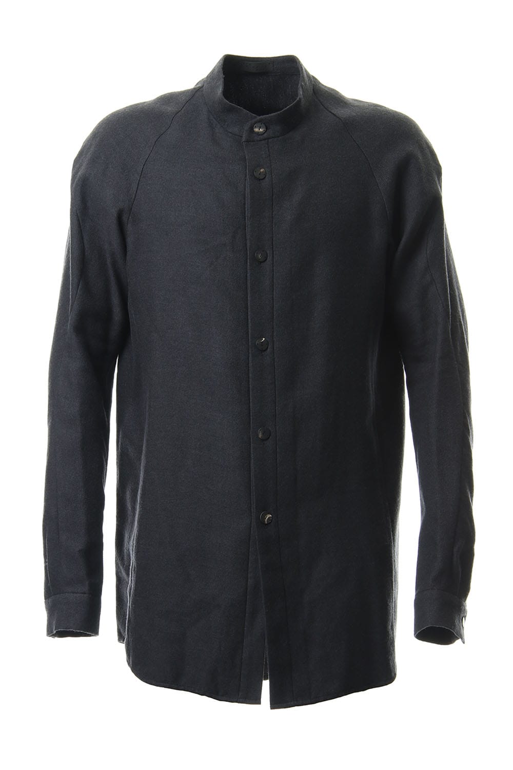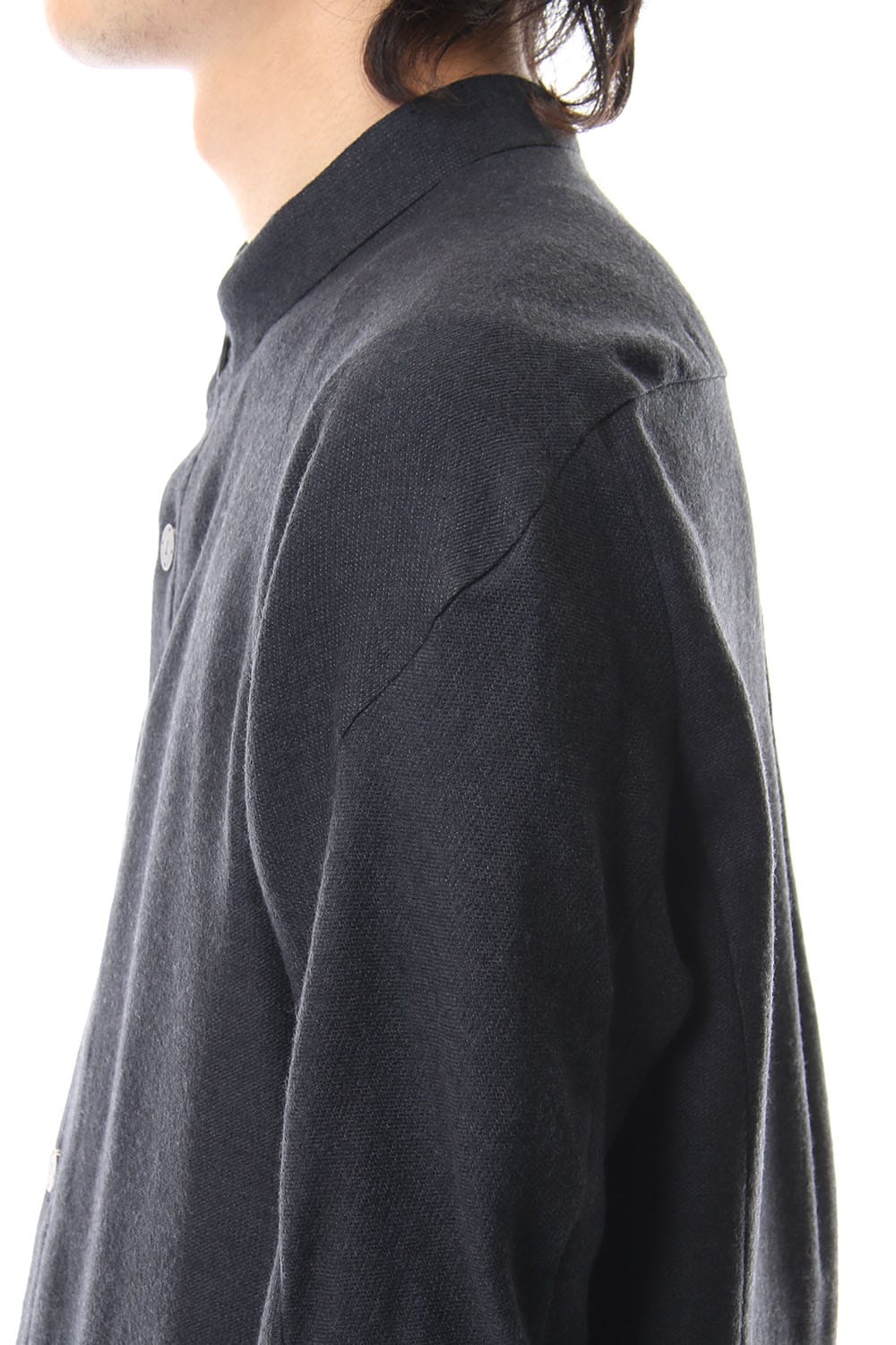 シンプルにノーカラーデザインで上からオーバーコートがレイヤード出来る様にレギュラーフィットで製作しています。生地が柔らかいので骨組みとして内側に綿テープを縫製しています。