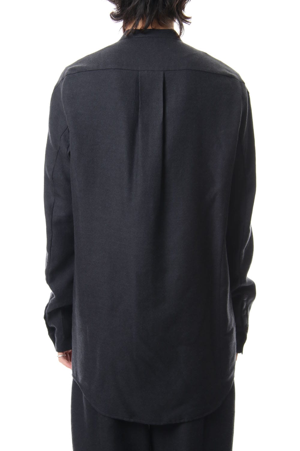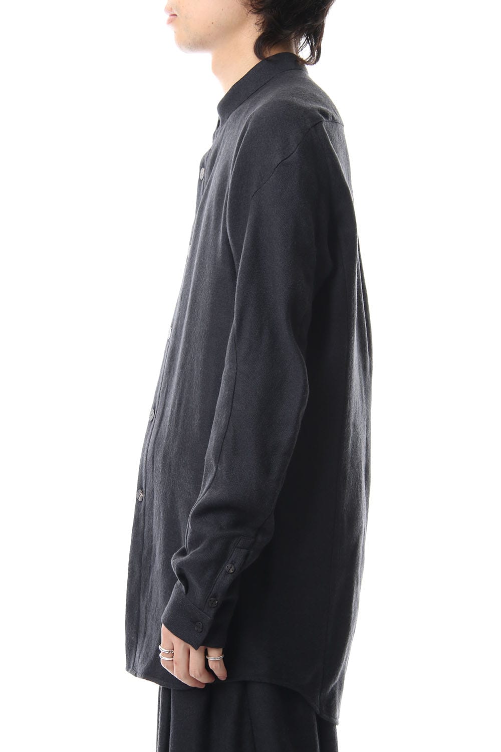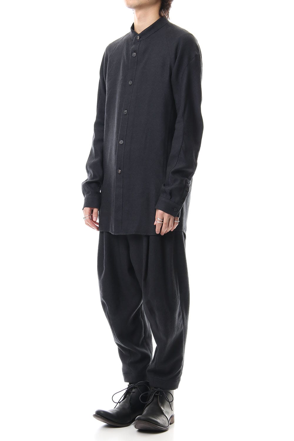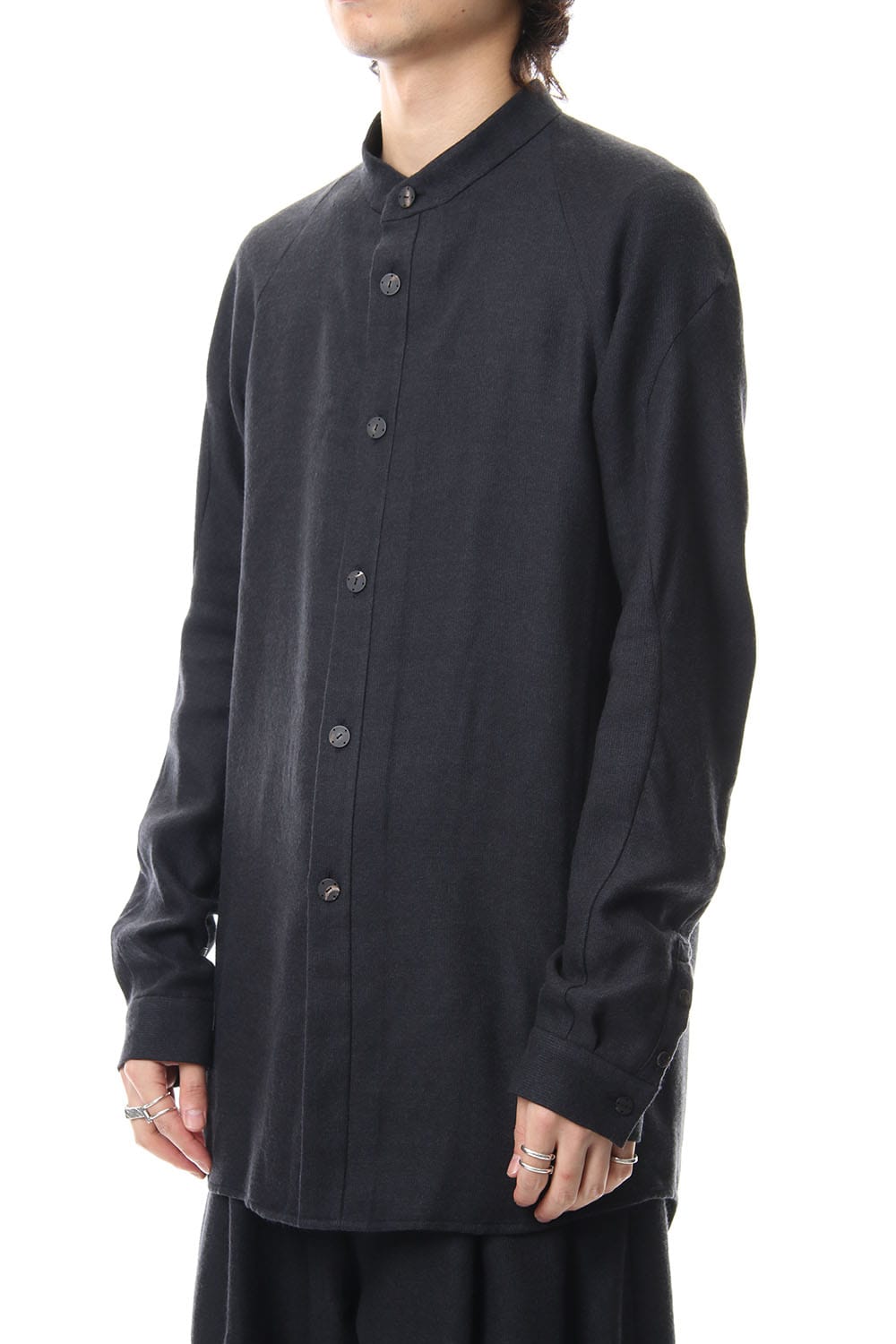シンプルにノーカラーデザインで上からオーバーコートがレイヤード出来る様にレギュラーフィットで製作しています。生地が柔らかいので骨組みとして内側に綿テープを縫製しています。