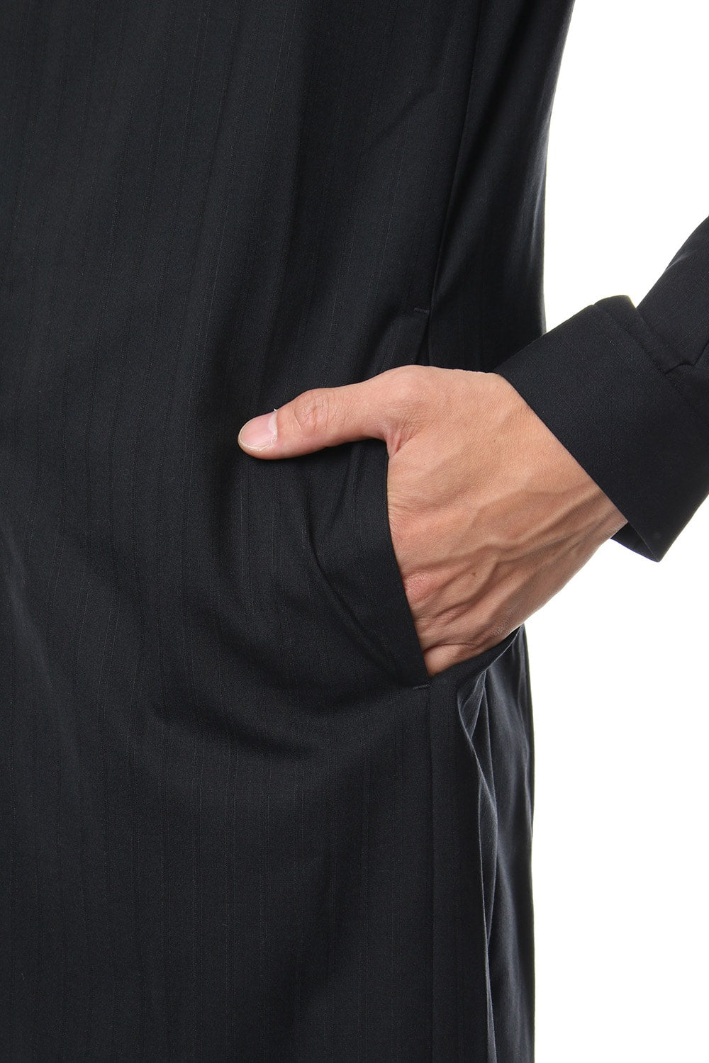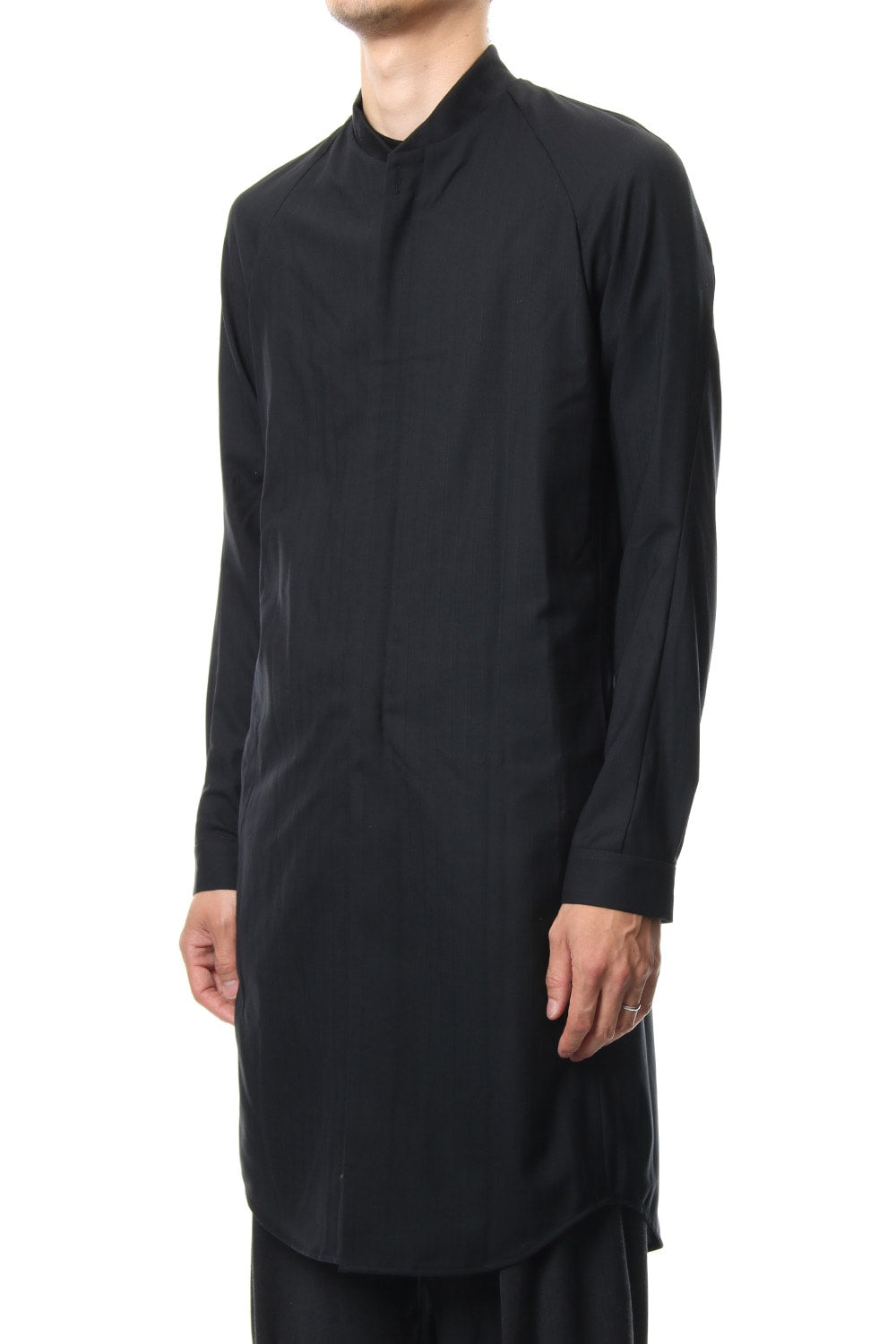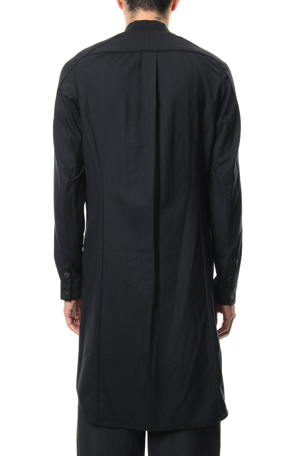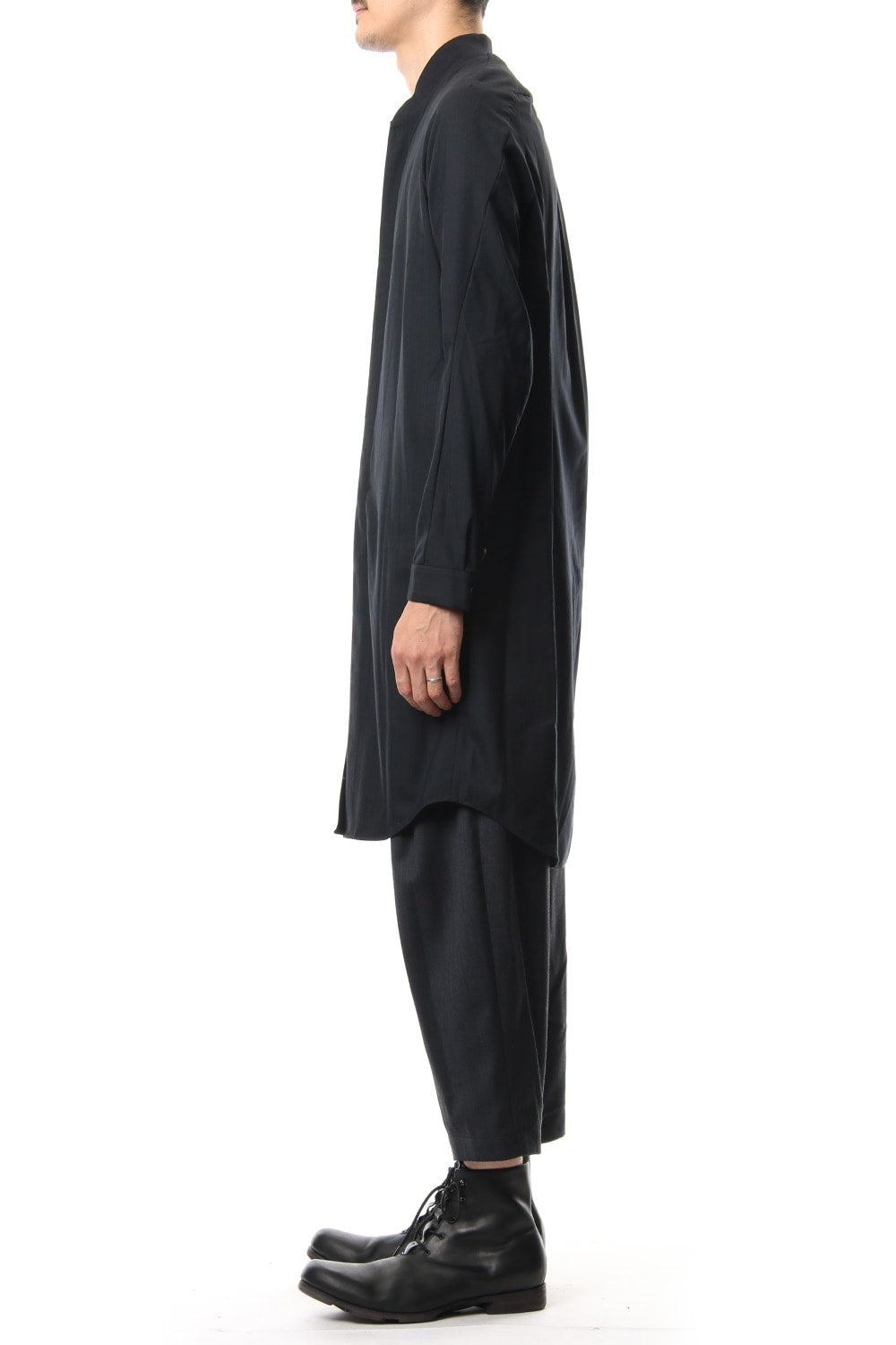 ミニマルなデザインのノーカラロングシャツです。 単品でも着用していただけますが、薄手の生地を生かして他のアイテムとレイヤードして着用できるような細身のサイズ感です。 140番手ウールの極細糸を双糸加工し、糸の撚りを強撚加工することにより、うっすらとストライプが入った上品な光沢を持つ、ナチュラルストレッチ生地に仕上げています。 前はジップアップになっており、一番上と下がボタンになっています。