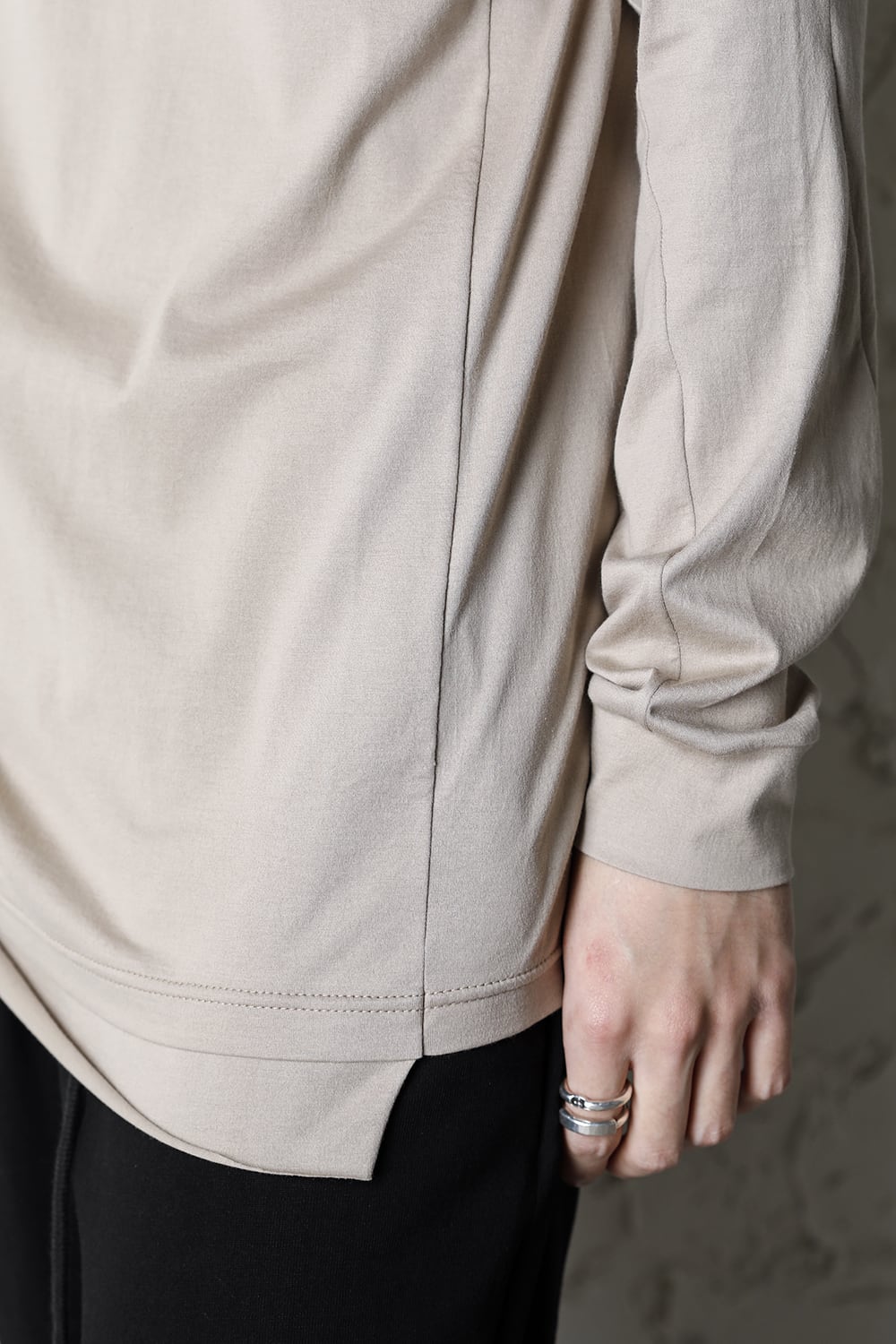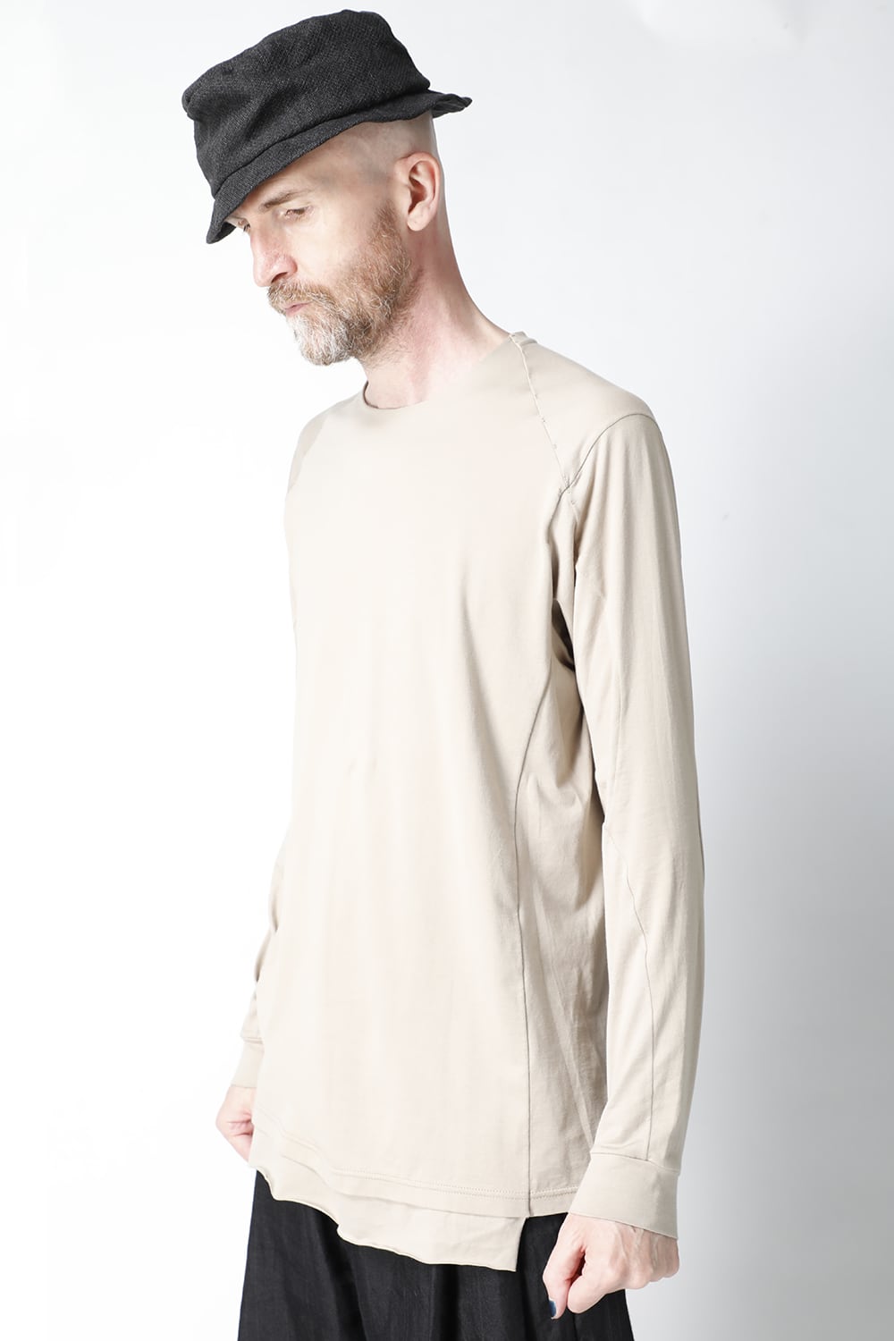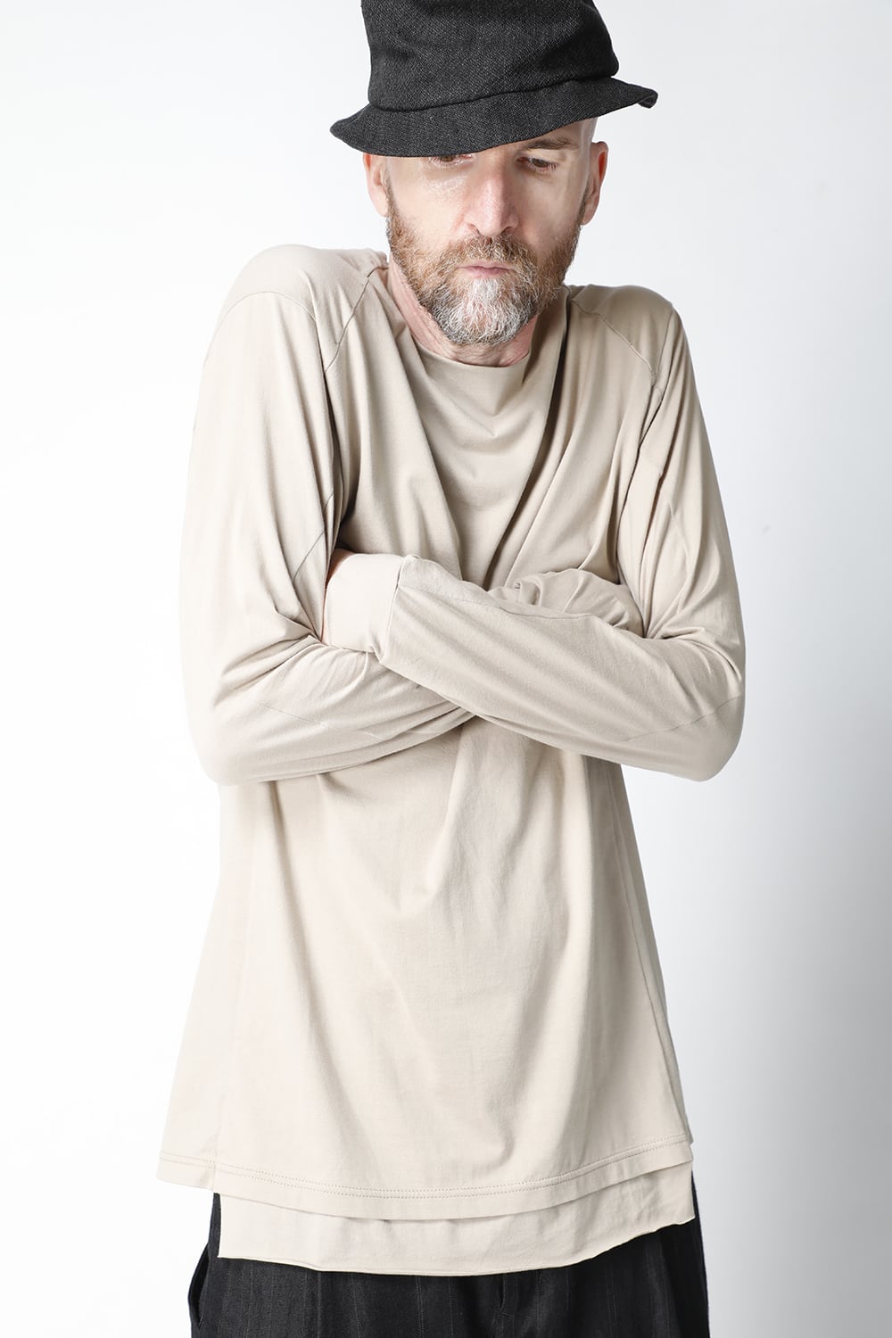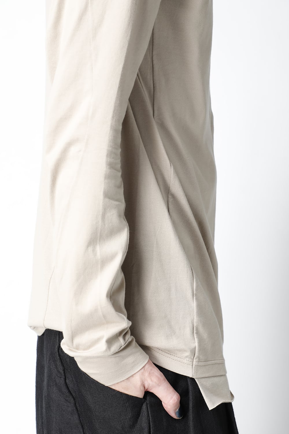エジプトの最高級コットン、 SUVIN(スビン)綿を100番手で2本撚りにして天竺組織で制作。 光沢感ときめの細かい滑らかな肌触りが人気で、毎シーズンリピーターの多い生地です。 前身頃のみ2 重で制作し、内側の生地を長く取ってレイヤード風にしたデザインになっています。仕上げに独自の柔軟加工を施してあり、洗濯で取れにくく、継続的に柔らかい風合いを保つことができます。カラーはブラックとライトベージュの2色展開。