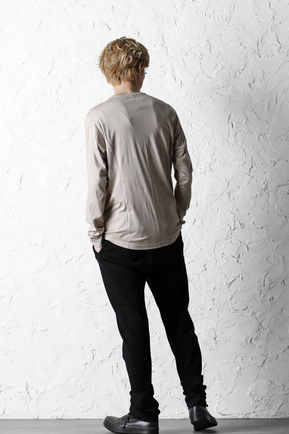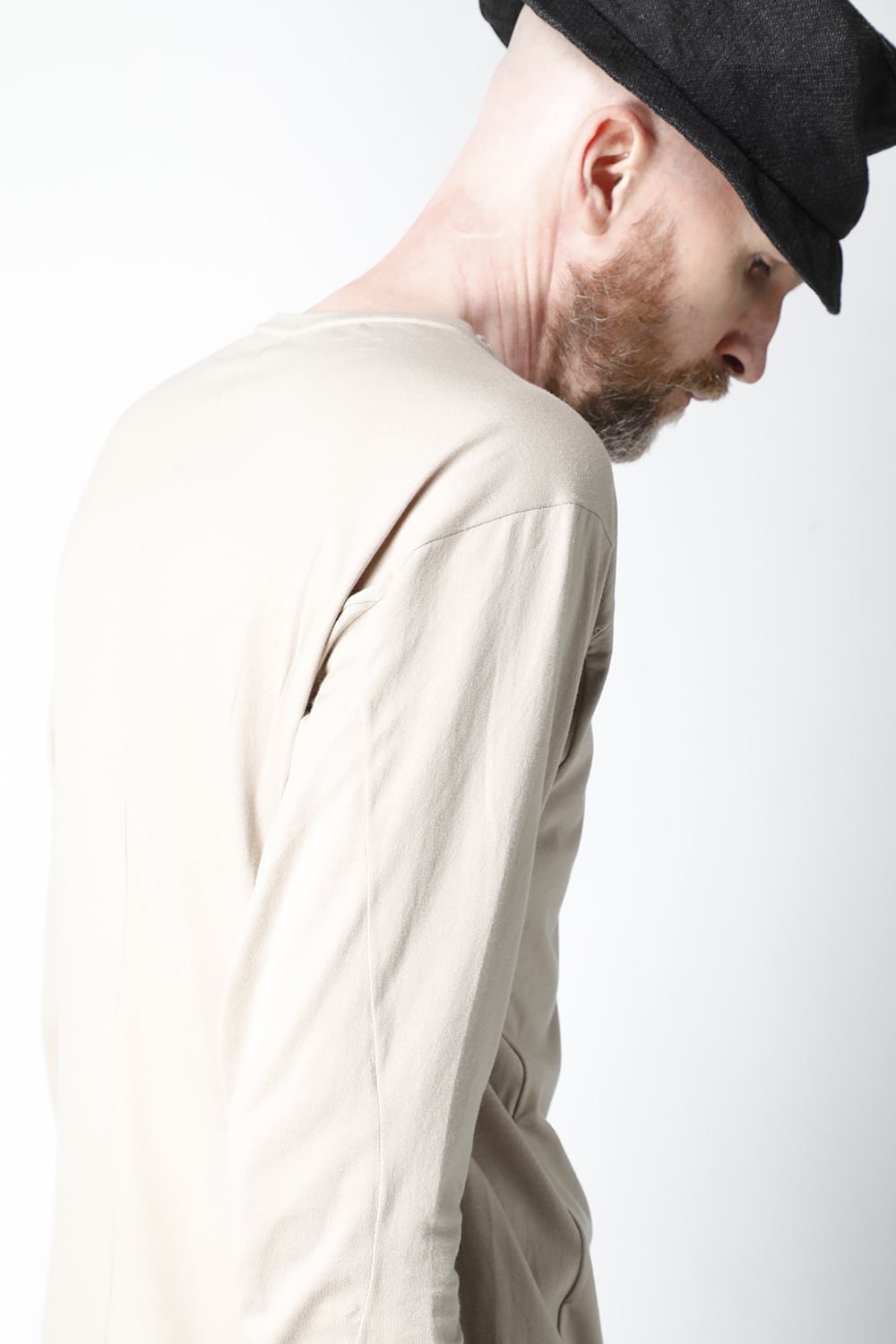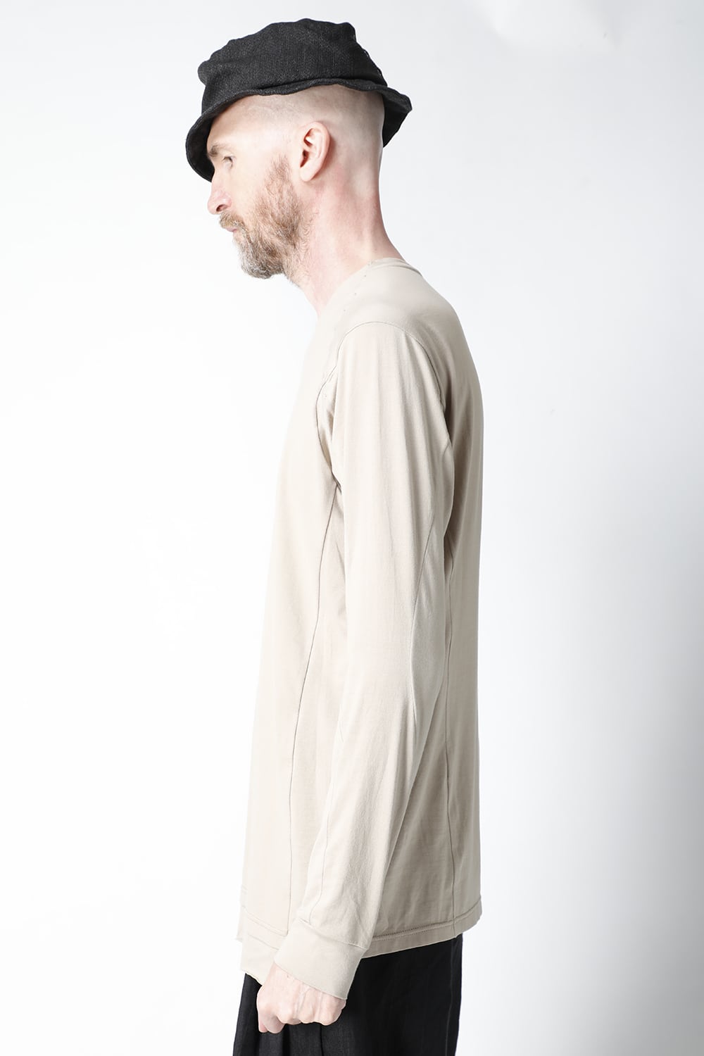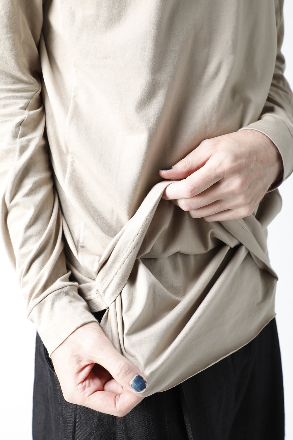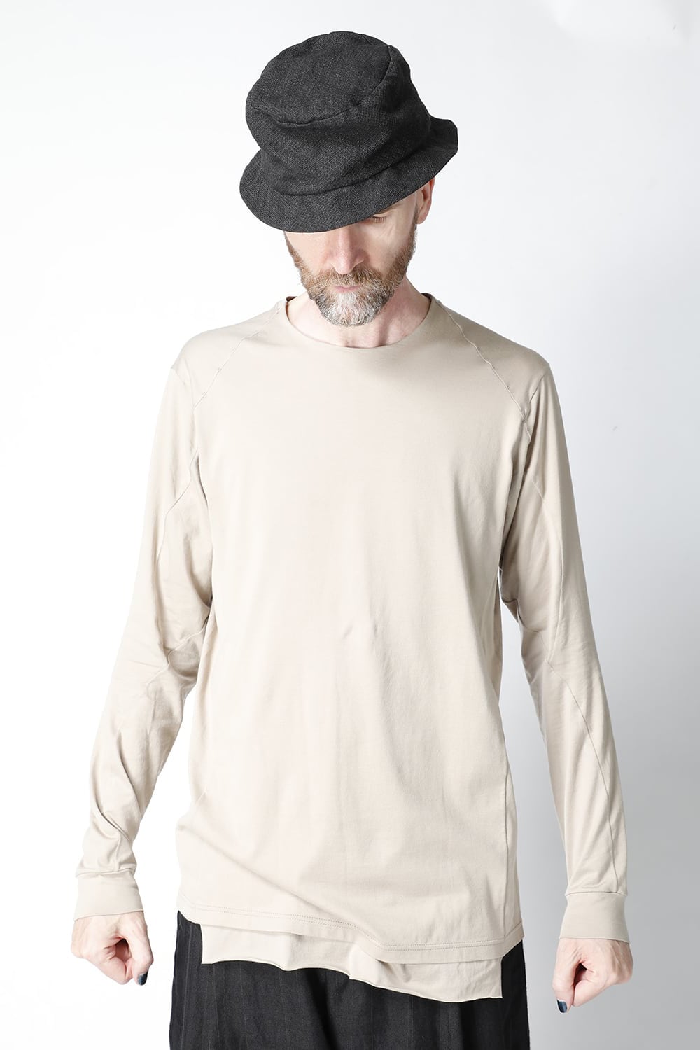 エジプトの最高級コットン、 SUVIN(スビン)綿を100番手で2本撚りにして天竺組織で制作。 光沢感ときめの細かい滑らかな肌触りが人気で、毎シーズンリピーターの多い生地です。 前身頃のみ2 重で制作し、内側の生地を長く取ってレイヤード風にしたデザインになっています。仕上げに独自の柔軟加工を施してあり、洗濯で取れにくく、継続的に柔らかい風合いを保つことができます。カラーはブラックとライトベージュの2色展開。
