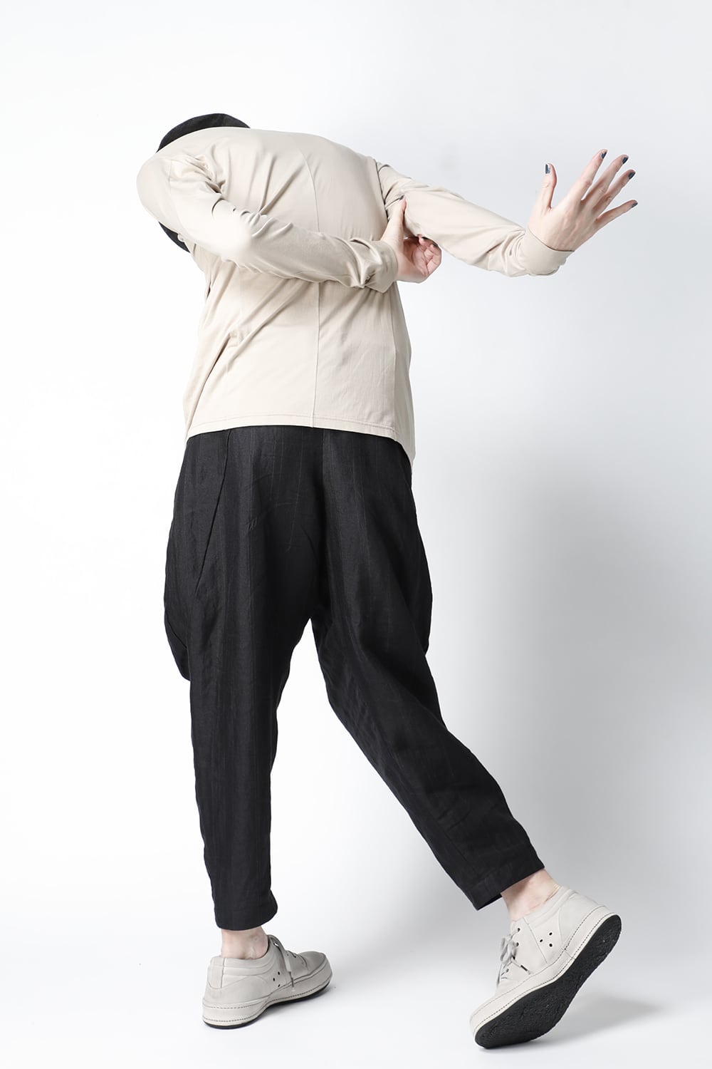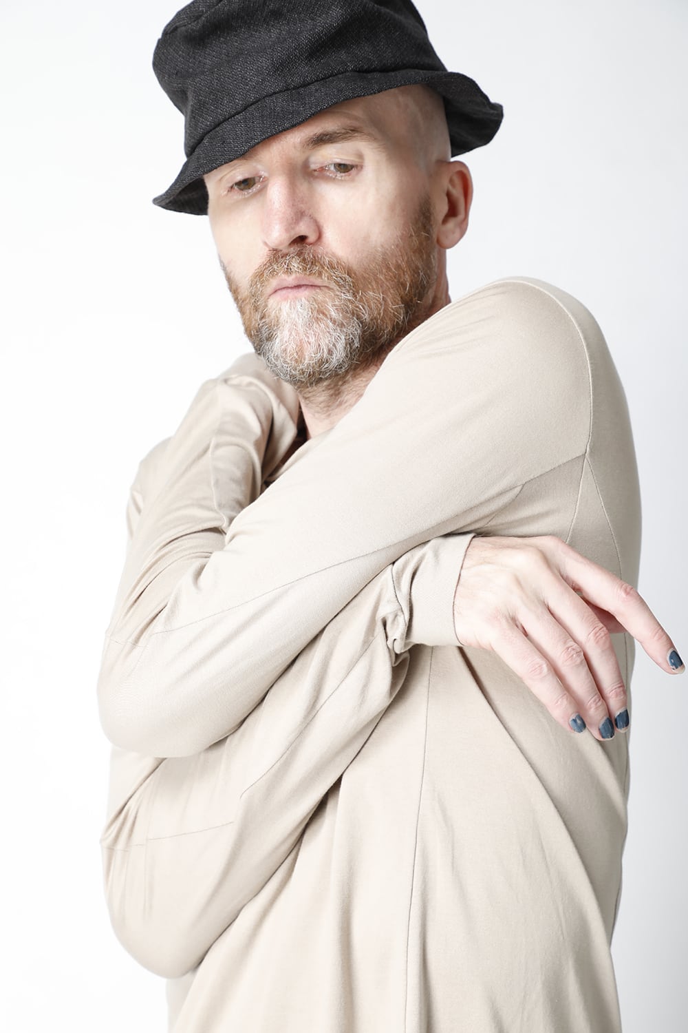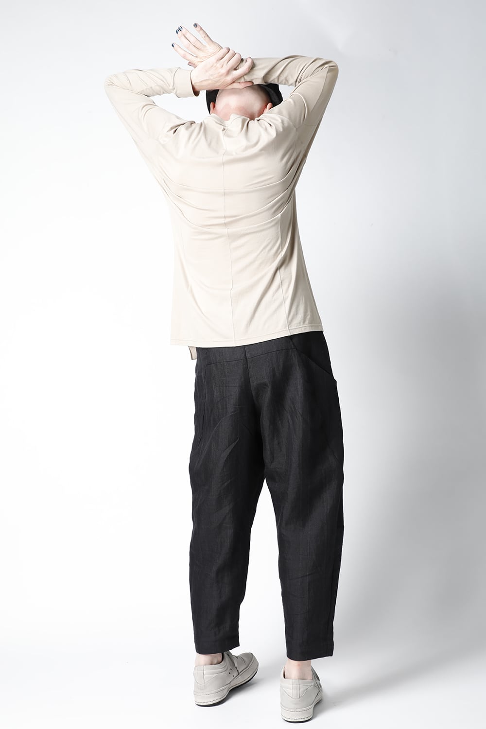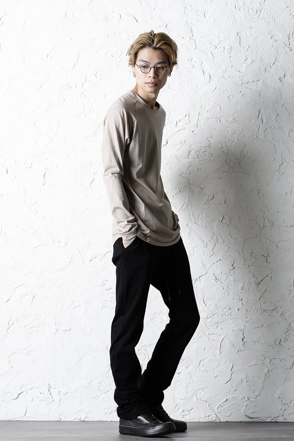 エジプトの最高級コットン、 SUVIN(スビン)綿を100番手で2本撚りにして天竺組織で制作。 光沢感ときめの細かい滑らかな肌触りが人気で、毎シーズンリピーターの多い生地です。 前身頃のみ2 重で制作し、内側の生地を長く取ってレイヤード風にしたデザインになっています。仕上げに独自の柔軟加工を施してあり、洗濯で取れにくく、継続的に柔らかい風合いを保つことができます。カラーはブラックとライトベージュの2色展開。