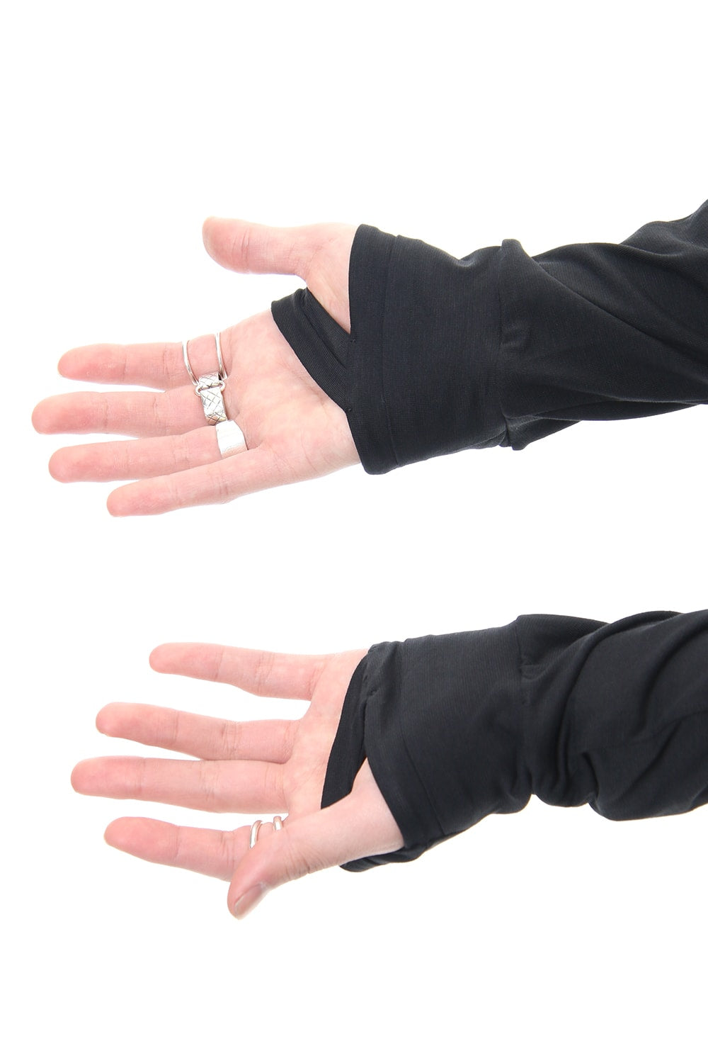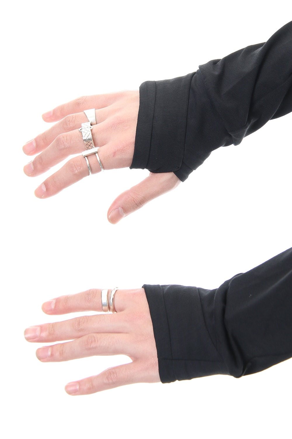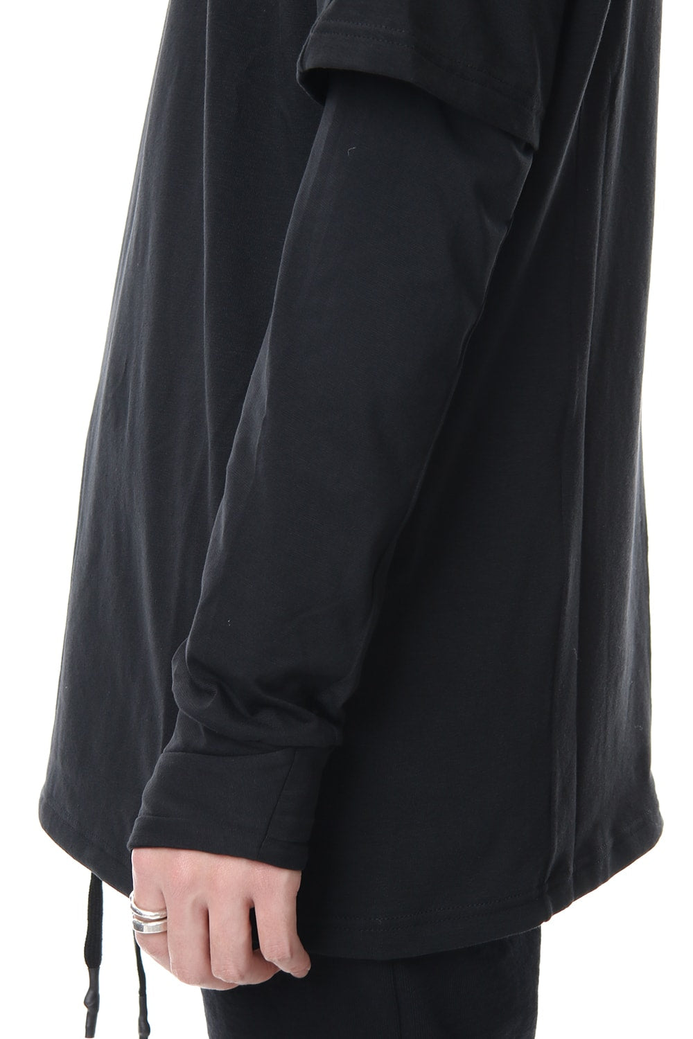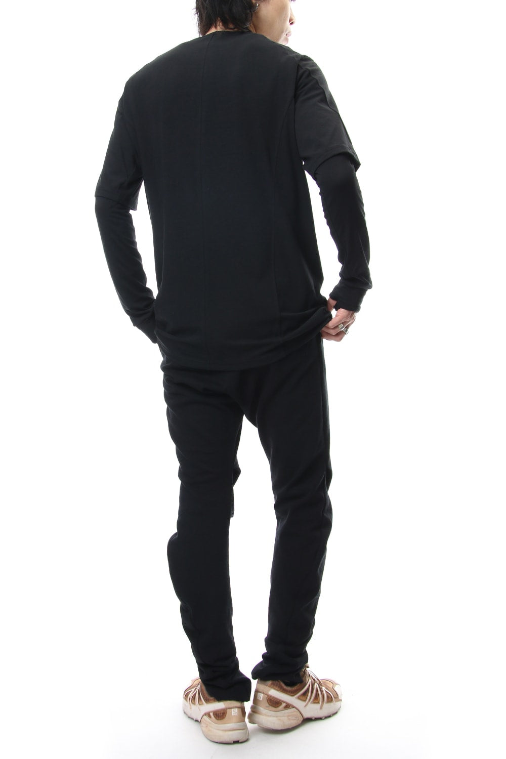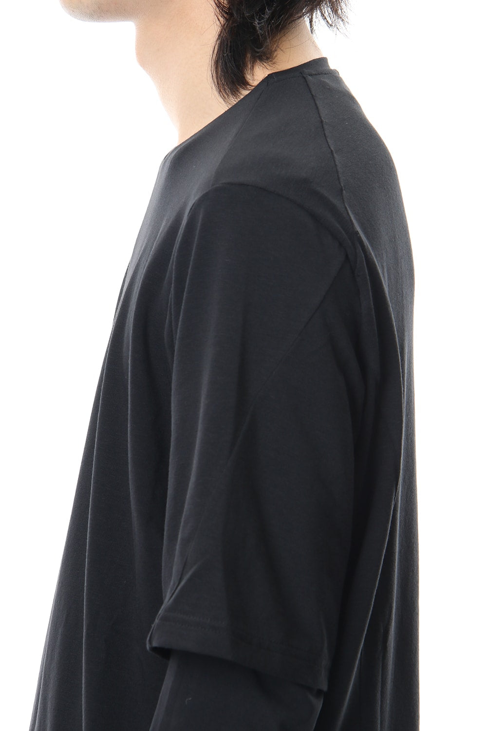 半袖と長袖をフェイクレイヤードしたカットソーは、半袖本体はコットンと麻の一種であるカナパとエラスタンを撚糸して天竺組織を制作。