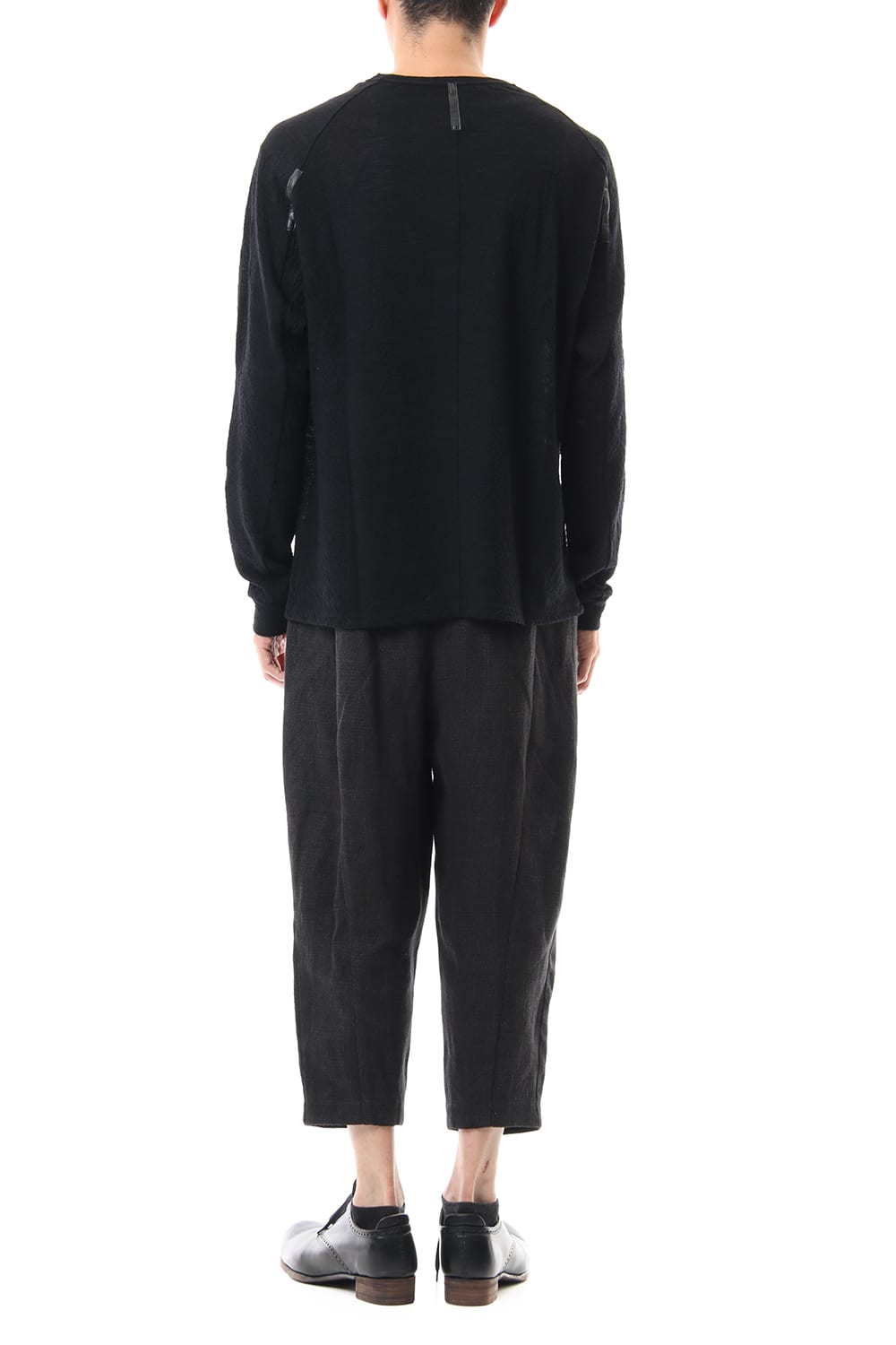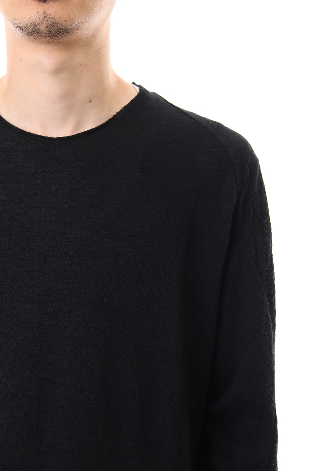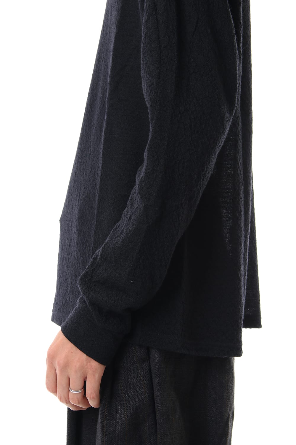 ウールとアルパカの異なる性質と糸の太さが違う事と縮絨加工によって独特の素材感を表現しています。