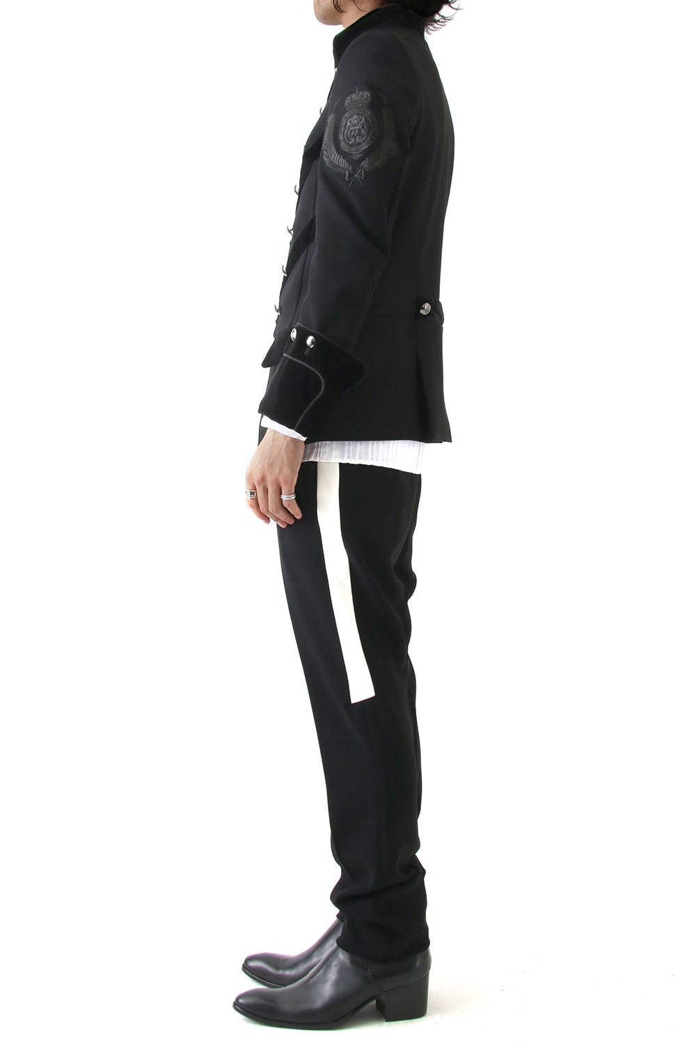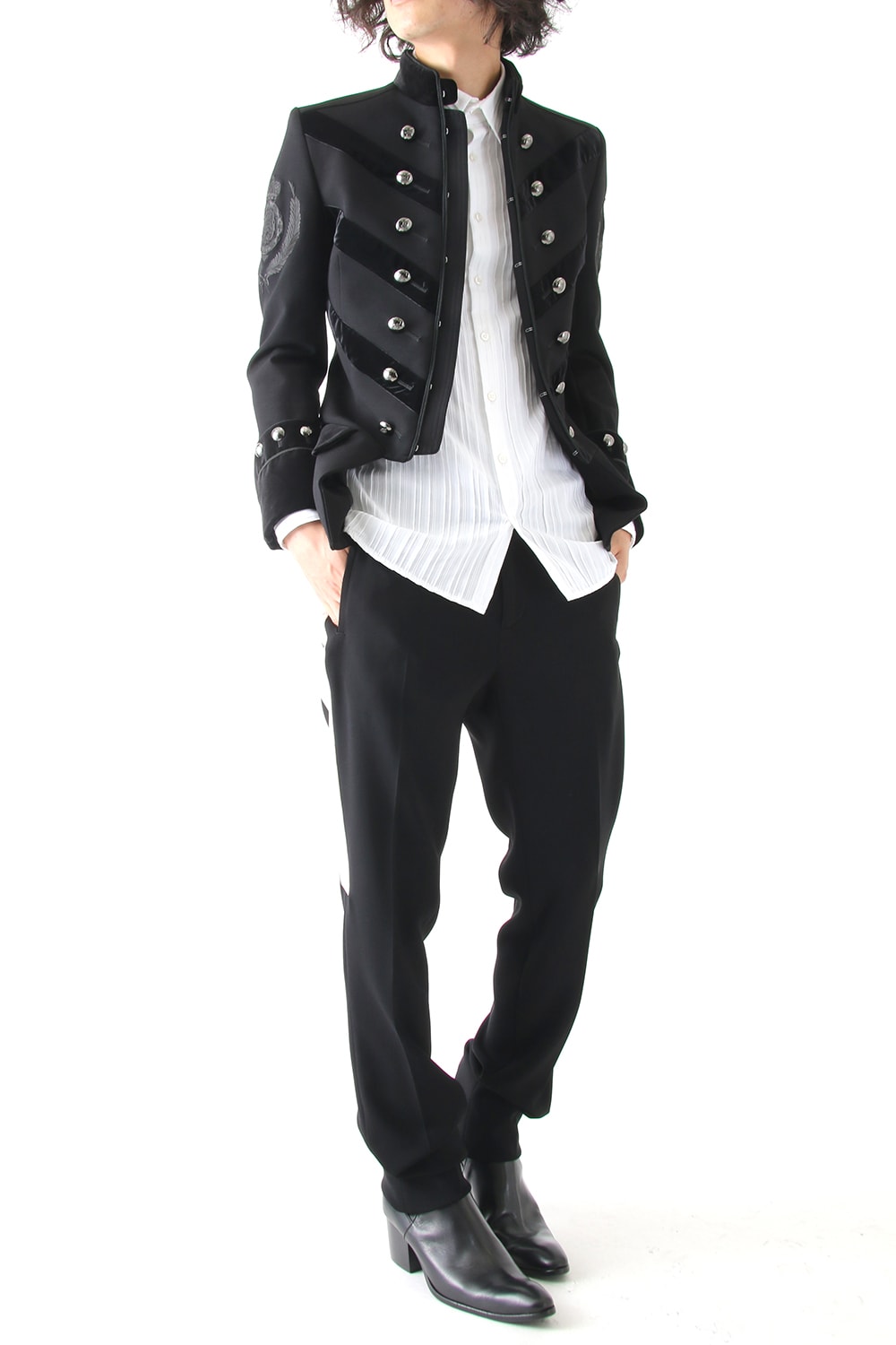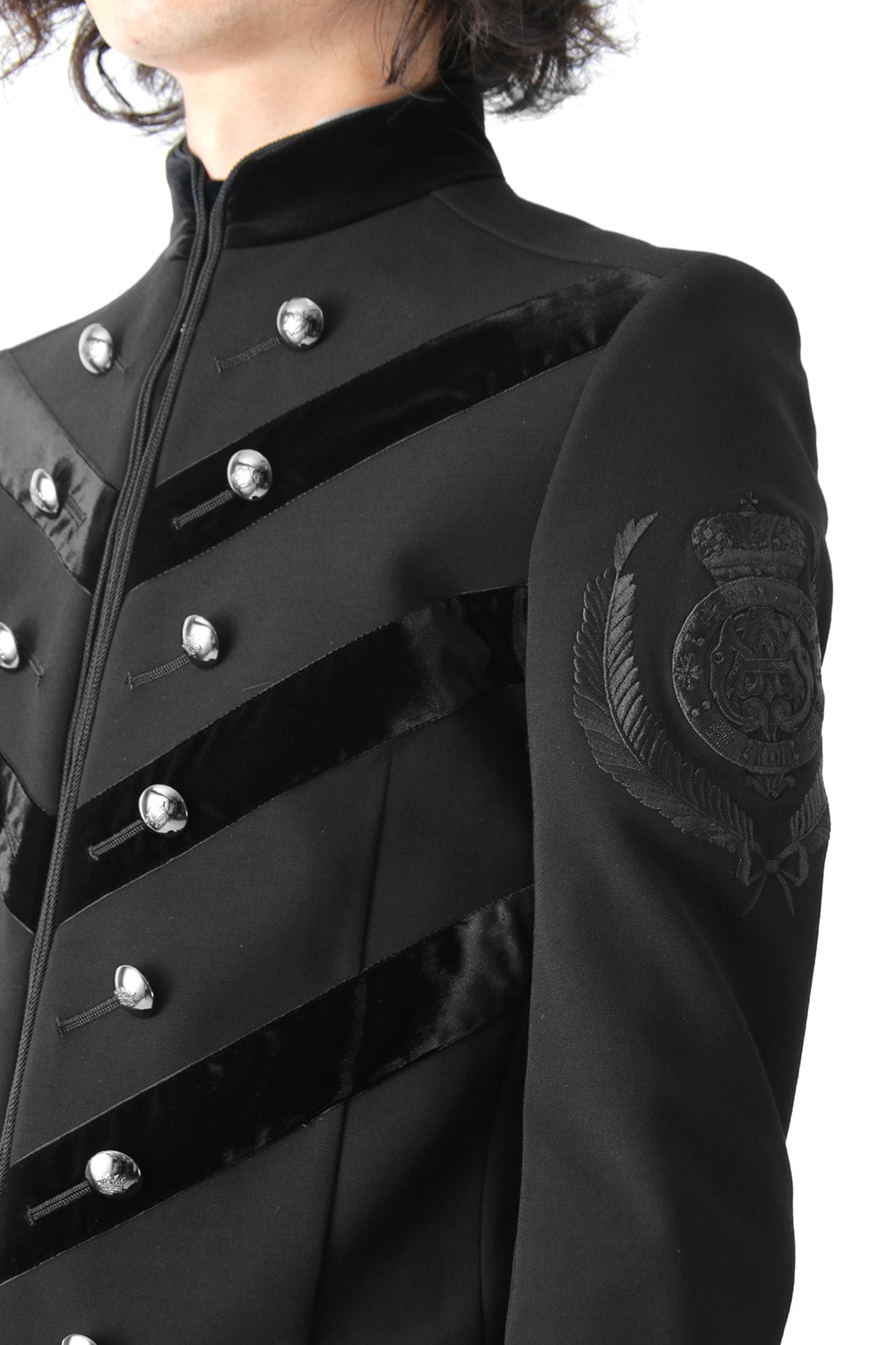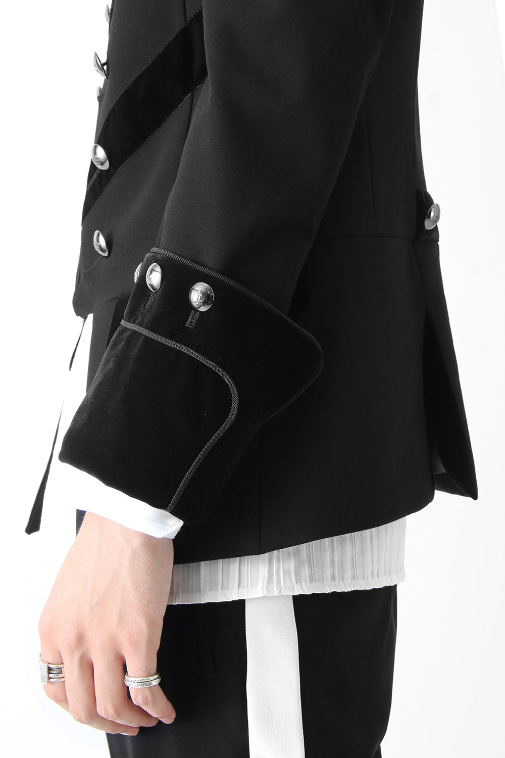 キックバックの強い、ストレッチ素材と装飾部分はベロアの切り替えを施した優雅なナポレオンジャケット。