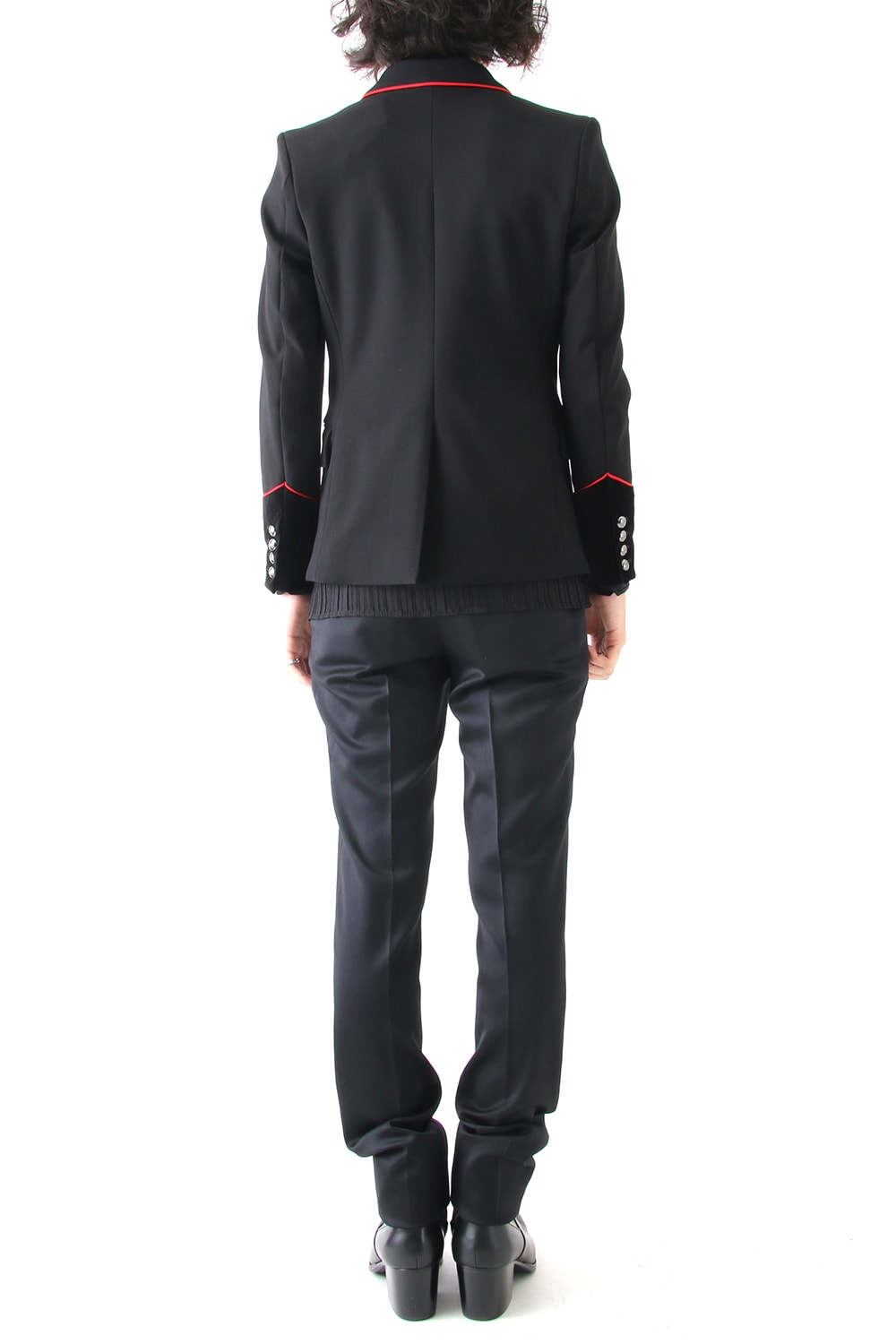 キックバックの強い、ストレッチ素材と襟と袖口はベロアの切り替えを施した優雅なテーラードジャケット。