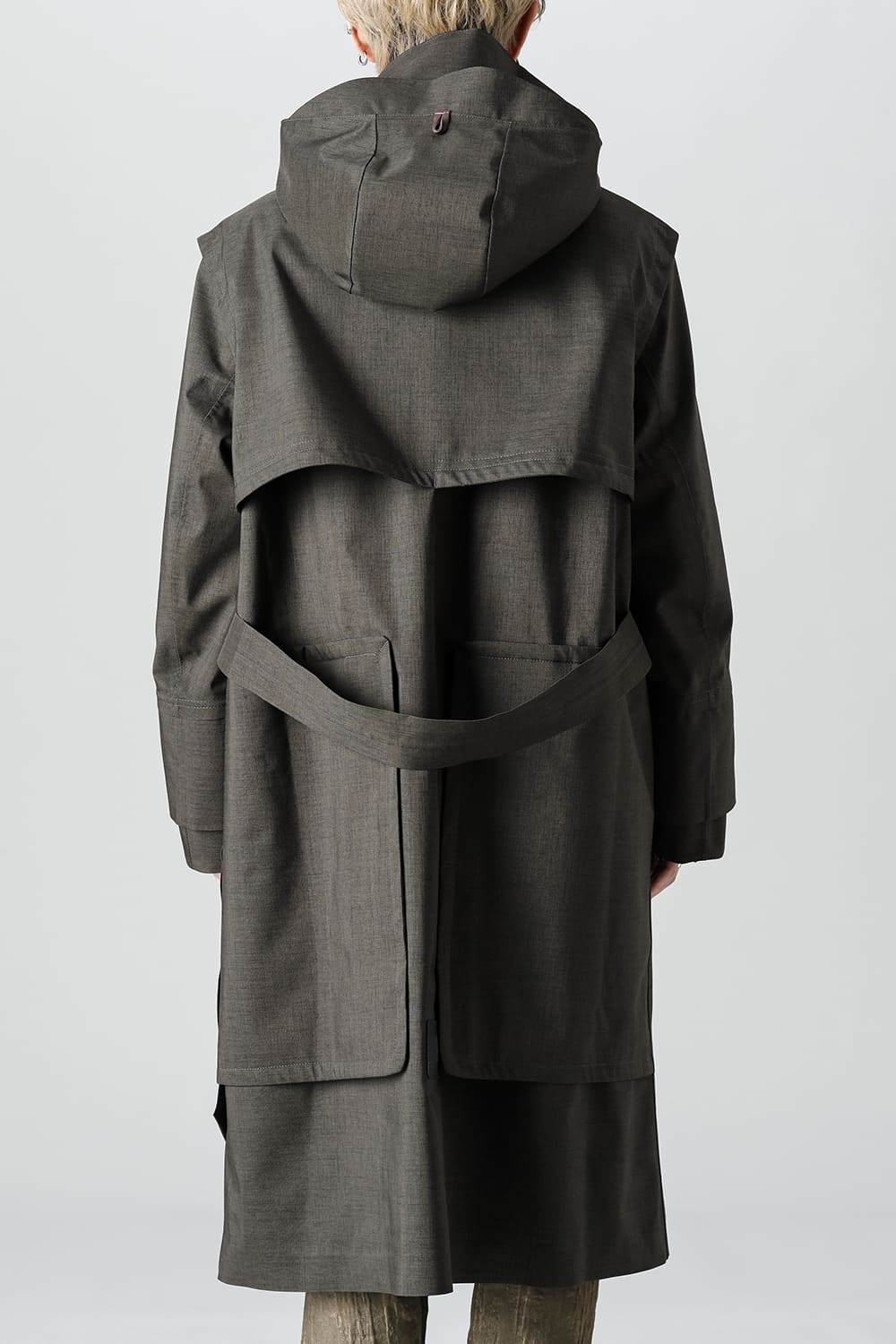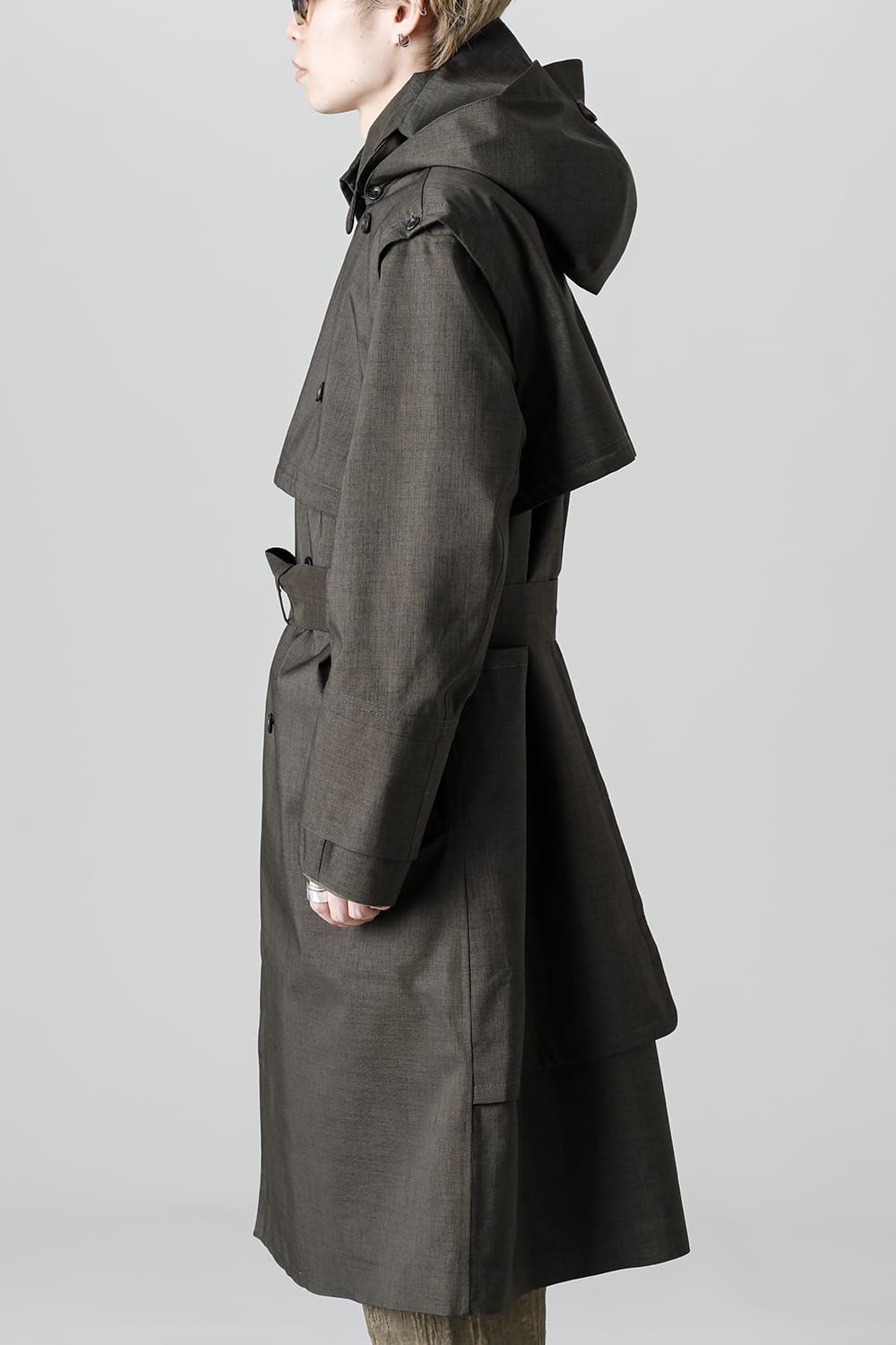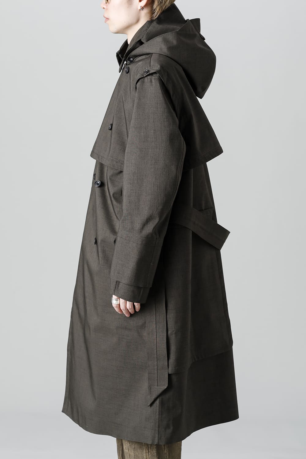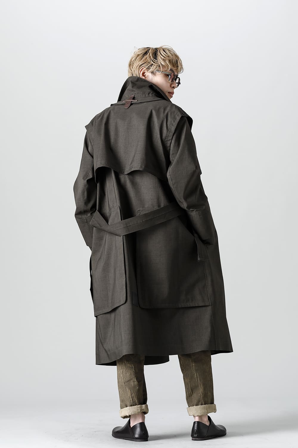 ウエストベルトを縛って着用する事で、ストームシールドとアンブレラヨークがグッと立ち上がるメリハリのあるシルエットがカッコ良い コートですが、単にデザイン的ディテールというわけではなく、肩から伝った雨の雫が身頃にかかる前に滑り落ちるアンブレラヨークの本来の役割も果たしています。