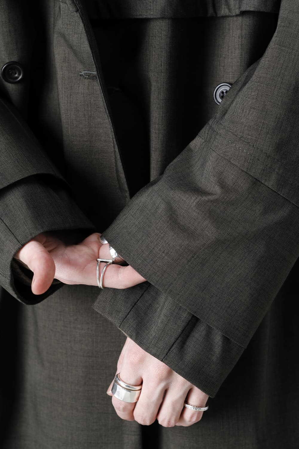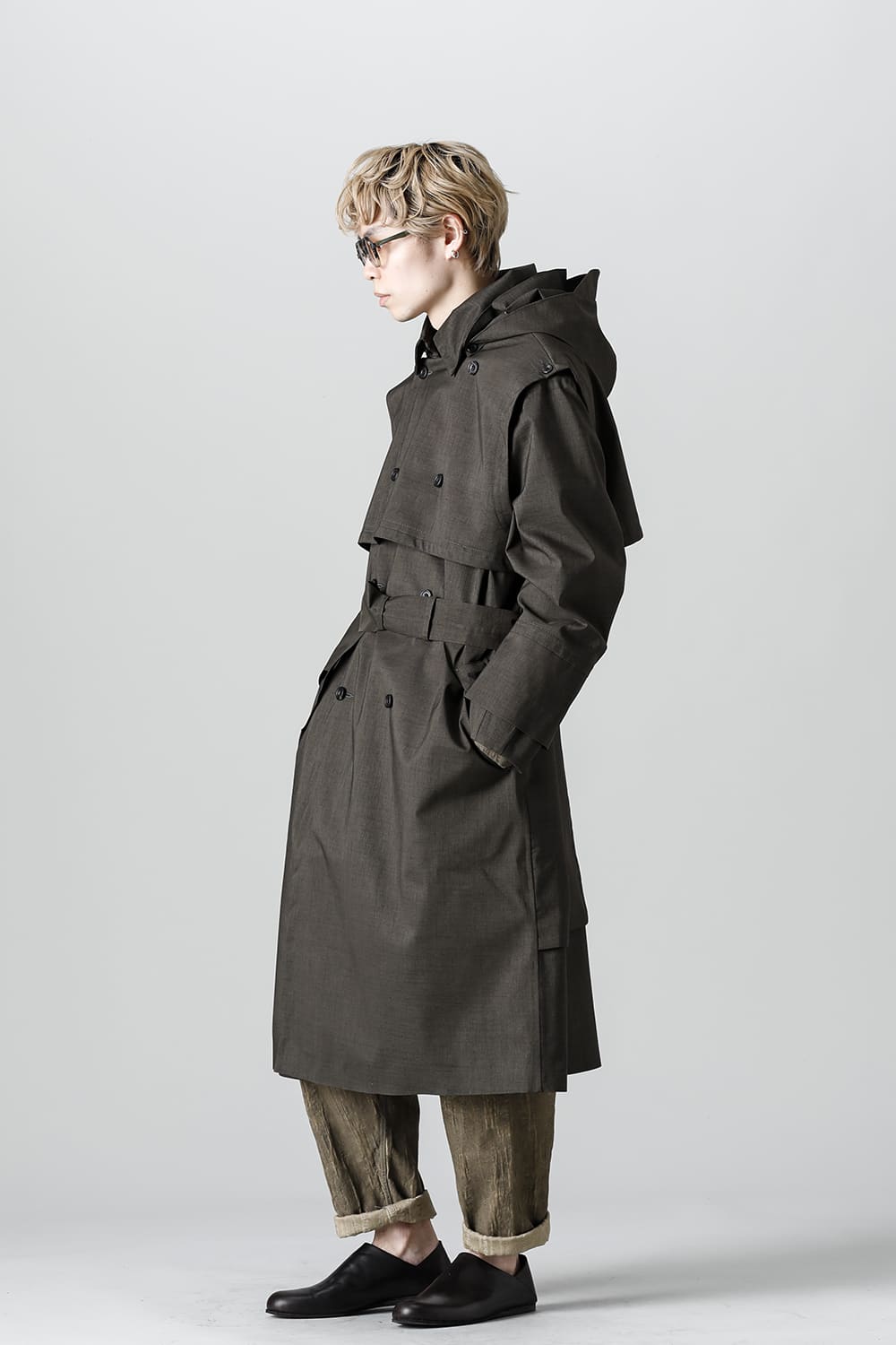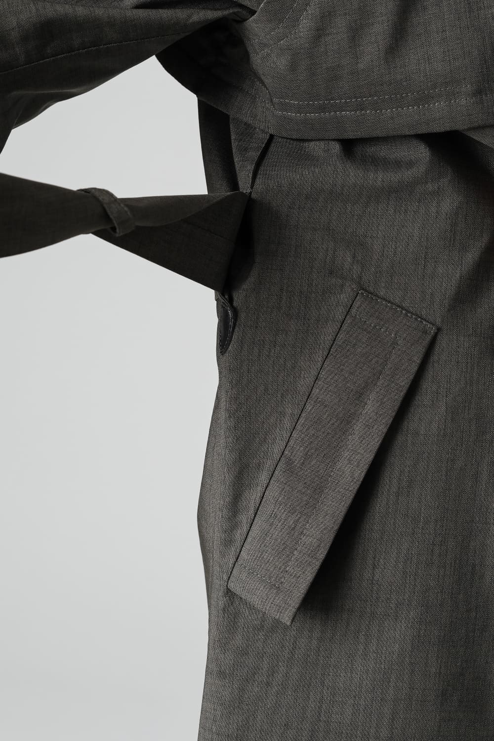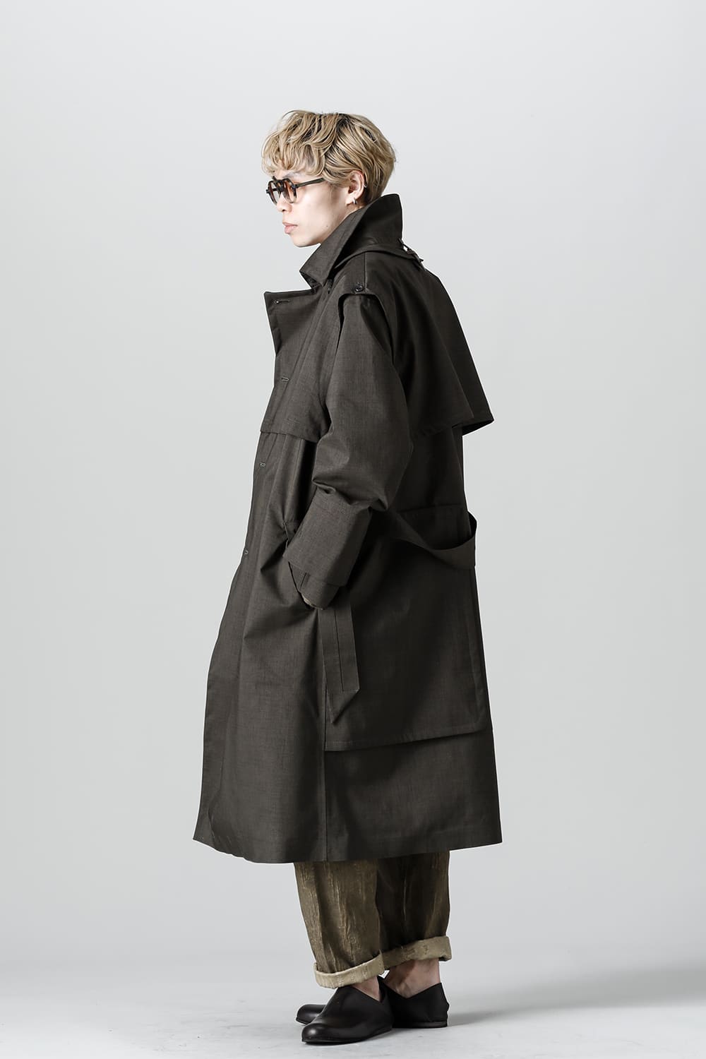 ウエストベルトを縛って着用する事で、ストームシールドとアンブレラヨークがグッと立ち上がるメリハリのあるシルエットがカッコ良い コートですが、単にデザイン的ディテールというわけではなく、肩から伝った雨の雫が身頃にかかる前に滑り落ちるアンブレラヨークの本来の役割も果たしています。