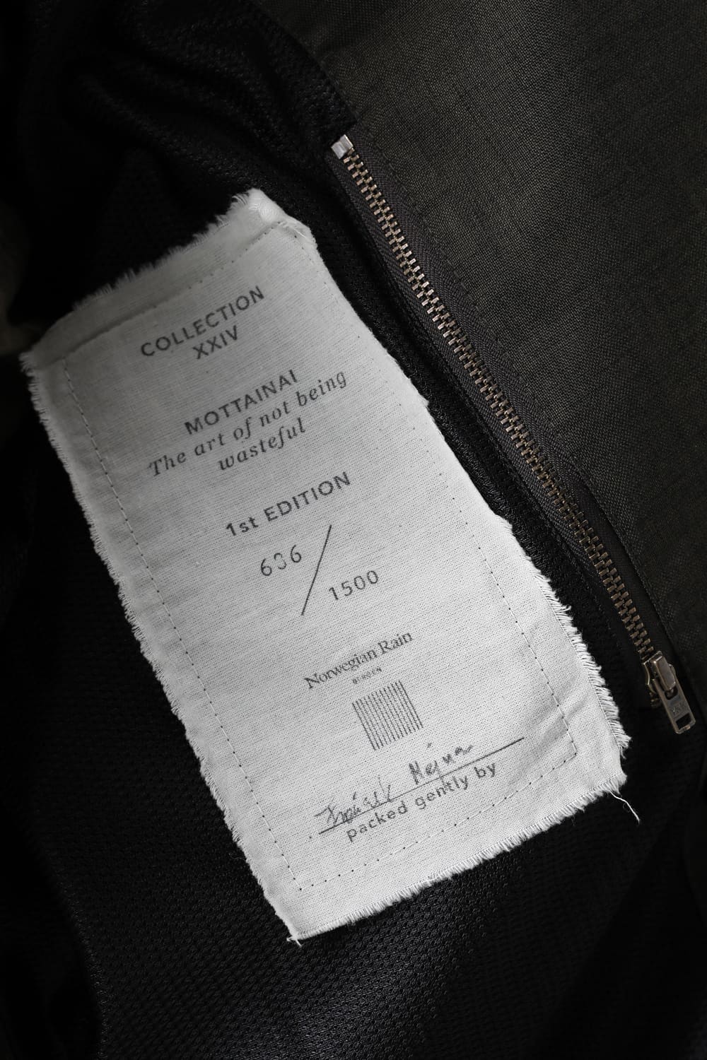 マテリアルは 繊維業界に置いて、環境、労働、消費者の観点における持続可能なサプライチェーンを経たブルーサイン認証の素材を徹底して使用しており、表地は有害物質の排出をできる限り抑えたリサイクルポリエステル素材を使用、フロントやスリーブに用いられる水牛ボタンは食肉用として認定された牛の角のみを使用するなど、徹底したサスティナビリティへの配慮もデザインされたウェアです。