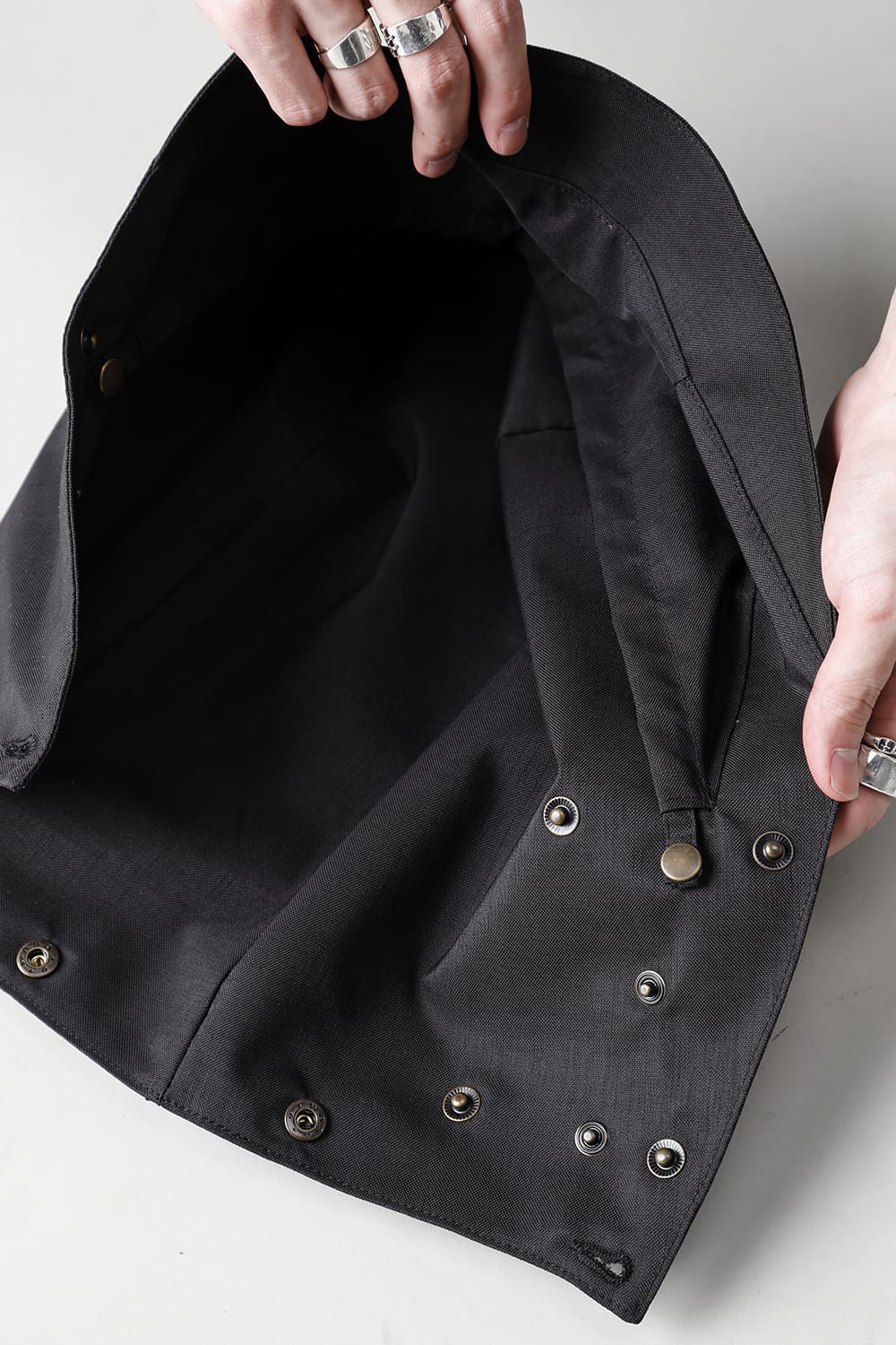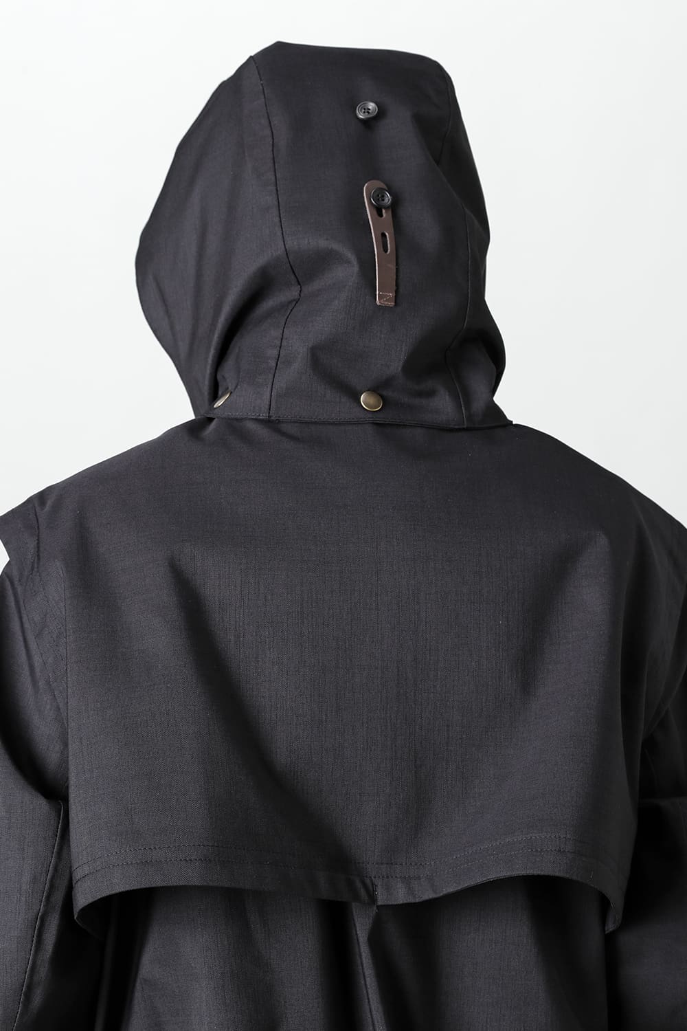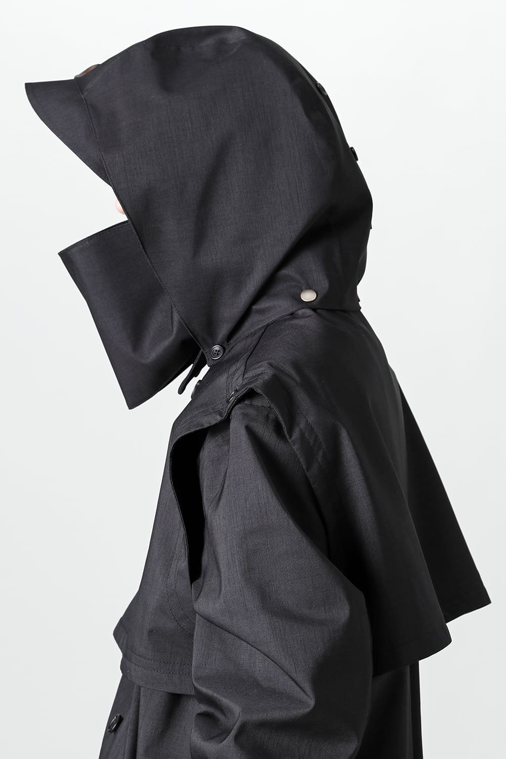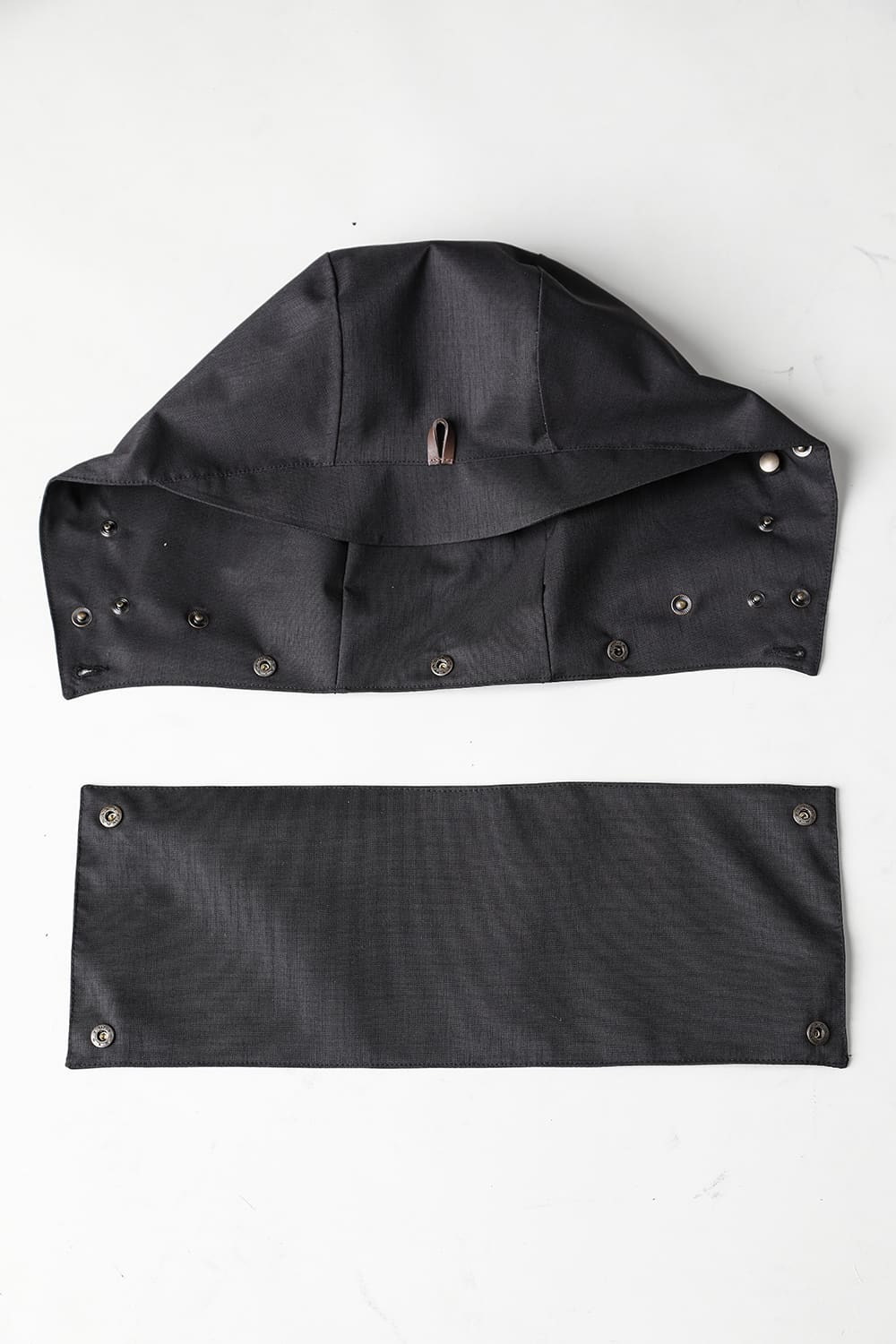 フード周りのパーツは細かく切り分けるようにスナップボタンで簡単に着脱が可能、またRaincho同様にフード内部やフードの深さをサイズ調整する事ができます。