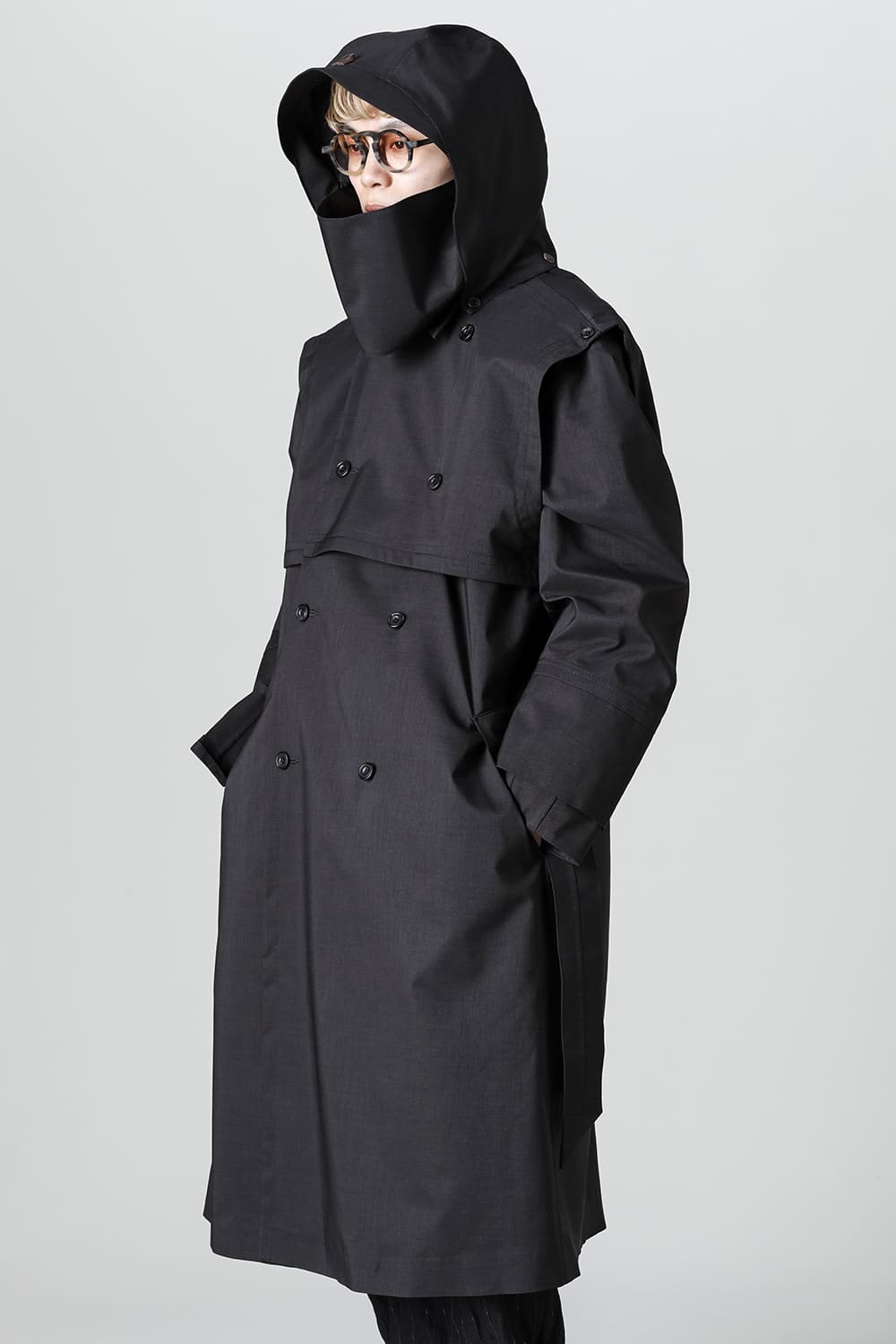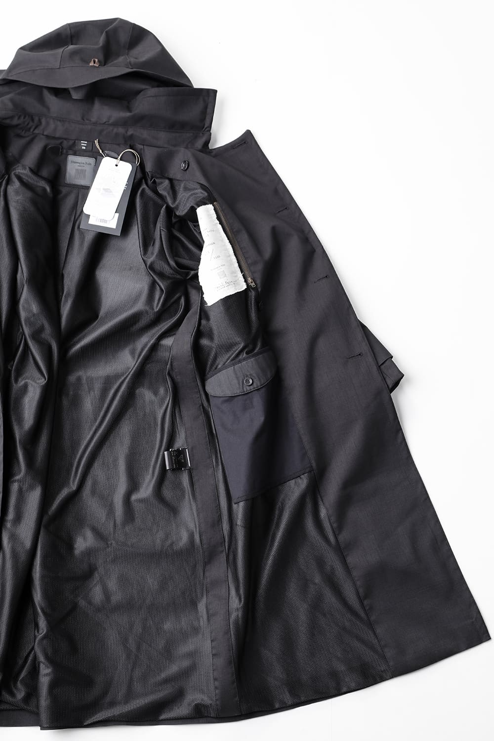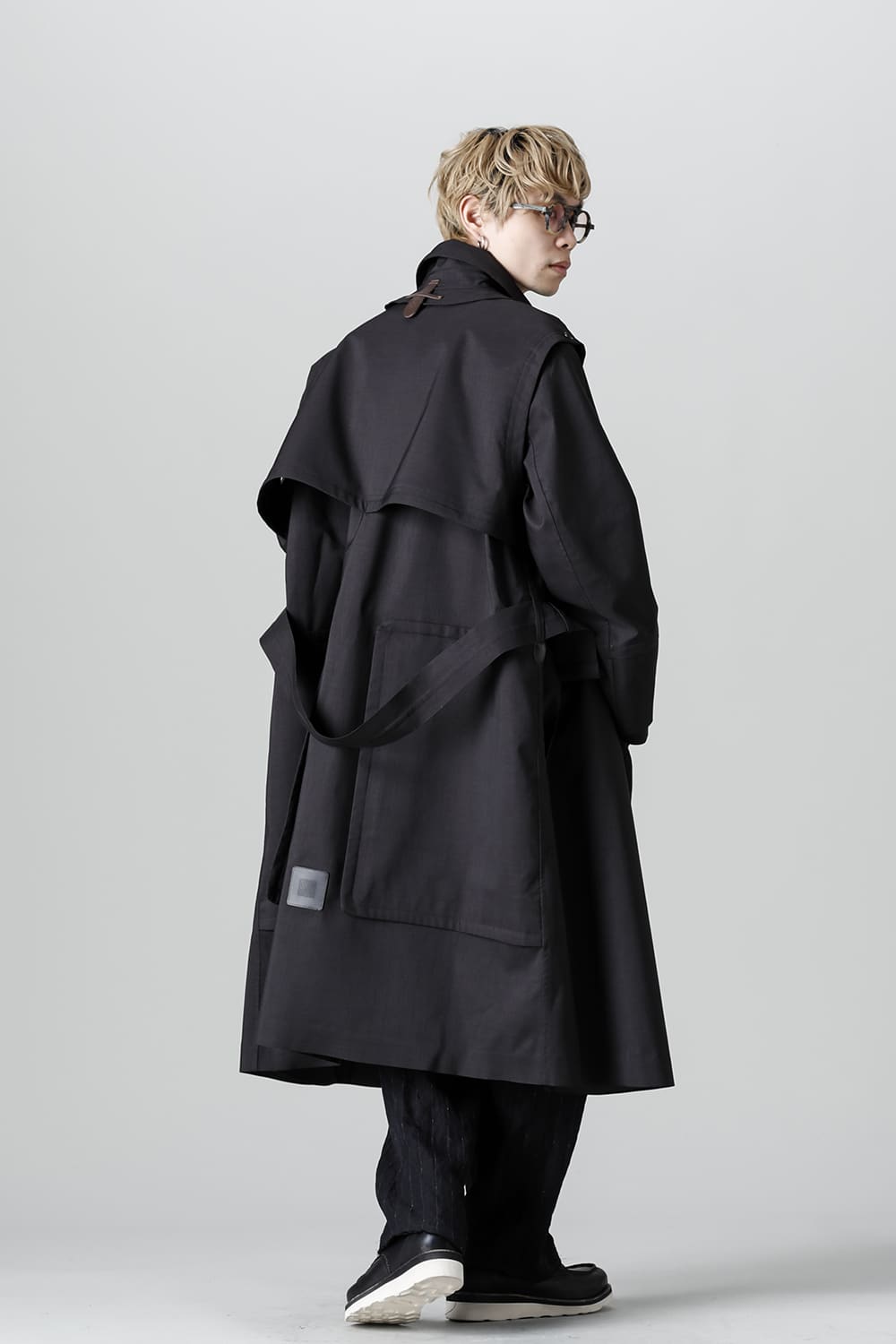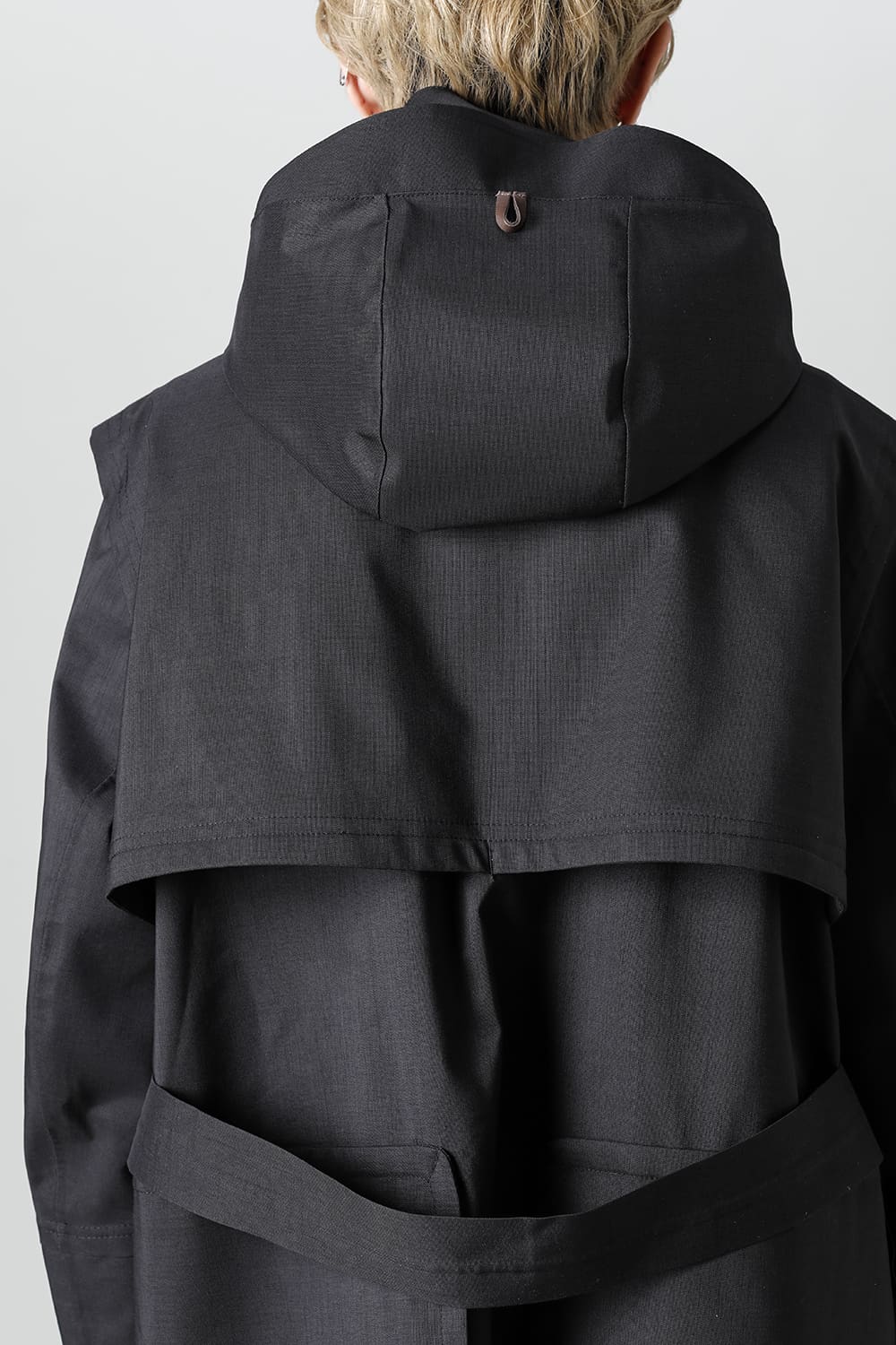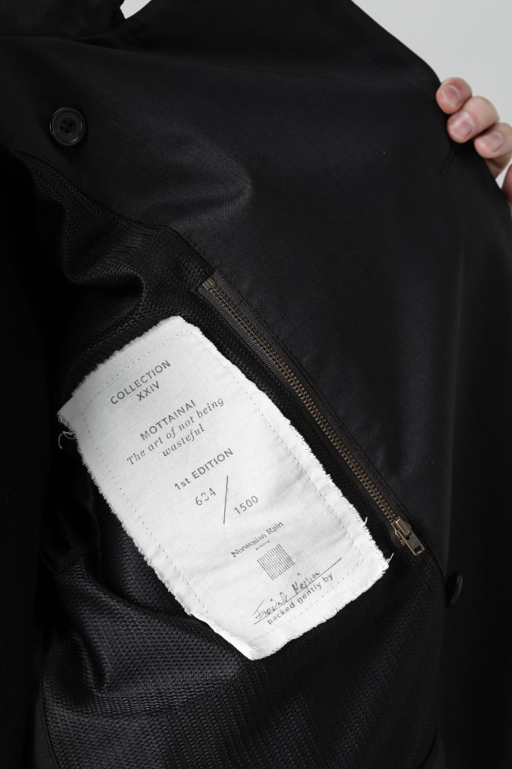 イギリスが発祥であるトレンチコートをNorwegian Rainの視点から再解釈しブラッシュアップされたこちらのコートは、胸元のストームシールドと背面のアンブレラヨークが一体となったベスト状の2レイヤーギミックが特徴。