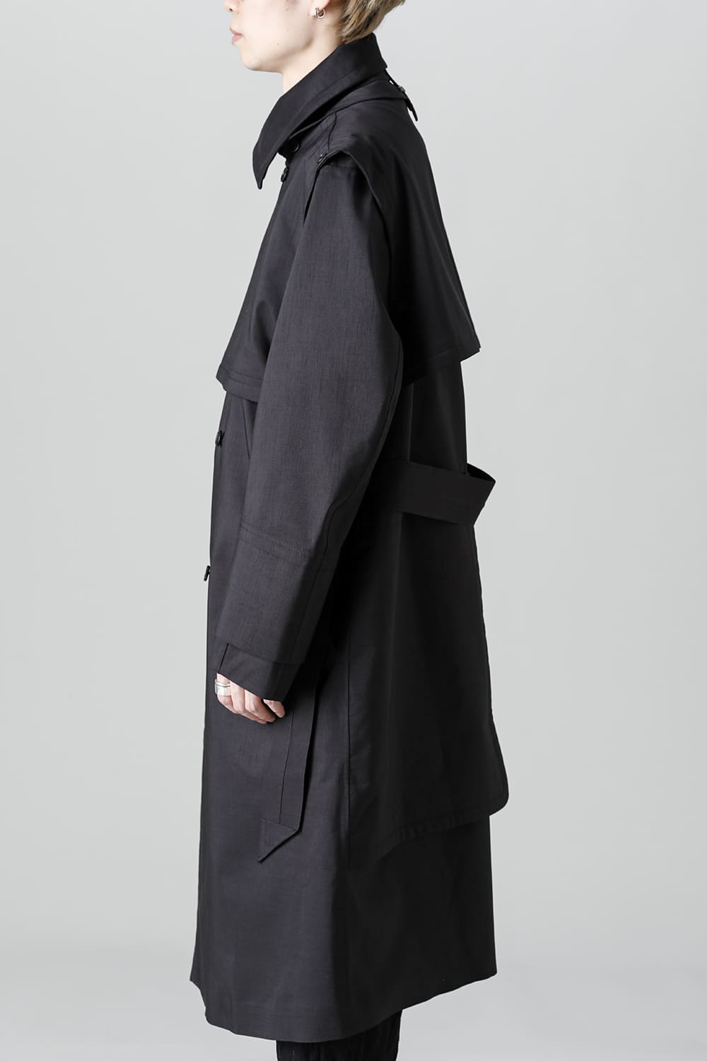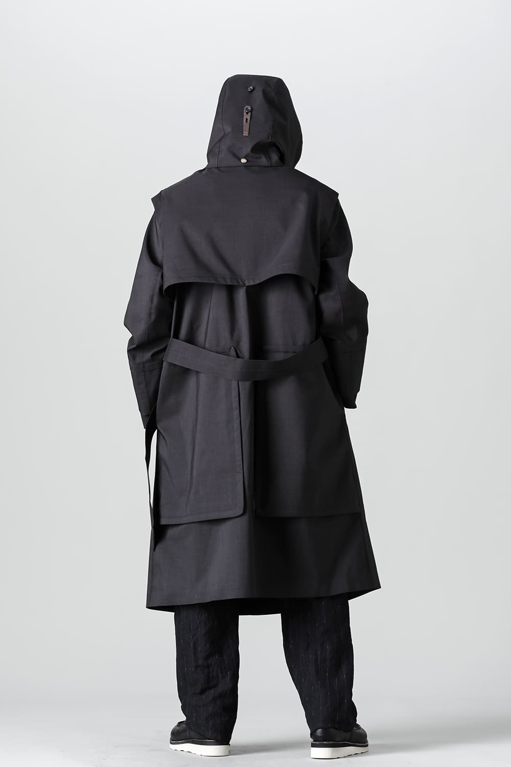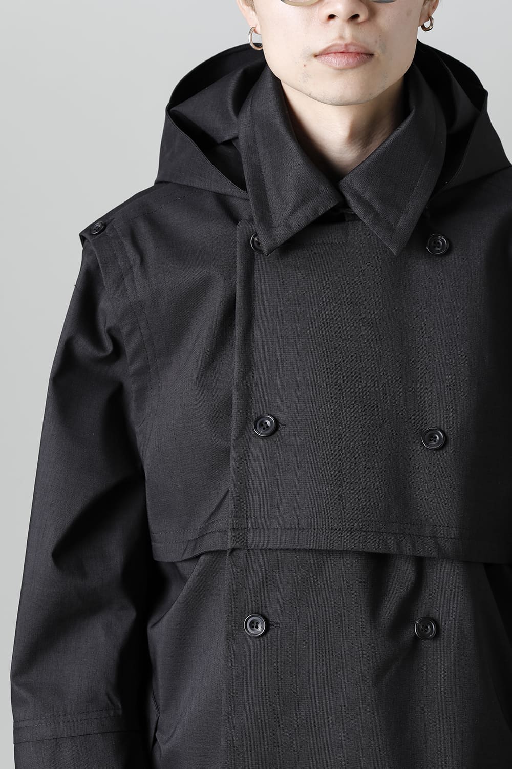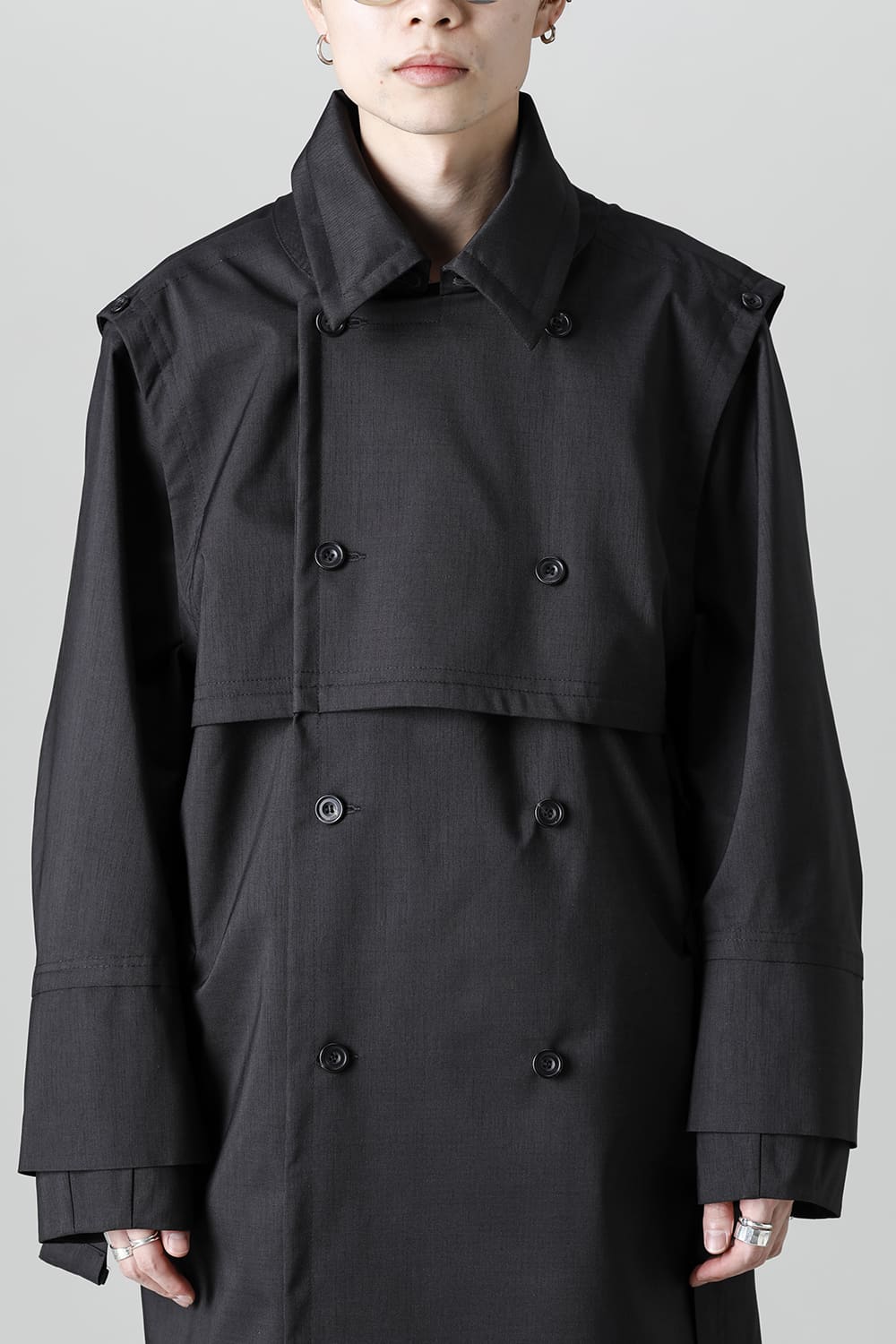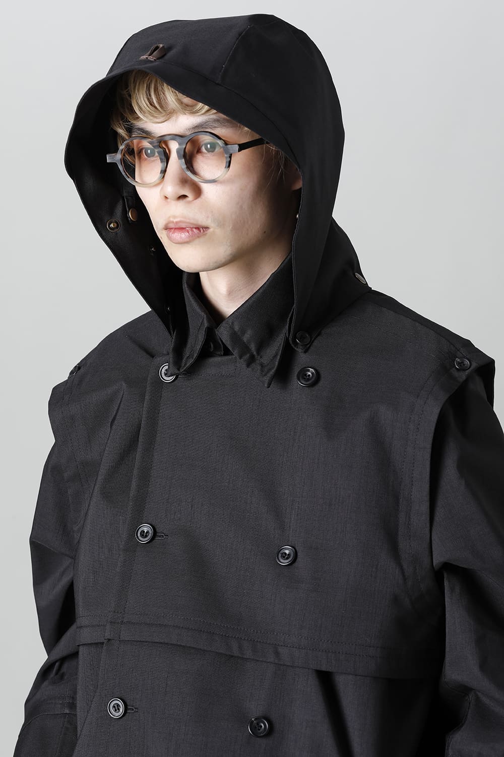 イギリスが発祥であるトレンチコートをNorwegian Rainの視点から再解釈しブラッシュアップされたこちらのコートは、胸元のストームシールドと背面のアンブレラヨークが一体となったベスト状の2レイヤーギミックが特徴。