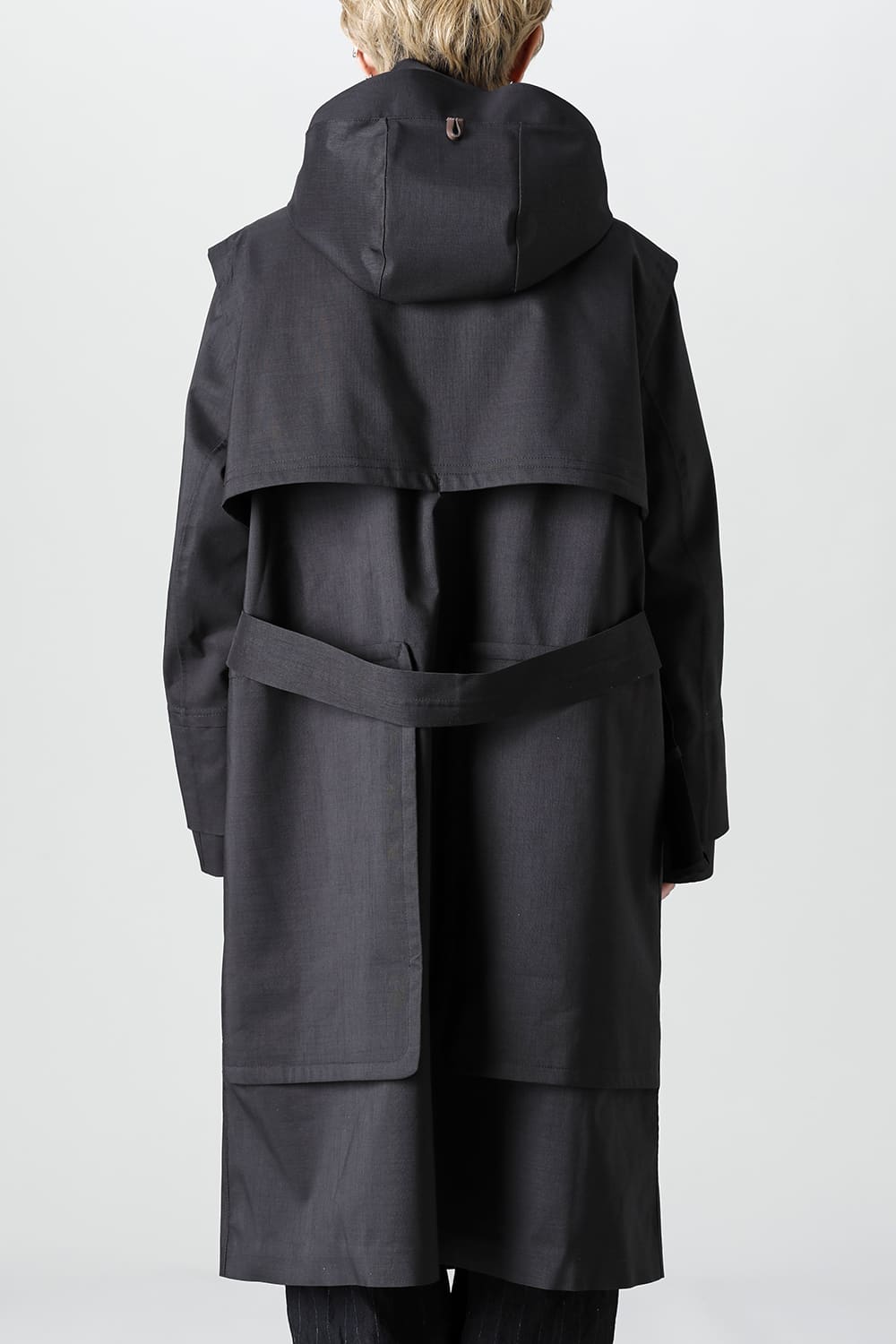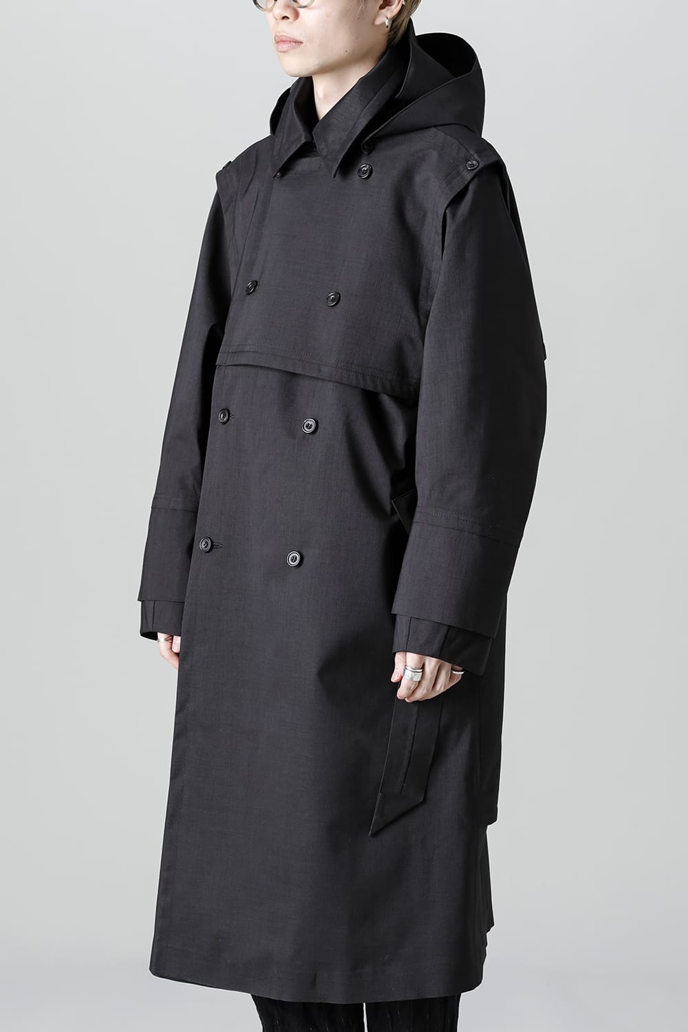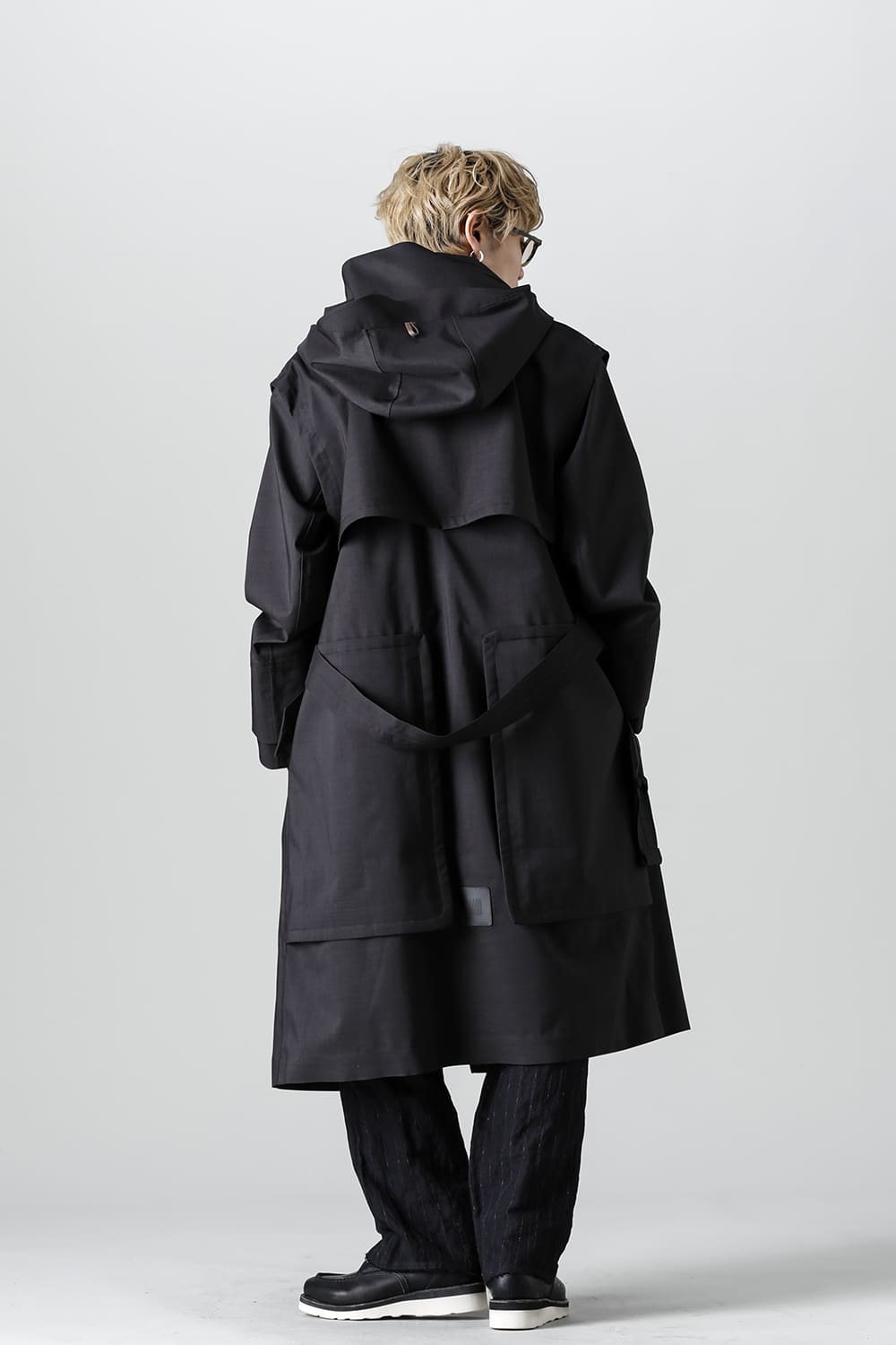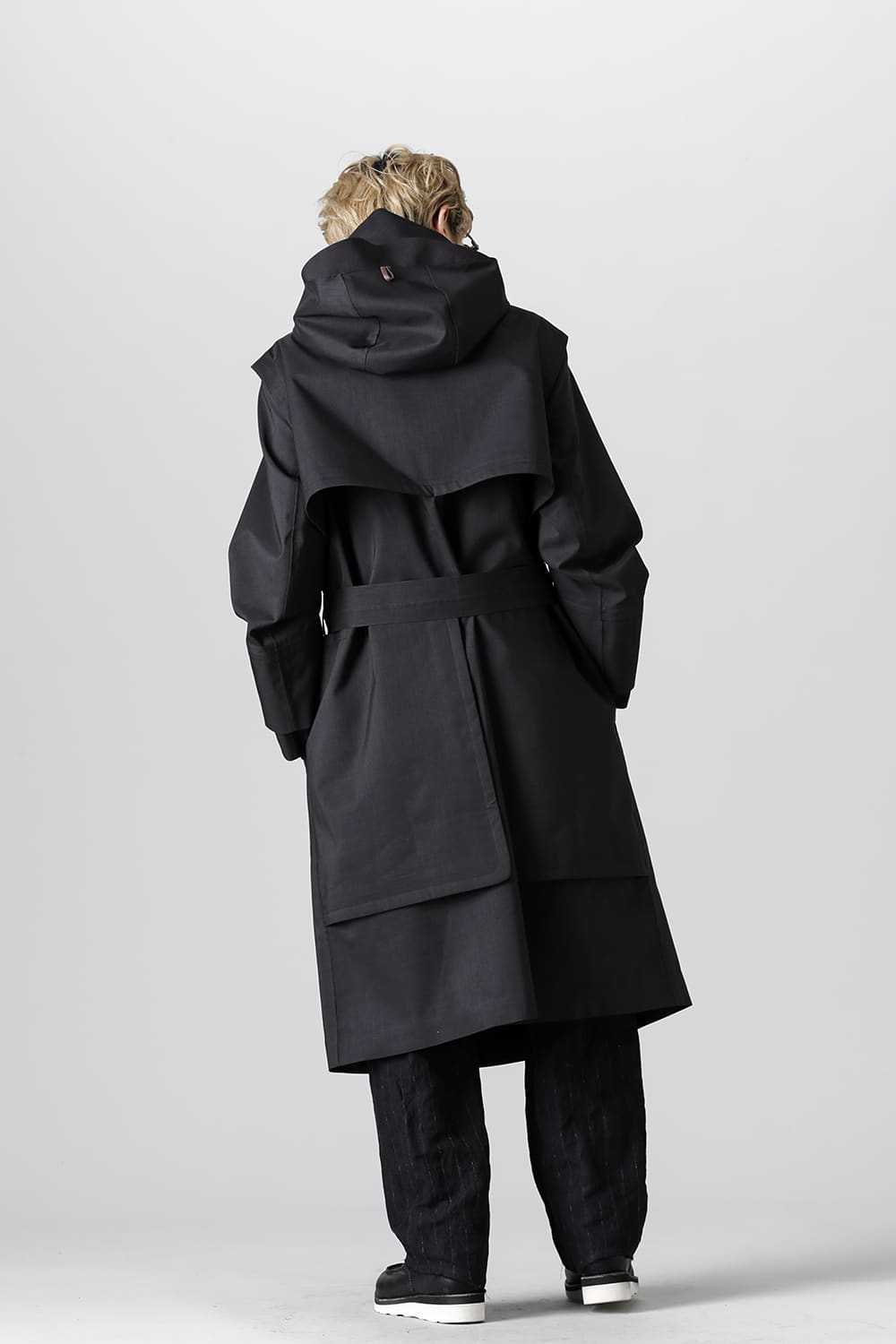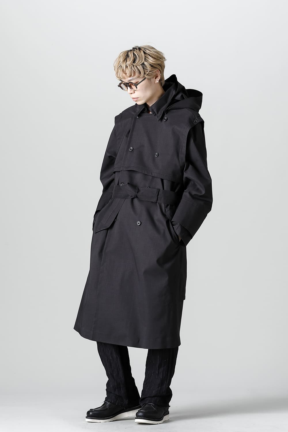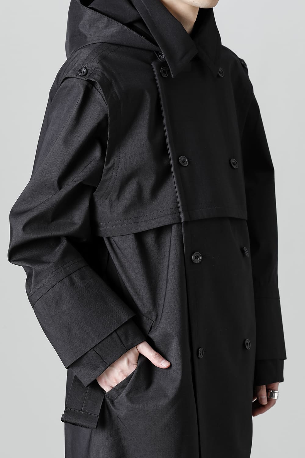 イギリスが発祥であるトレンチコートをNorwegian Rainの視点から再解釈しブラッシュアップされたこちらのコートは、胸元のストームシールドと背面のアンブレラヨークが一体となったベスト状の2レイヤーギミックが特徴。
