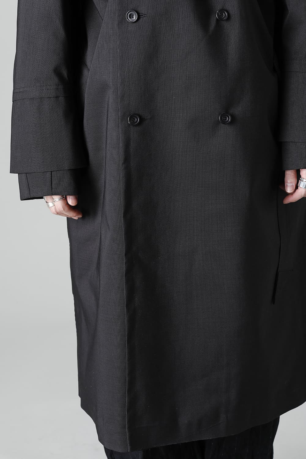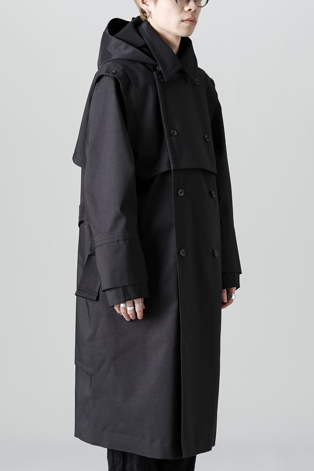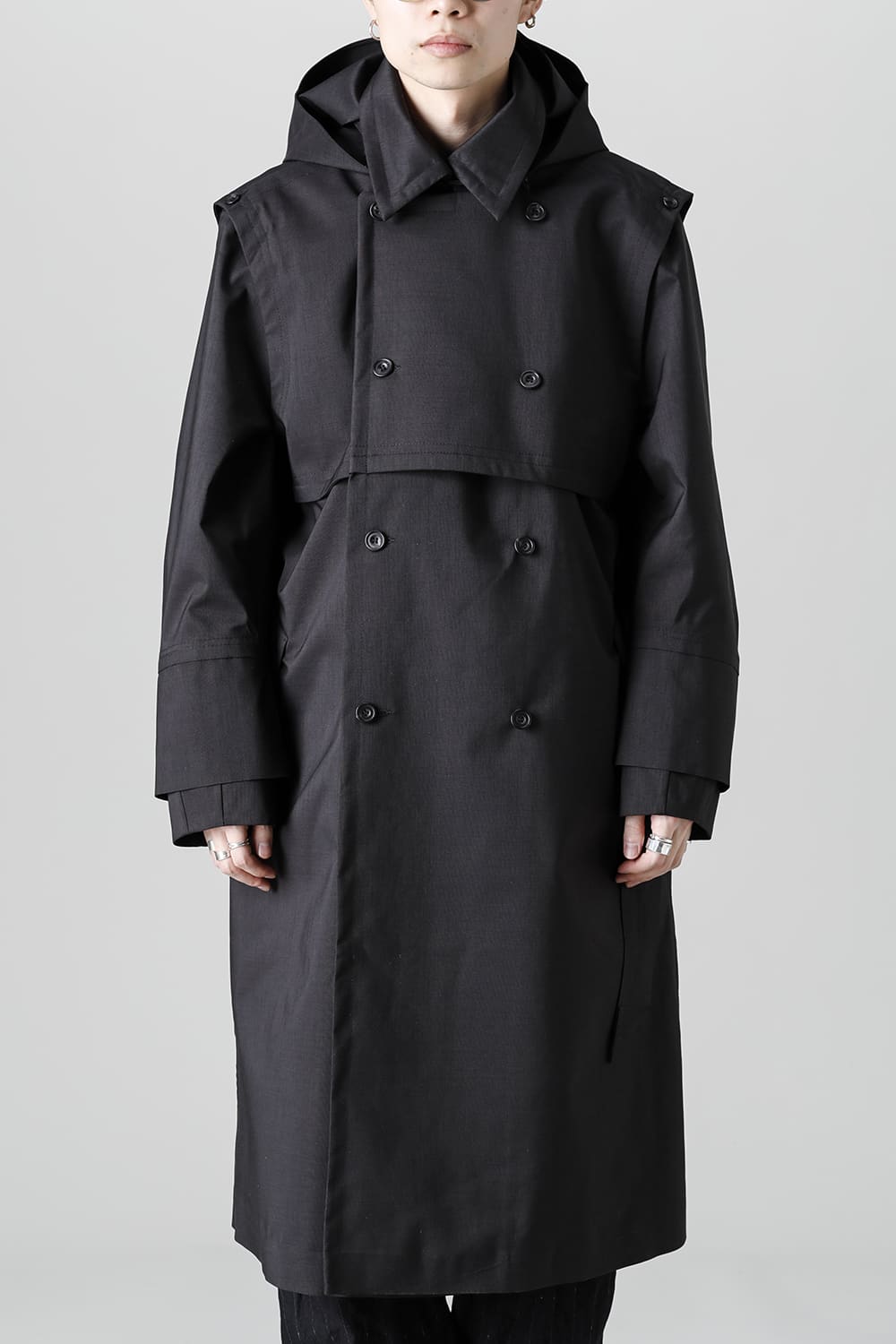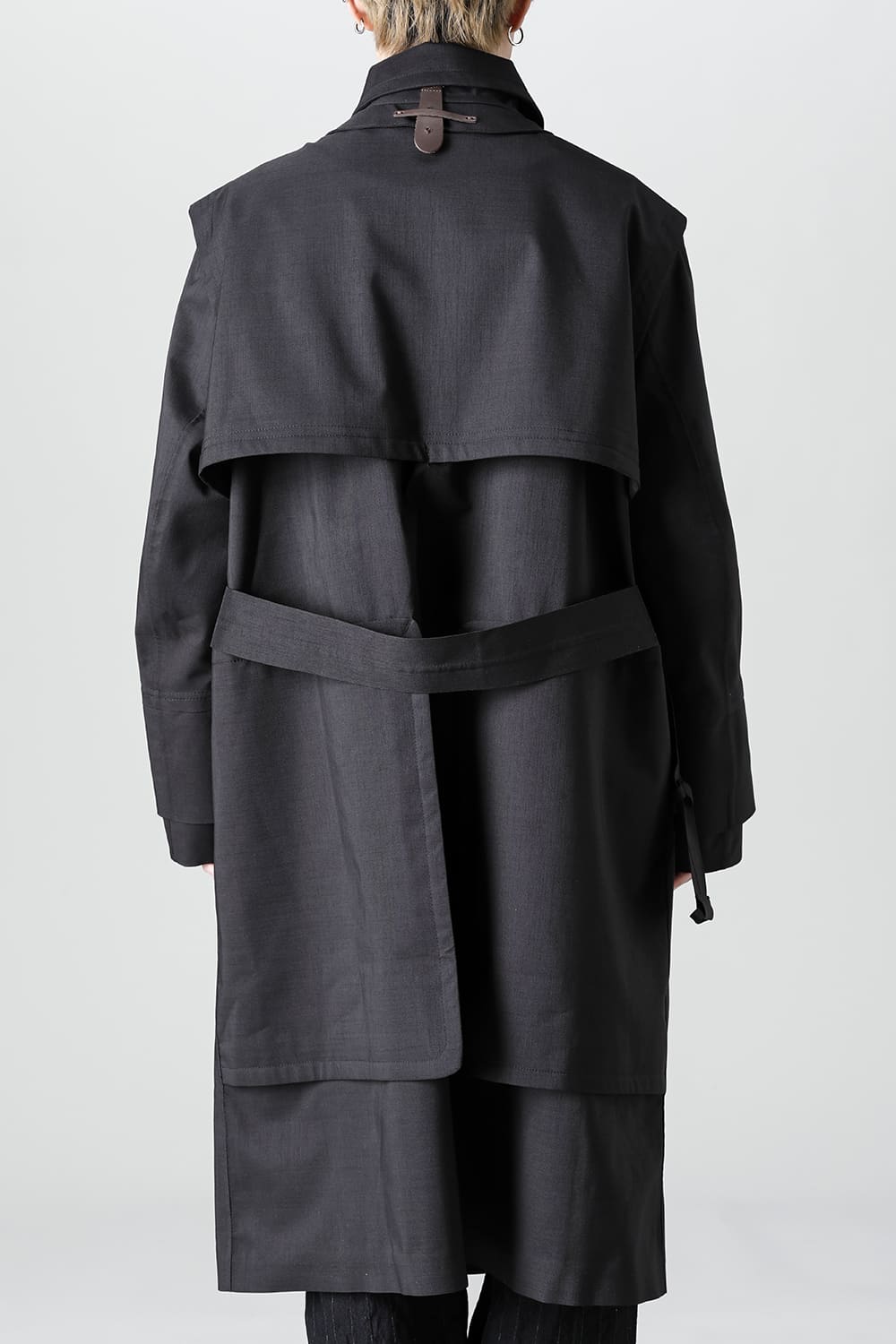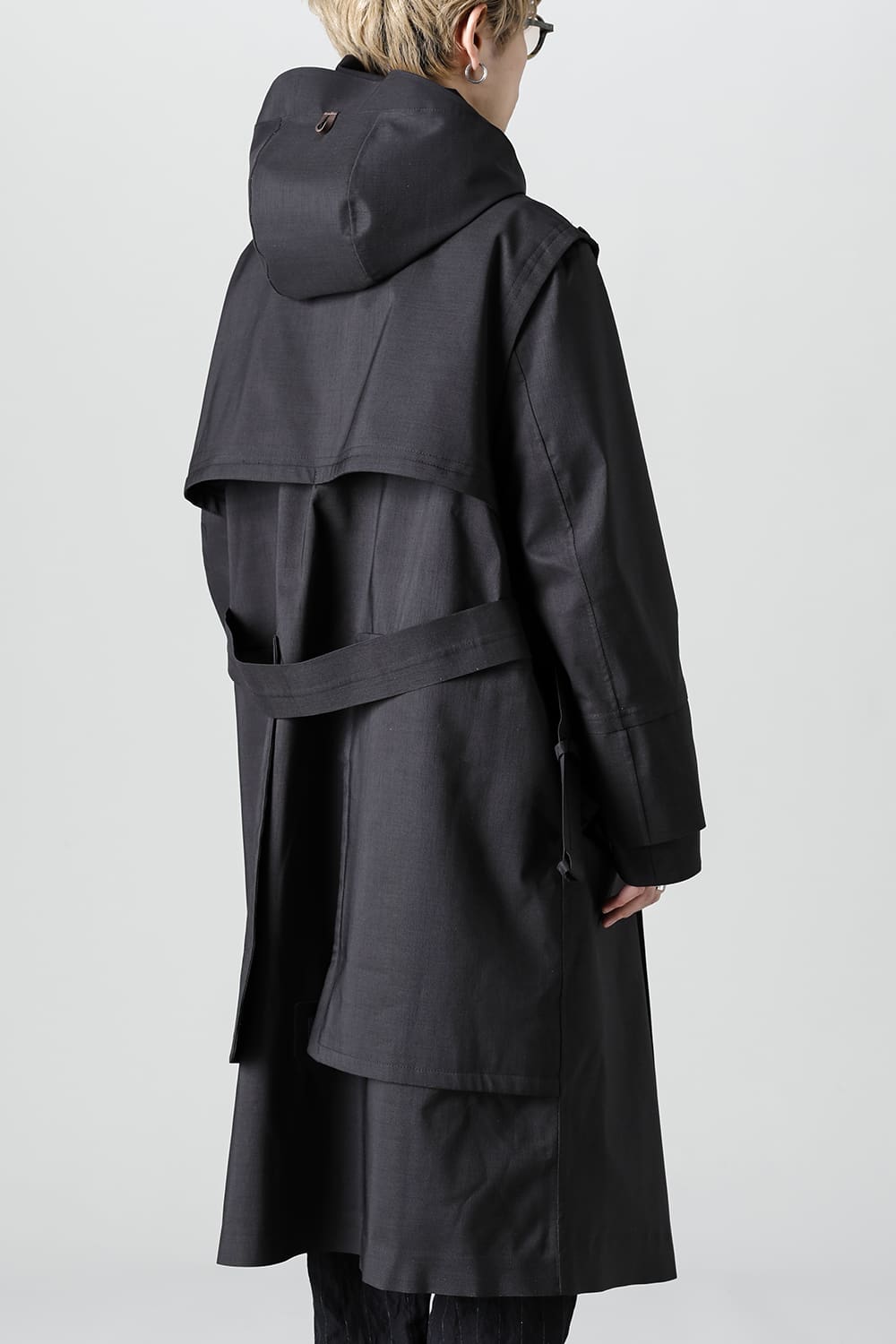 イギリスが発祥であるトレンチコートをNorwegian Rainの視点から再解釈しブラッシュアップされたこちらのコートは、胸元のストームシールドと背面のアンブレラヨークが一体となったベスト状の2レイヤーギミックが特徴。