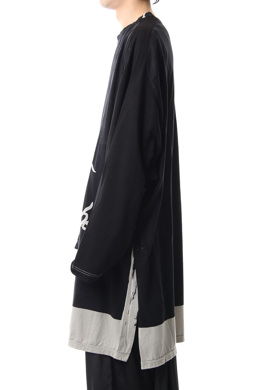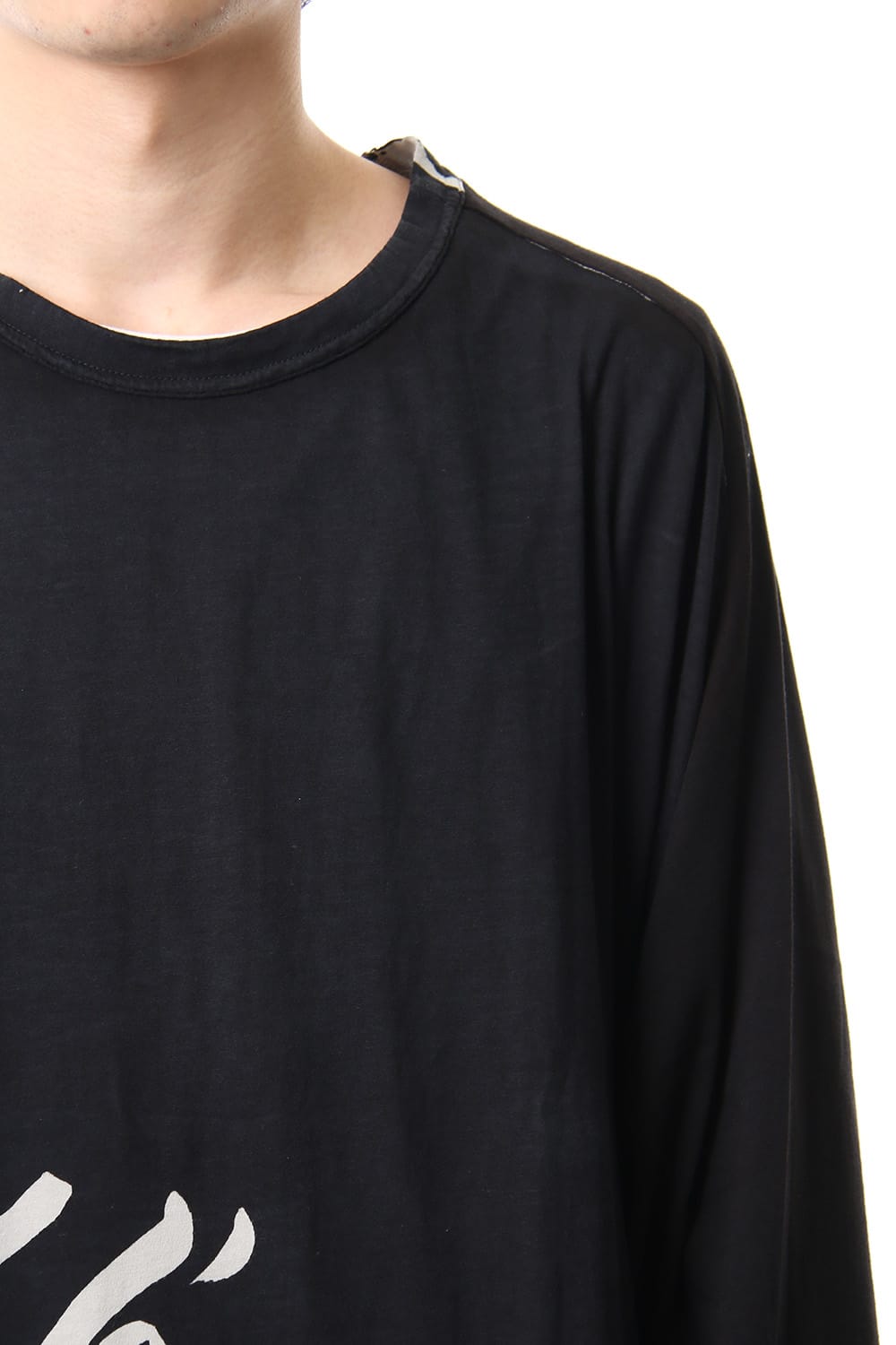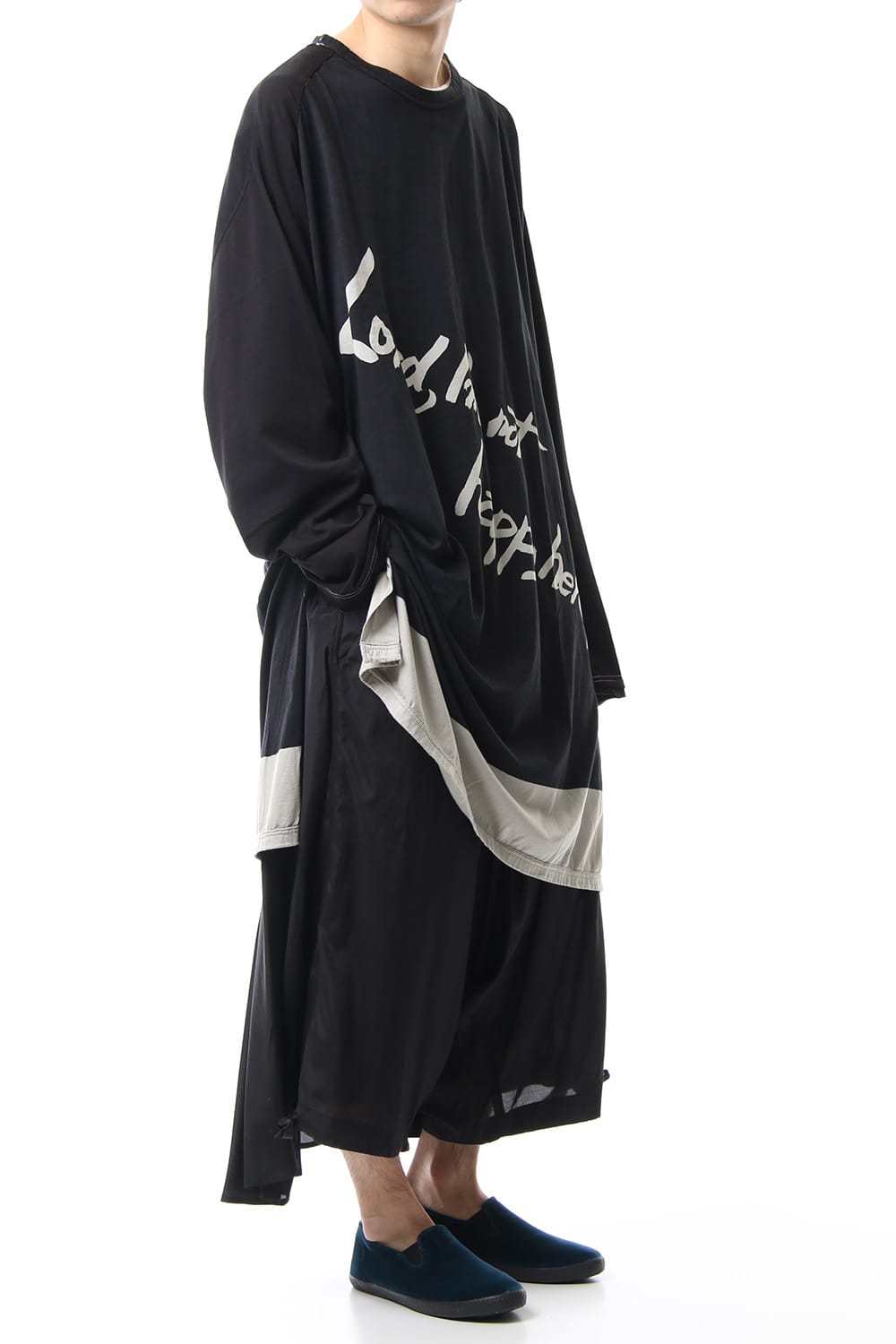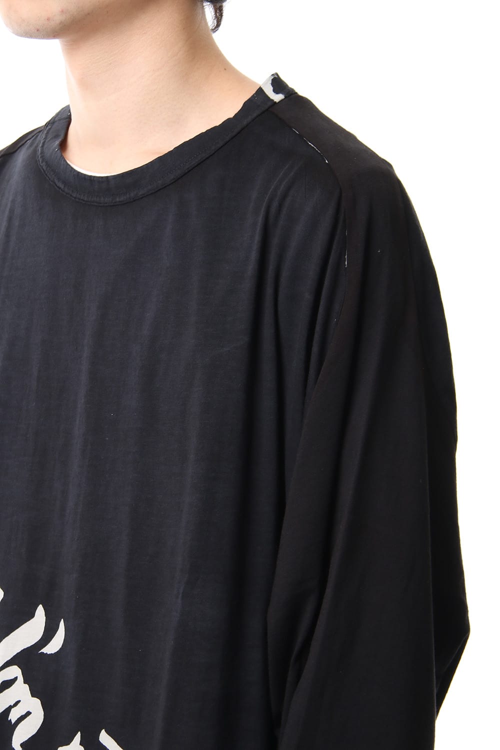 フロントに「Lord, I`m not happy here」のメッセージプリントが施されたロングスリーブのビックTシャツ。白のベースにネイビーのプリントを施し、Tシャツを2枚重ねたかのようなレイヤード風プリントとなっており、ラグランスリーブとなった袖はさらに濃い色味のネイビーカラーへ切り替わっています。