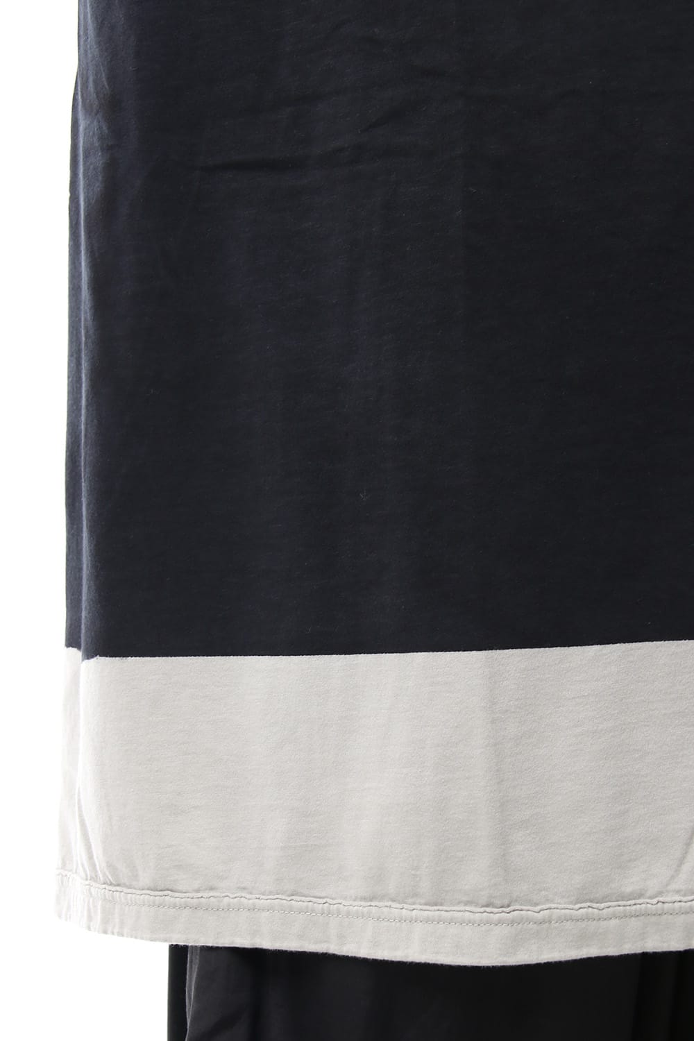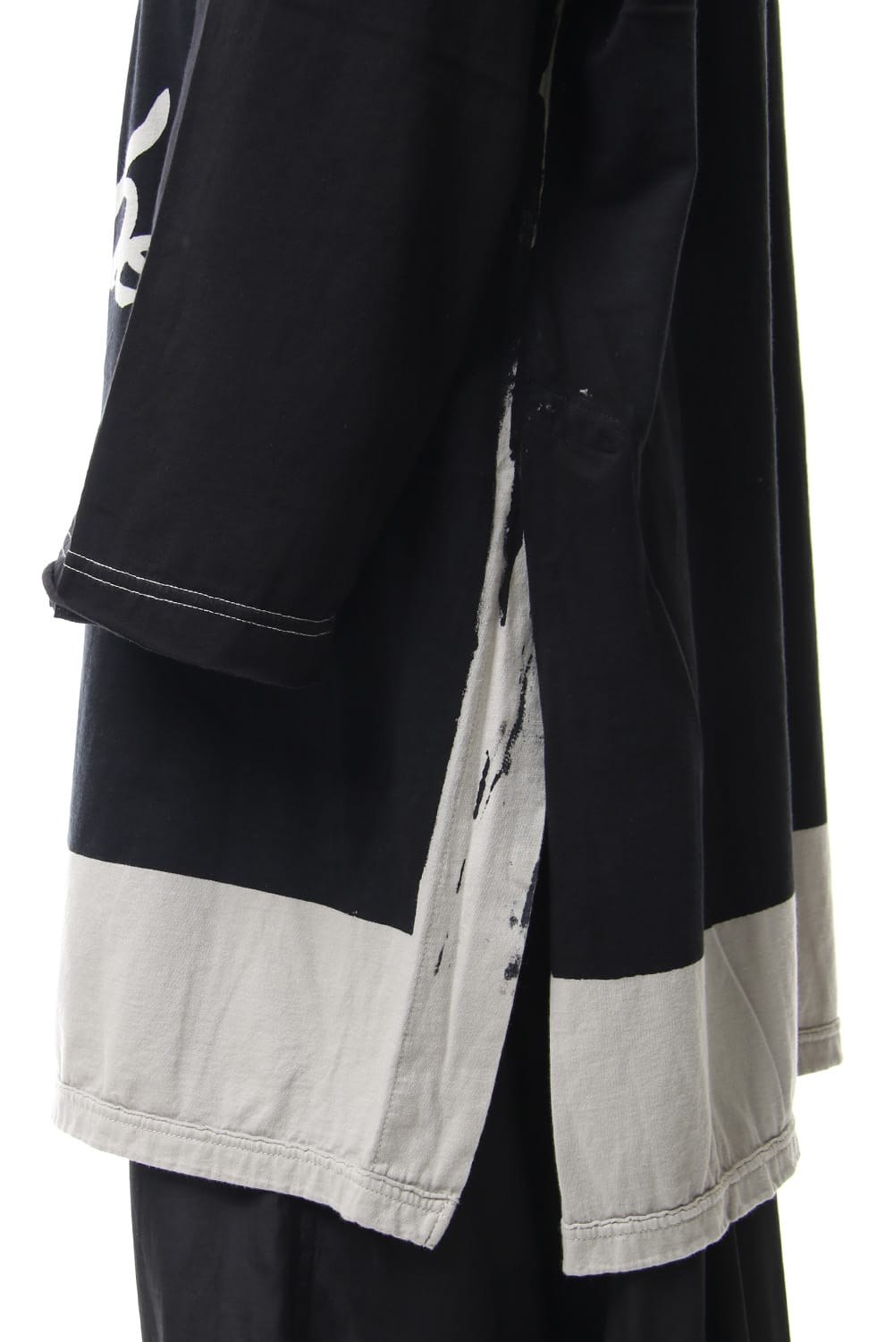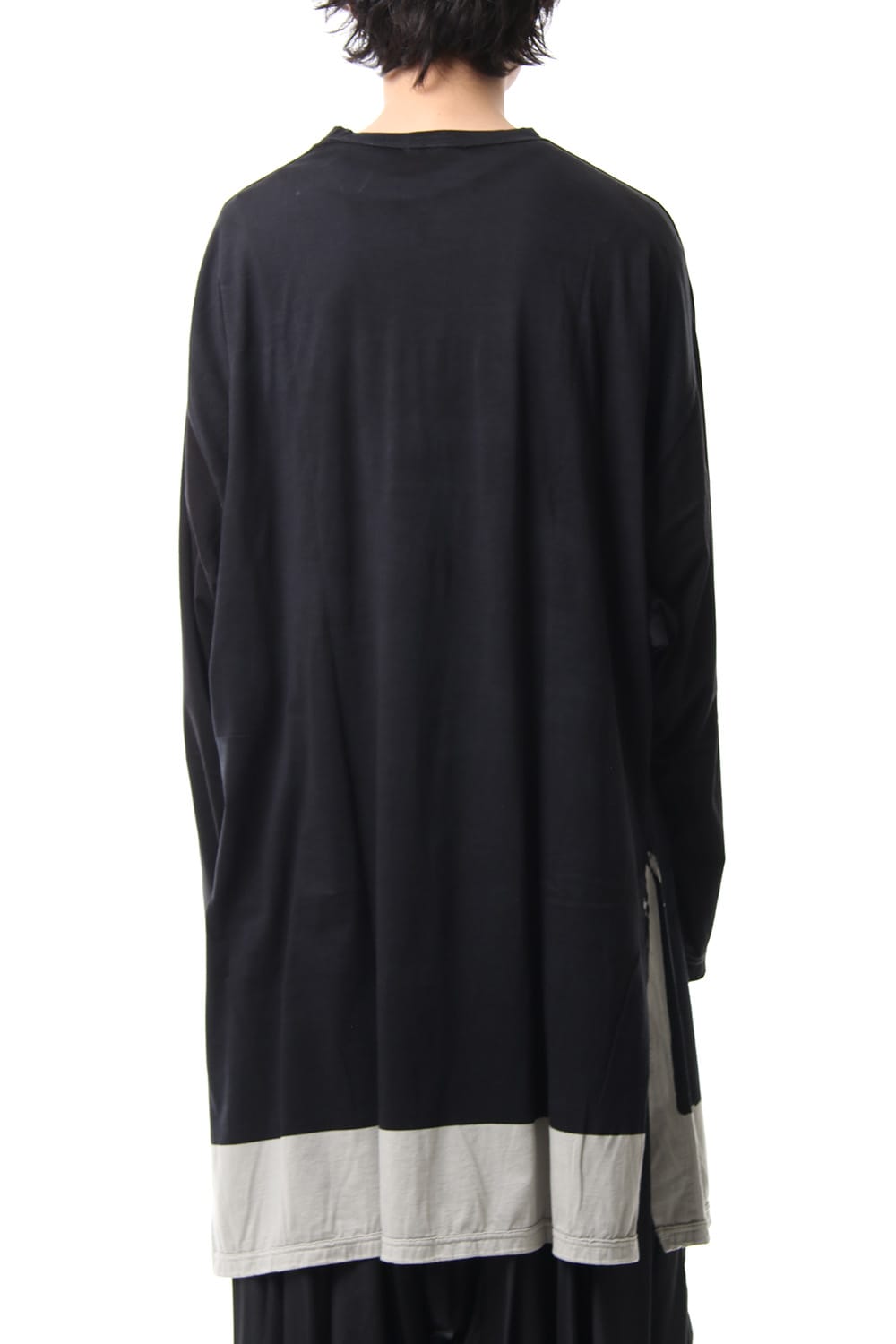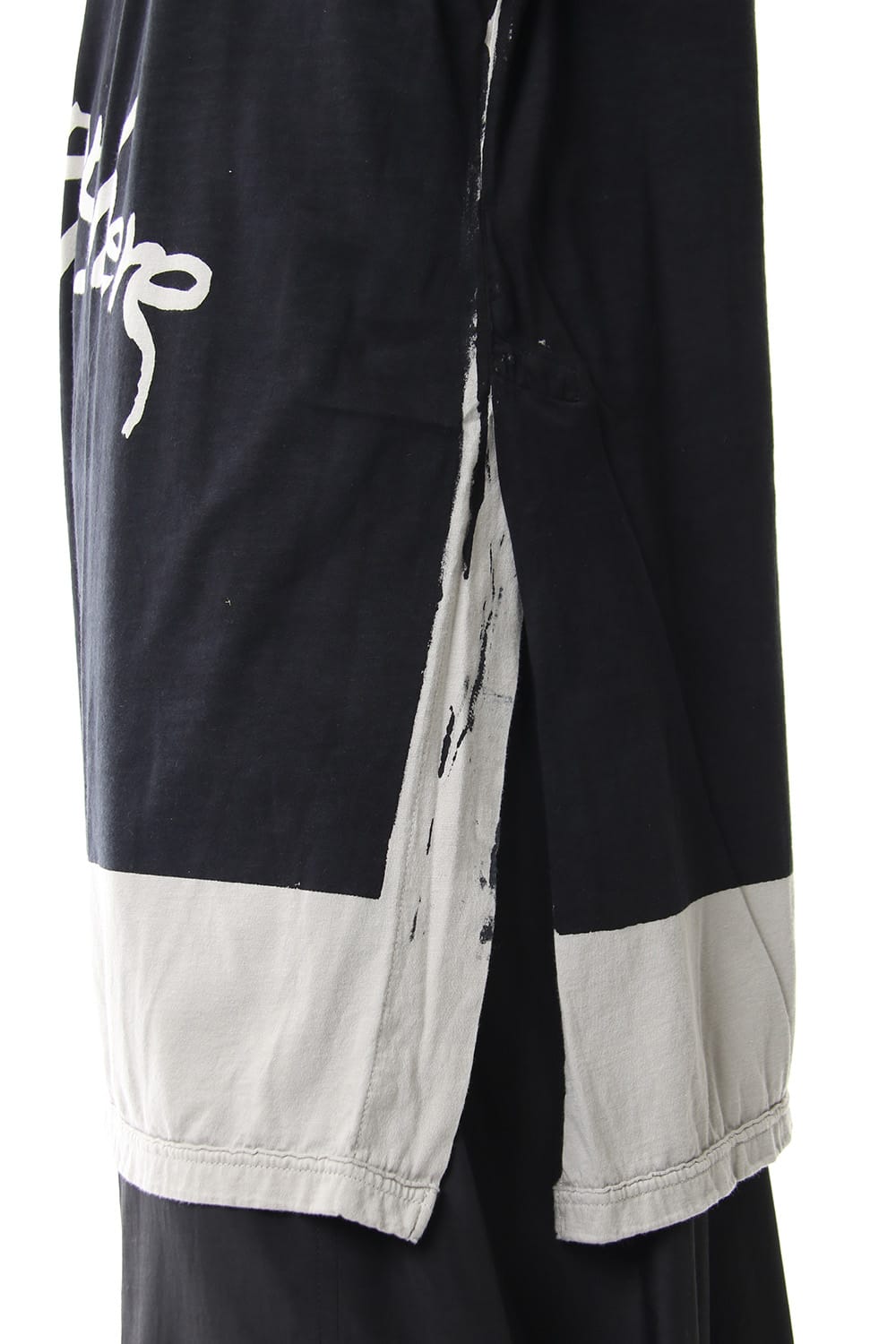 フロントに「Lord, I`m not happy here」のメッセージプリントが施されたロングスリーブのビックTシャツ。白のベースにネイビーのプリントを施し、Tシャツを2枚重ねたかのようなレイヤード風プリントとなっており、ラグランスリーブとなった袖はさらに濃い色味のネイビーカラーへ切り替わっています。