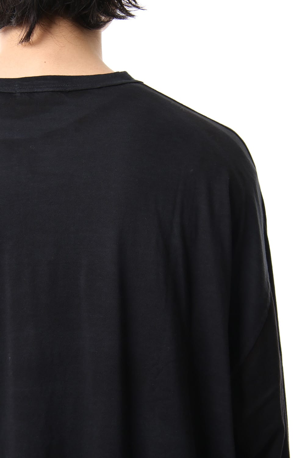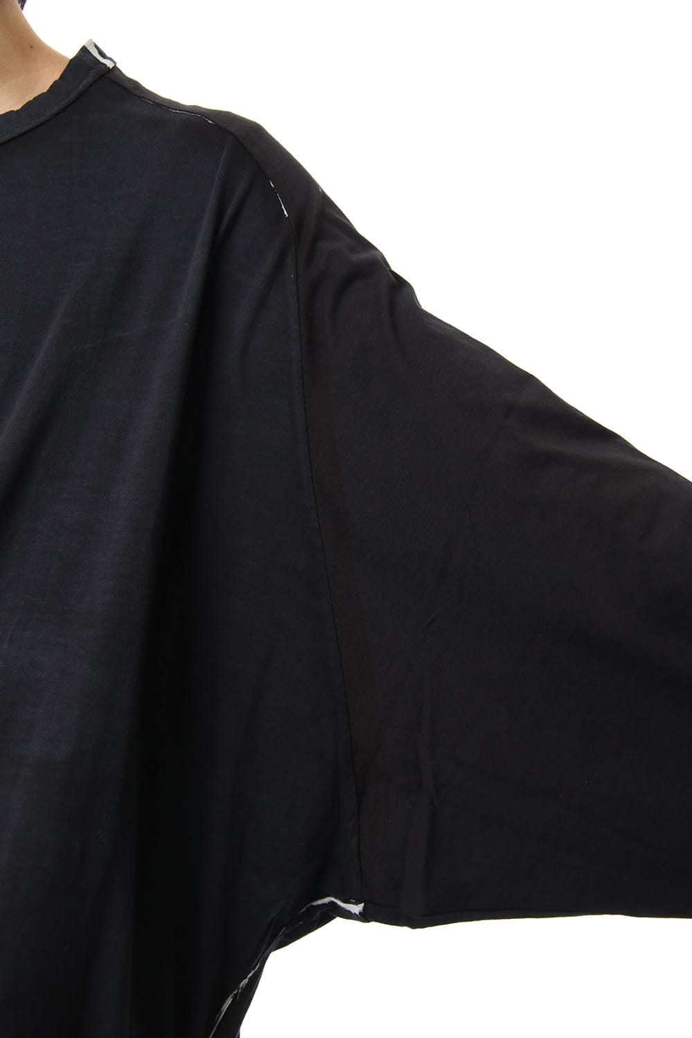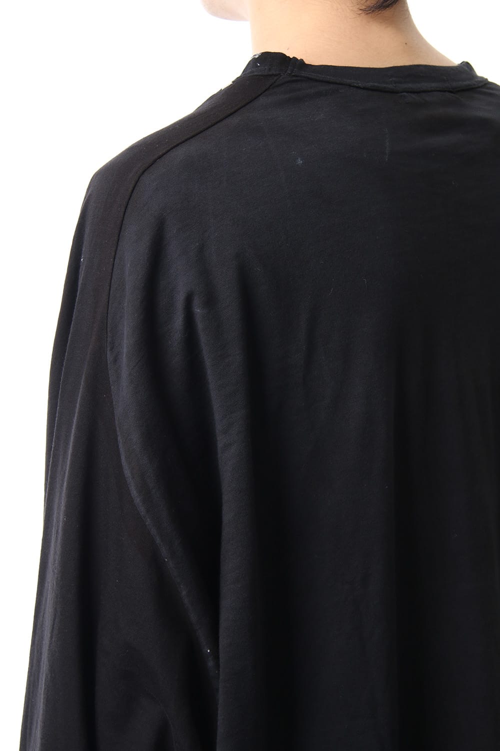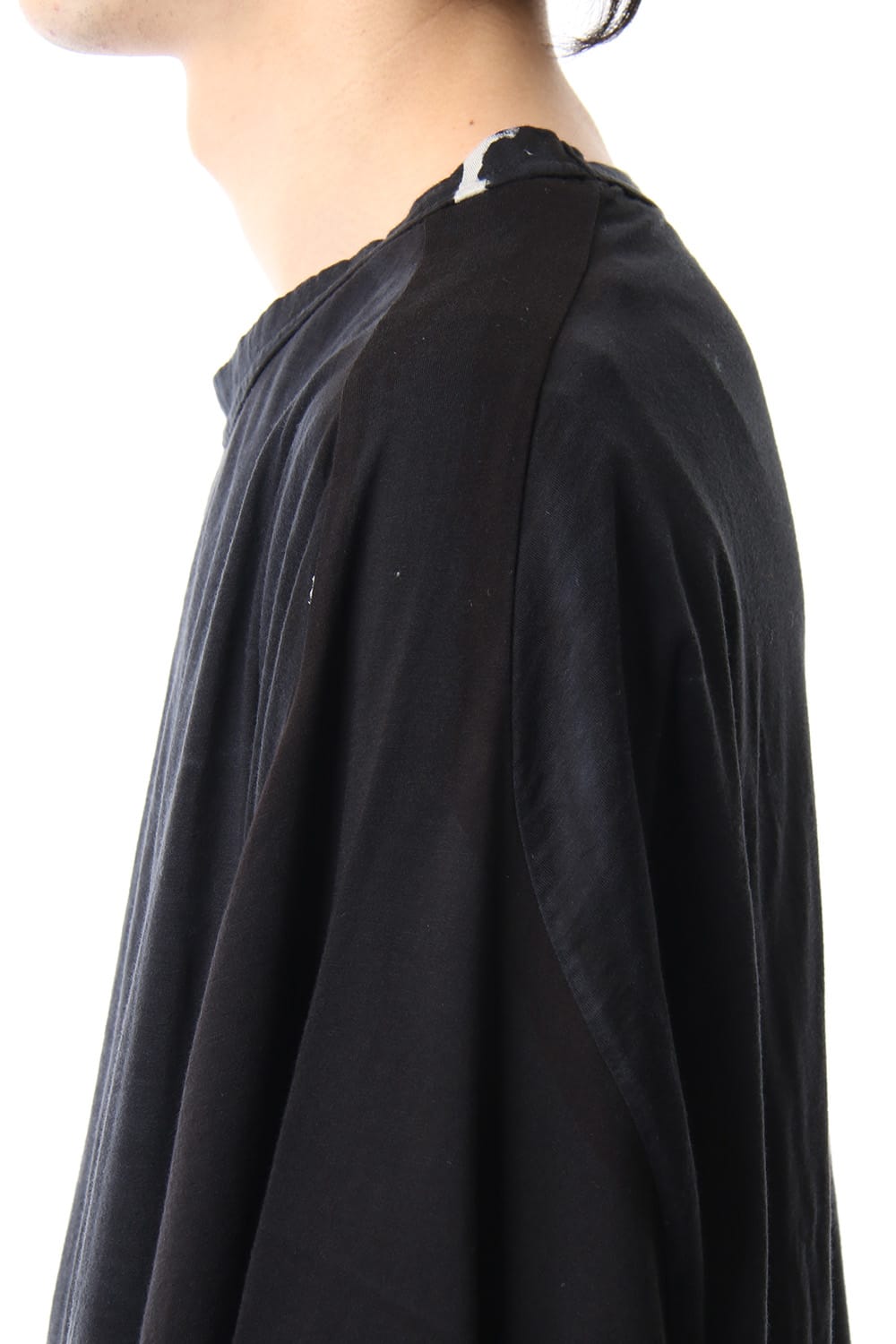 フロントに「Lord, I`m not happy here」のメッセージプリントが施されたロングスリーブのビックTシャツ。白のベースにネイビーのプリントを施し、Tシャツを2枚重ねたかのようなレイヤード風プリントとなっており、ラグランスリーブとなった袖はさらに濃い色味のネイビーカラーへ切り替わっています。