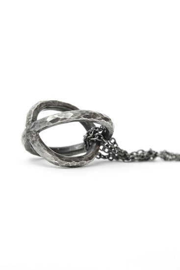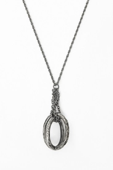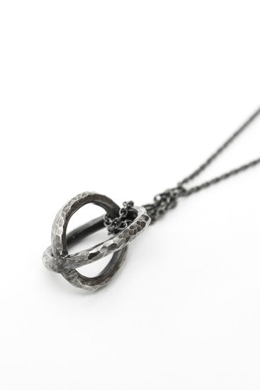 叩き加工をした大小のリングを組み合わせてオーブ型に成形したトップをシャンデリアの様にチェーンで吊り込み、ネックレスチェーン部分とを合わせたネックレス。無骨な存在感があります。